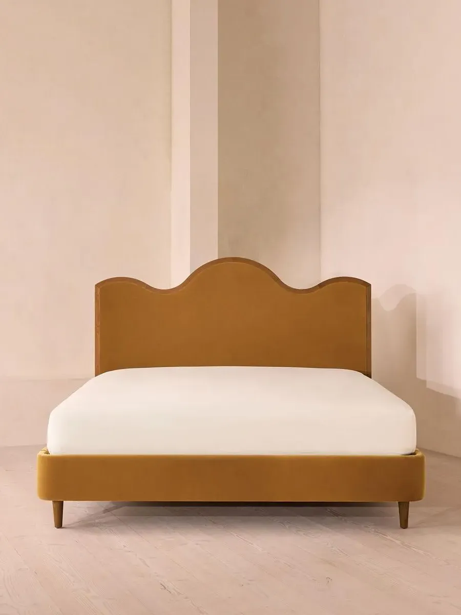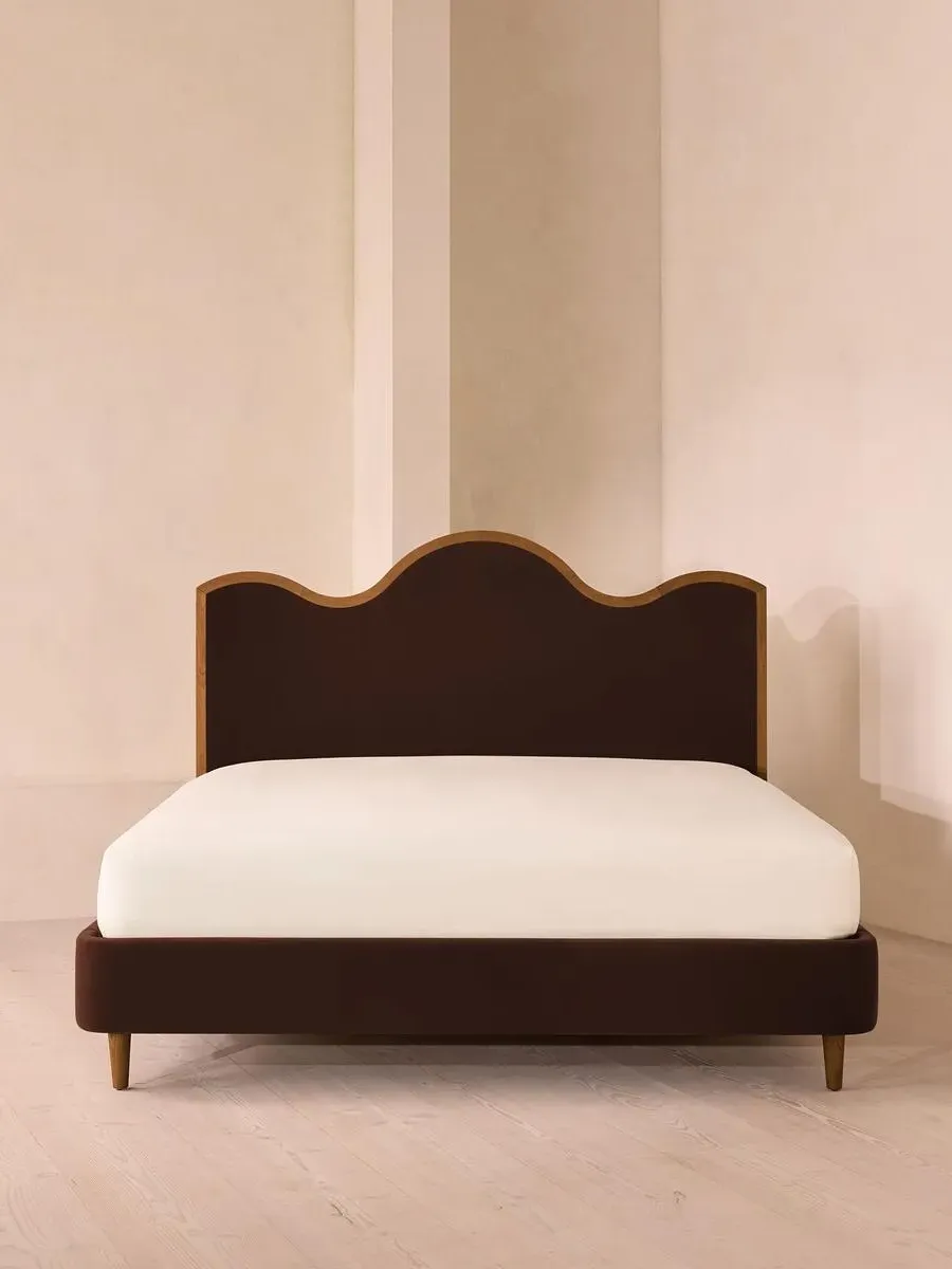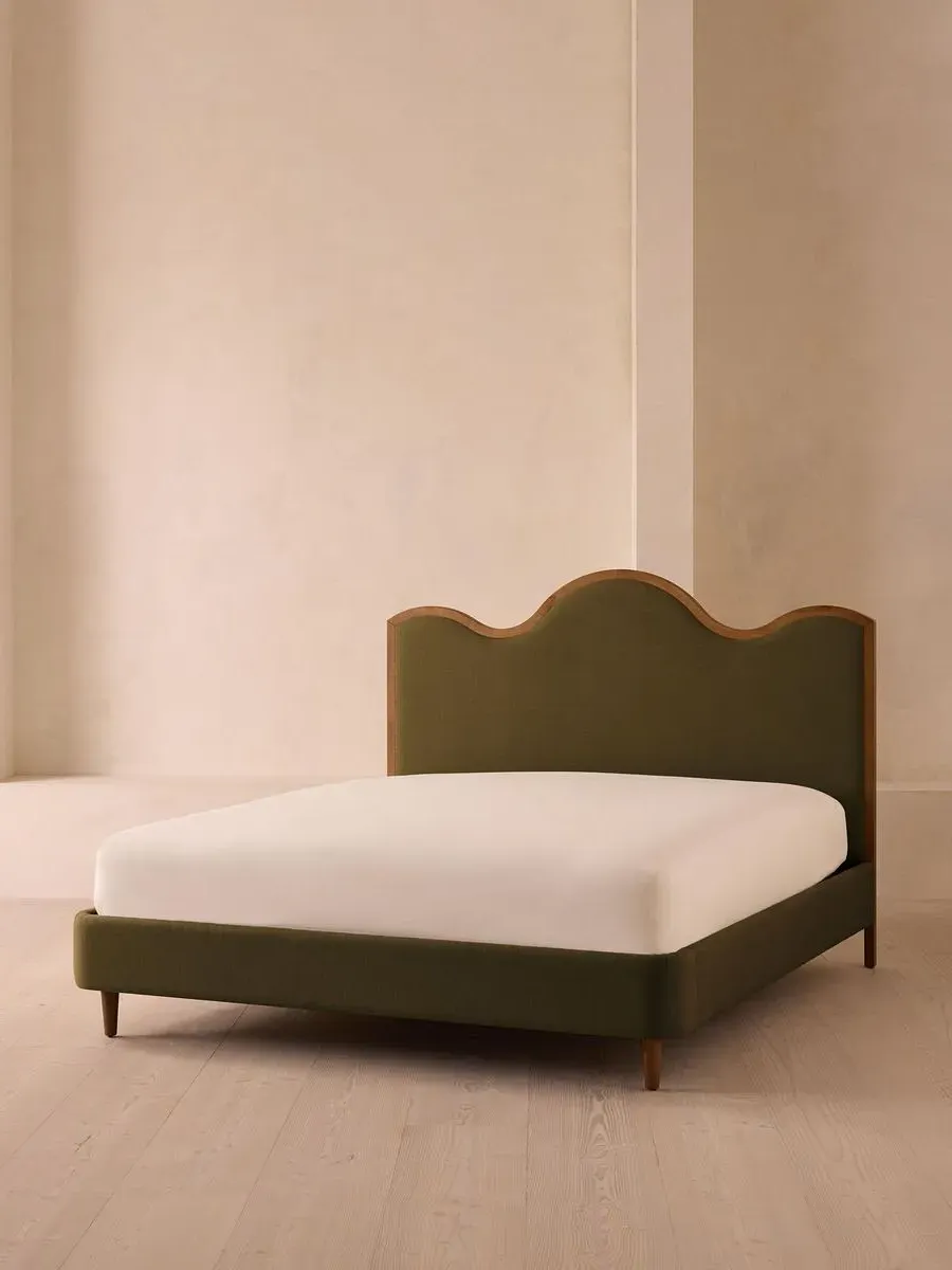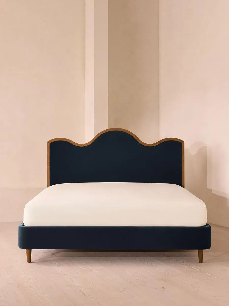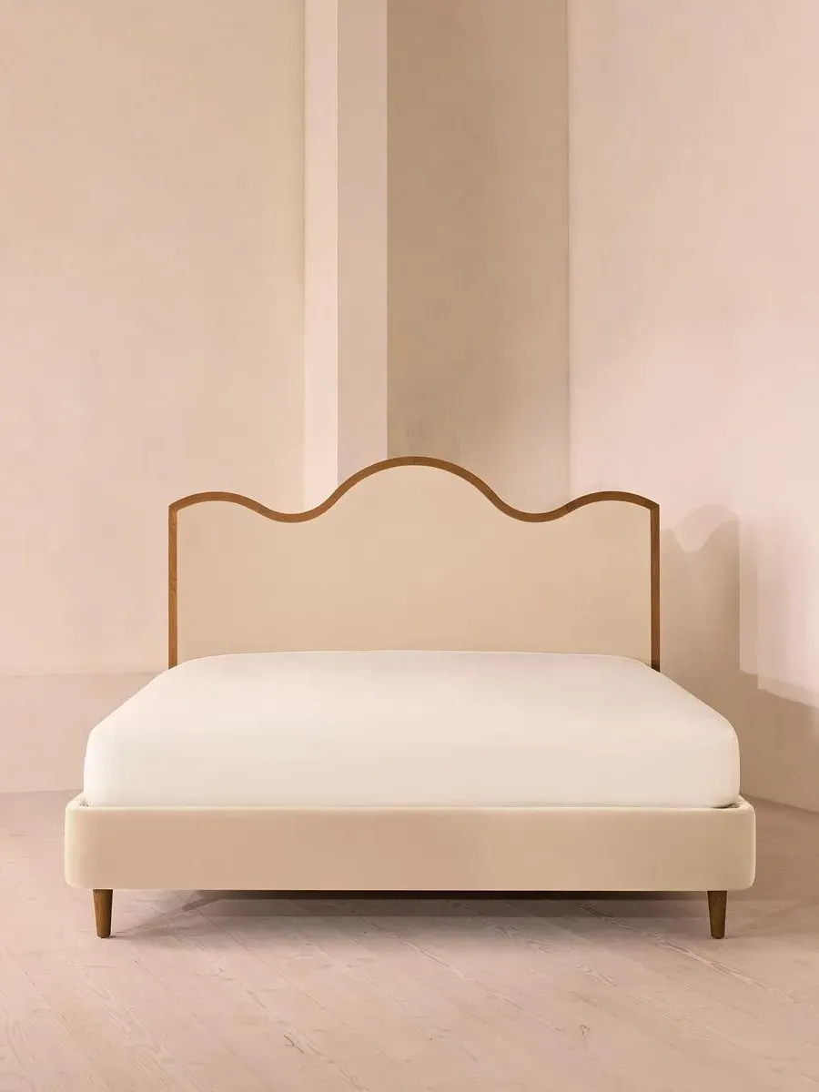 A waved headboard fully upholstered in linen is framed with a solid oak border. The solid oak frame of our Aubrey bed creates a low, relaxed profile perched on tapered wooden legs. Characterised by its eye-catching, waved headboard, this style is upholstered in linen designed to match back to the rest of our collection.