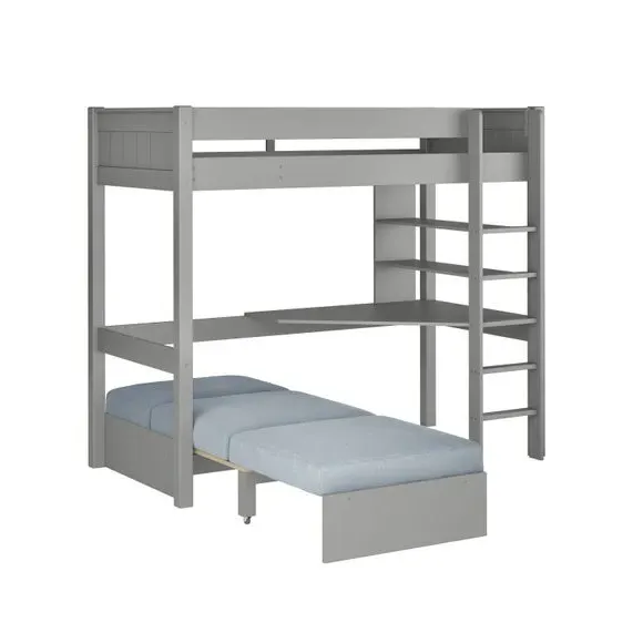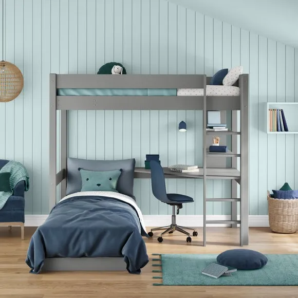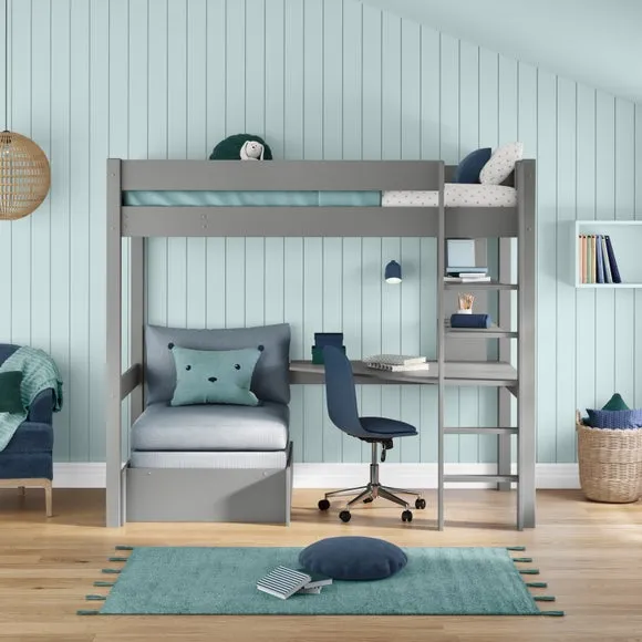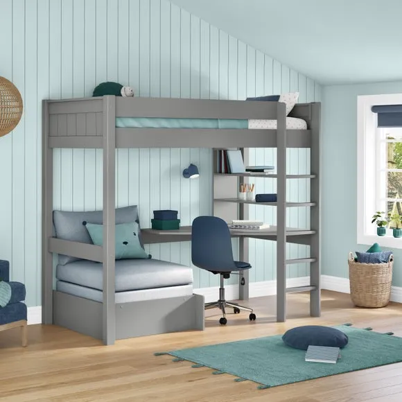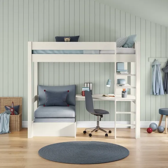 * Painted wood frame* High foot end* Slatted base* Space saving* Assembled on delivery* Can only be delivered to mainland UK This highsleeper is a space-saving solution that combines a comfortable bed with a functional desk, ample shelving, and an integrated chair bed. Perfect for sleep, study, and relaxation, this high sleeper maximises available space, offering a dedicated workspace and plenty of storage for books and personal items. The chair bed transforms easily into a guest bed, enhancing the room's versatility.*Select the relevant options to purchase mattresses to fit this bed. You can choose between foam or pocket sprung mattresses.