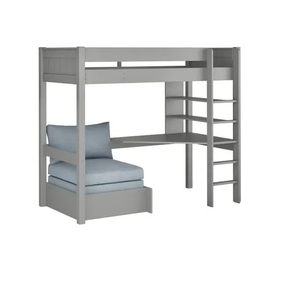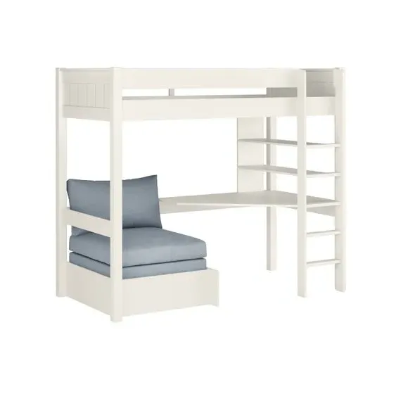 The high sleeper bed combines sleeping, studying and storage in one compact unit, featuring a built-in desk and integrated chair bed below. Its painted wood frame provides durability with slatted base support, while the high foot end design maximizes floor space. The chair bed converts into a guest sleeping area, and ample shelving offers storage for books and personal items.