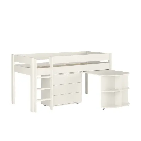 The midsleeper bed combines sleeping space with practical storage solutions, featuring a pull-out desk and integrated chest of drawers. Its painted wooden frame offers durability with a high foot end design, while the slatted base provides proper mattress support. The space-saving configuration maximizes floor area below the sleeping platform, and the built-in storage keeps belongings organized.