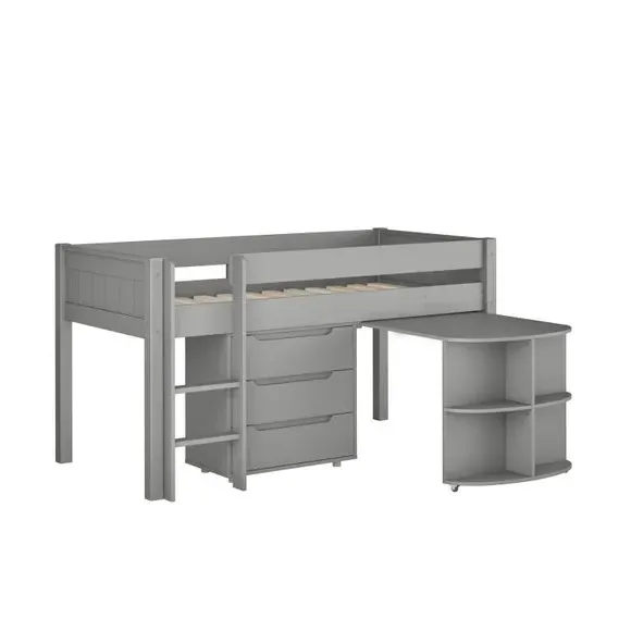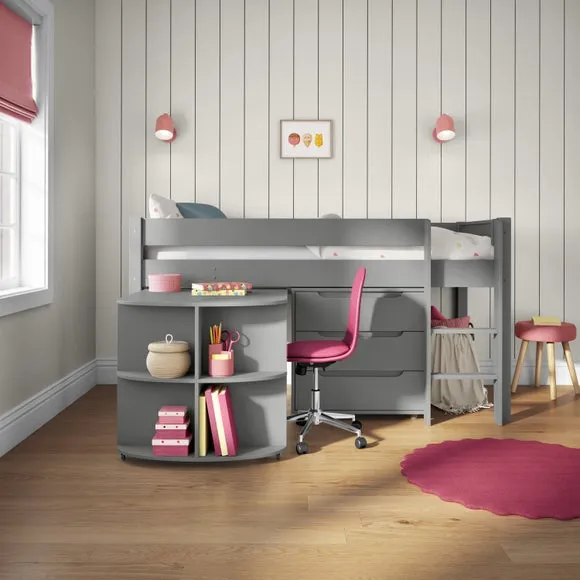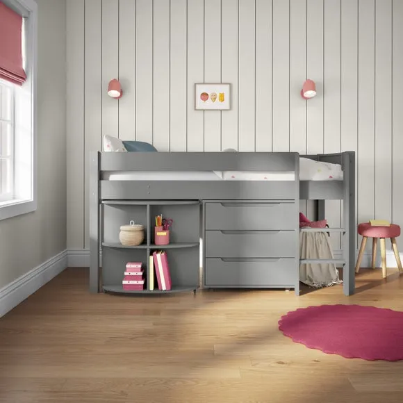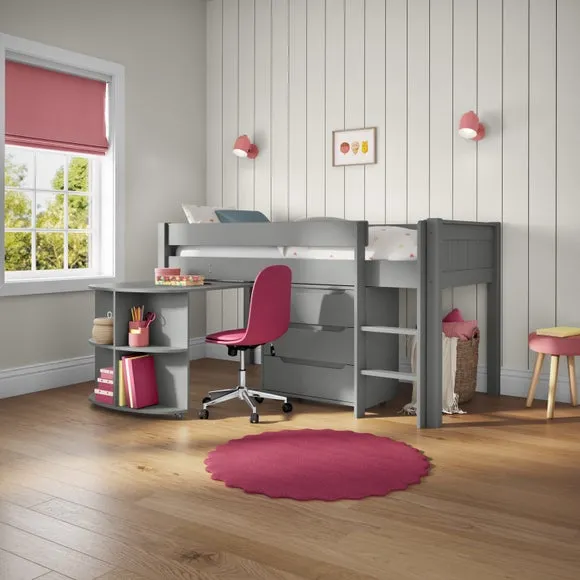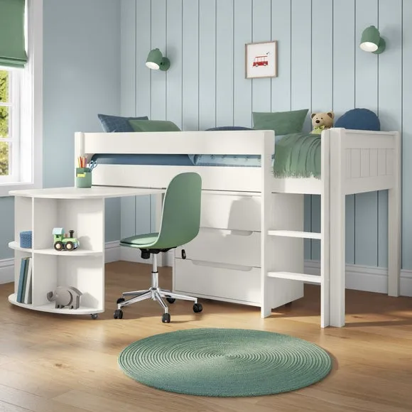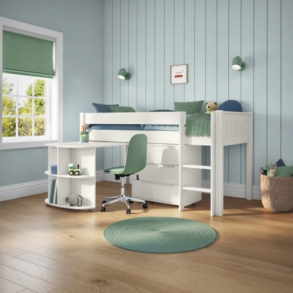 * Painted pine frame* High foot end* Slatted base* Space saving* Assembled on delivery* Can only be delivered to mainland UK This versatile piece offers a comfortable elevated sleeping space above a practical pull-out desk and a 3-drawer chest, making it a perfect solution for smaller rooms or those in need of smart storage options. The pull-out desk creates a dedicated area for homework, studying, or creative projects, while the 3-drawer chest provides ample storage for clothes, toys, or essentials, helping to keep the room neat and organised.*Select the relevant options to purchase mattresses to fit this bed. You can choose between foam or pocket sprung mattresses.