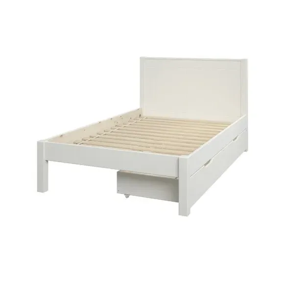 The bed combines functionality with its low foot end design, featuring two spacious underbed drawers for practical storage. Its painted pine frame provides durability, while the slatted base offers comfortable support. The clean lines and sleek finish suit various decor styles, and the space-saving design maximizes room efficiency.