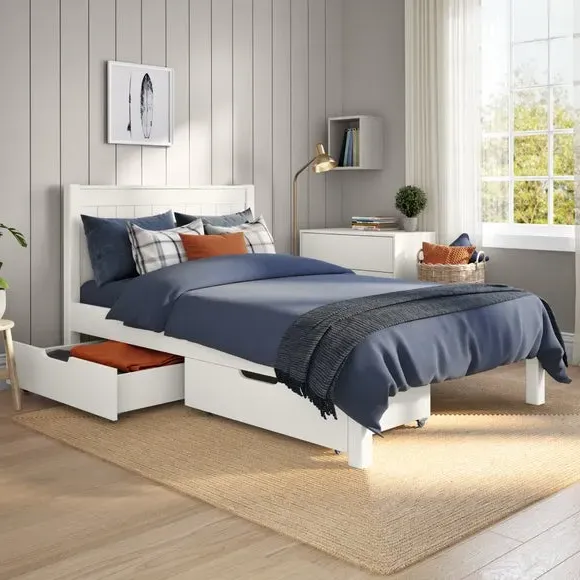 * Painted pine frame* Low foot end* Slatted base* Space saving* Assembled on delivery* Can only be delivered to mainland UK This bed features a perfect blend of style and functionality, complete with two spacious underbed drawers. Its timeless design, featuring clean lines and a sleek painted finish, fits seamlessly into any decor, adding a touch of sophistication to your space. Ideal for smaller bedrooms, this single bed provides a cosy and inviting place to rest, while the pair of drawers offers practical storage for linens, clothing, or personal items.*Select the relevant options to purchase mattresses to fit this bed. You can choose between foam or pocket sprung mattresses.