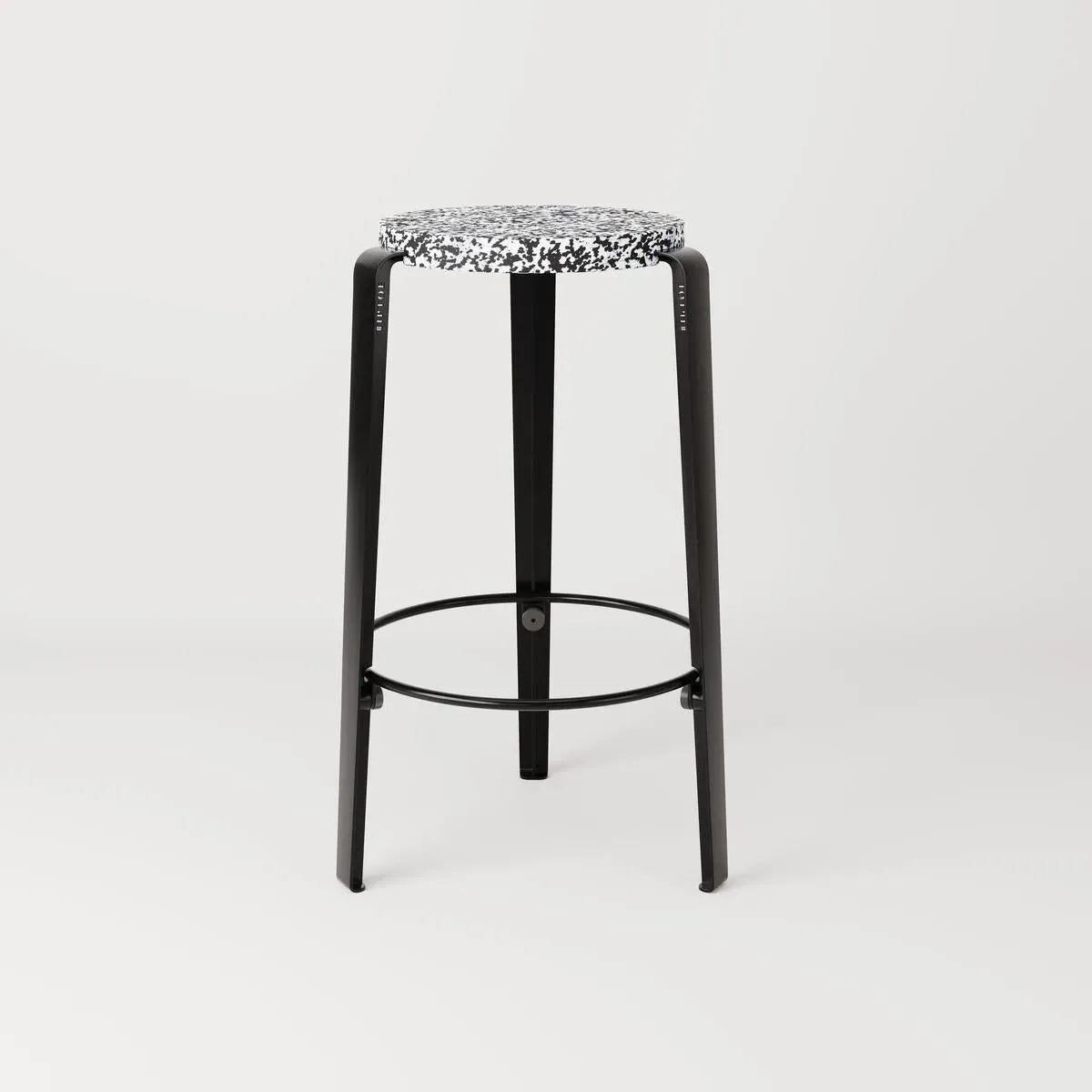 The stool combines eco-friendly design with practical functionality, featuring powder-coated steel legs and a recycled plastic seat made from yoghurt pots. Its stackable construction provides space-saving storage, while the 66cm height suits counter use. The durable steel frame ensures long-lasting stability, and the recyclable materials support sustainable living.