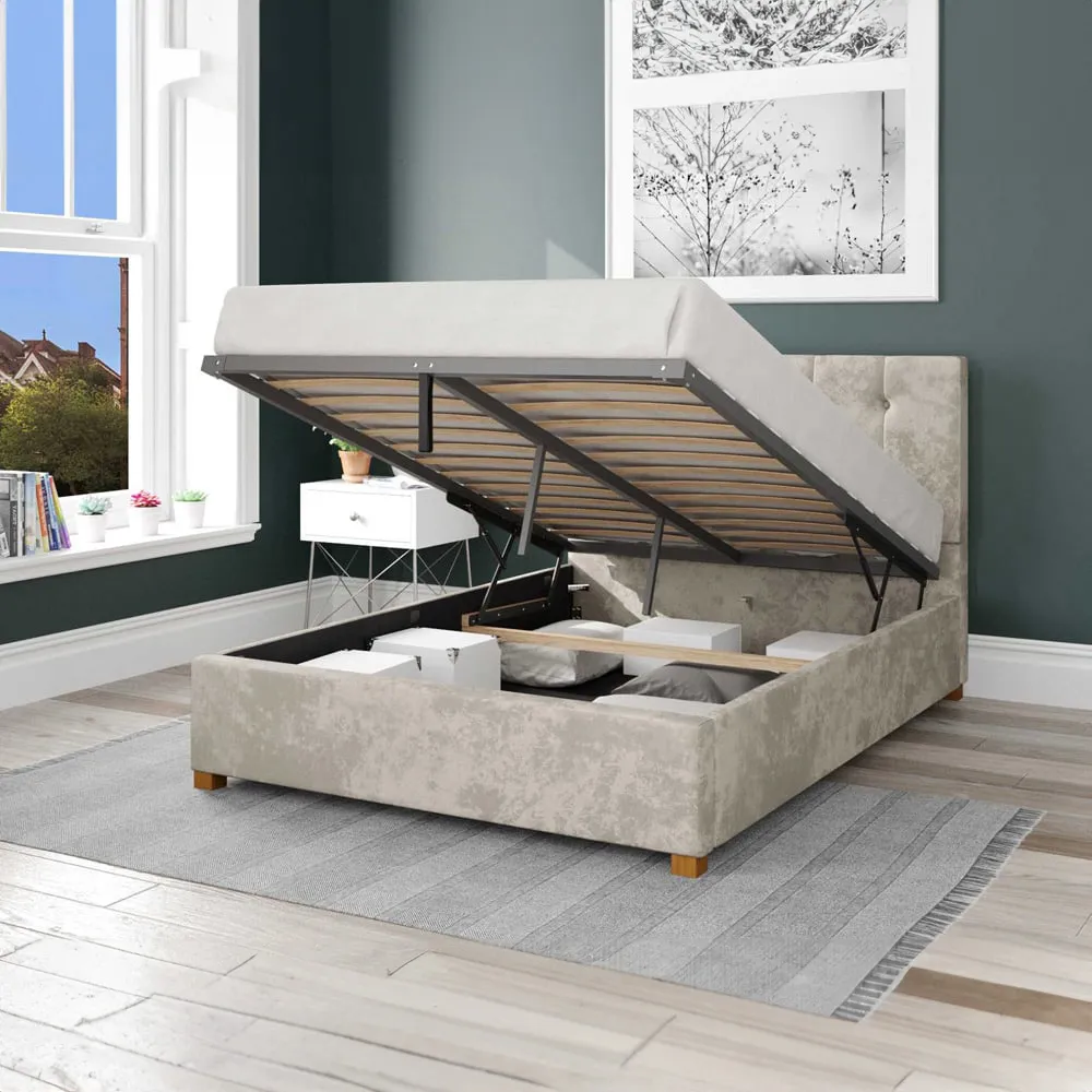 Maximise space and transform your bedroom with this Aspire Hepburn Single Silver Mirazzi Velvet Ottoman Bed. This stylish bed ensures quality and has no shortcuts in the making; therefore, it is designed and handcrafted down to the last stitch. The frame is crafted using chunky, upholstered panels that will endure the test of time. Also, the excellent sprung slats with a multi-layer construction ensure durability and comfort. Made with elegance, the bed is finished with hand-carved, hardwood feet and comes with a tasteful, upholstered headboard. The headboard features a deep padding for no compromises in comfort while sitting in bed. Plus, the fabric buttons and vertical line design create a clean and sophisticated look. Ideal for both contemporary and traditional interior decor, this bed is perfect for a range of interiors. For added convenience, it also provides a solution to your storage problems. This ottoman bed reveals a spacious storage area underneath, meaning you can store items within the bed frame without taking up extra floor space. To protect items stored and ensure that they are not in contact with the floor, it comes with an attached fabric base to the underside of the bed. Easy to use, the simple-lift mechanism powered by gas pistons enables access to the storage with minimal effort. Sturdy and solid, this bed is capable of lifting a mattress with a weight of up to 60kg. Moreover, the pistons hold the bed in place when it is raised for hands-free access. This ottoman bed frame is manufactured in the UK.