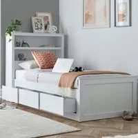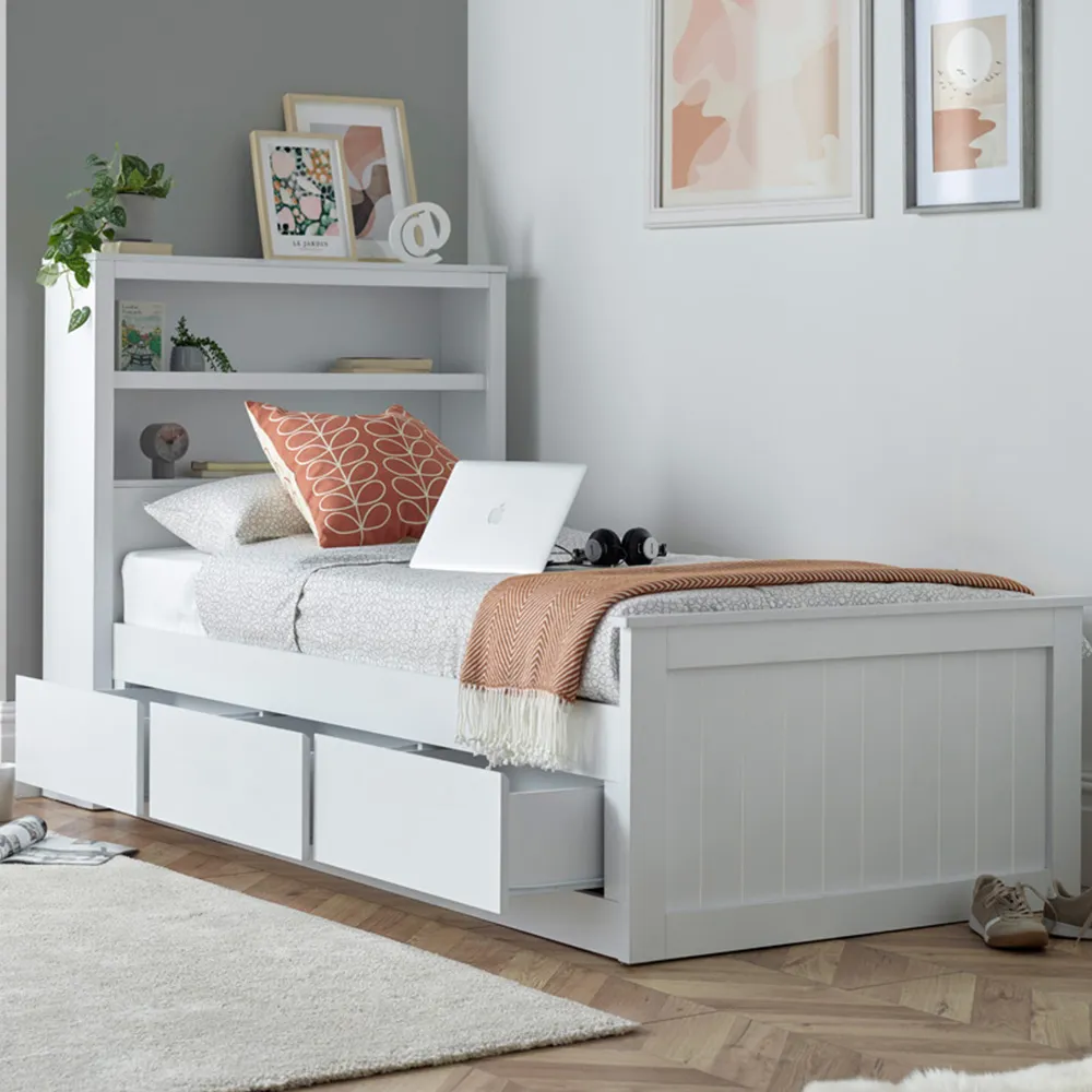 Upgrade your bedroom with the classy Bedmaster Enzo Bed Frame. This space-saving bed frame is an ultimate blend of style and functionality. Crafted with precision, this white single-size bed offers a restful night's sleep with a smart storage solution to keep your space organised. The bed features three spacious drawers seamlessly integrated into the bed frame for storing away extra bedding, clothes or any other items. This bed features an elegantly designed headboard with two built-in bookshelves. You can keep your favourite books, nighttime essentials or decorative items as per your choice. This bed is made using high-quality rubberwood with a minimalist design and solid slats for extra durability, making it a versatile addition to any bedroom decor. It includes user-friendly assembly instructions, and the drawers can be assembled to fit either side of the bed. Delivered to a room of choice. Self-assembly is required. The internal dimensions of drawers are 14 x 53 x 33.5cm. Footboard height: 55.5cm.