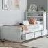 The Enzo bed frame combines storage functionality with its three integrated drawers and built-in headboard bookshelves. Crafted from rubberwood with solid slats, it provides durability while the drawer system keeps bedding and essentials organised. The headboard features two shelves for books and nighttime items, and the drawers can be assembled on either side for flexible placement. Internal drawer dimensions measure 14 x 53 x 33.5cm with a footboard height of 55.5cm.