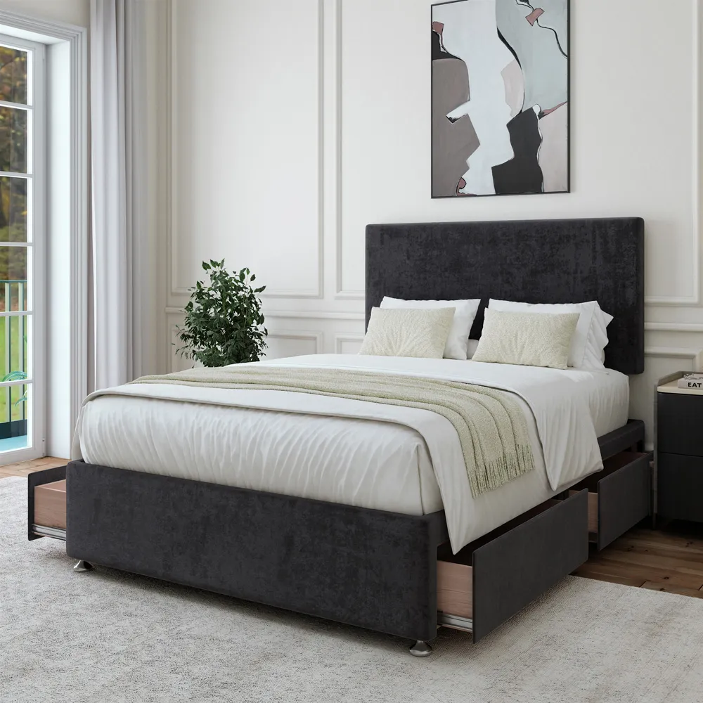 A solid platform top base and headboard from one of the UK's leading manufacturers. Providing support and a firm foundation for your mattress. Finished with chrome fittings and gliders. This divan is universal meaning the headboard and can be placed on any side. It can be purchased with 0, 2 or 4 drawers. Available in an array of fabrics and colours.