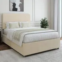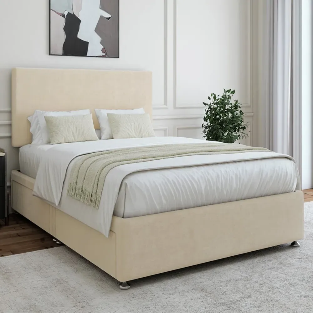 The divan base offers solid platform support with its firm foundation design, featuring an integrated Valencia headboard. Its universal construction allows headboard placement on any side, while the chrome fittings and gliders add durability. The linen upholstery ensures lasting comfort and support.