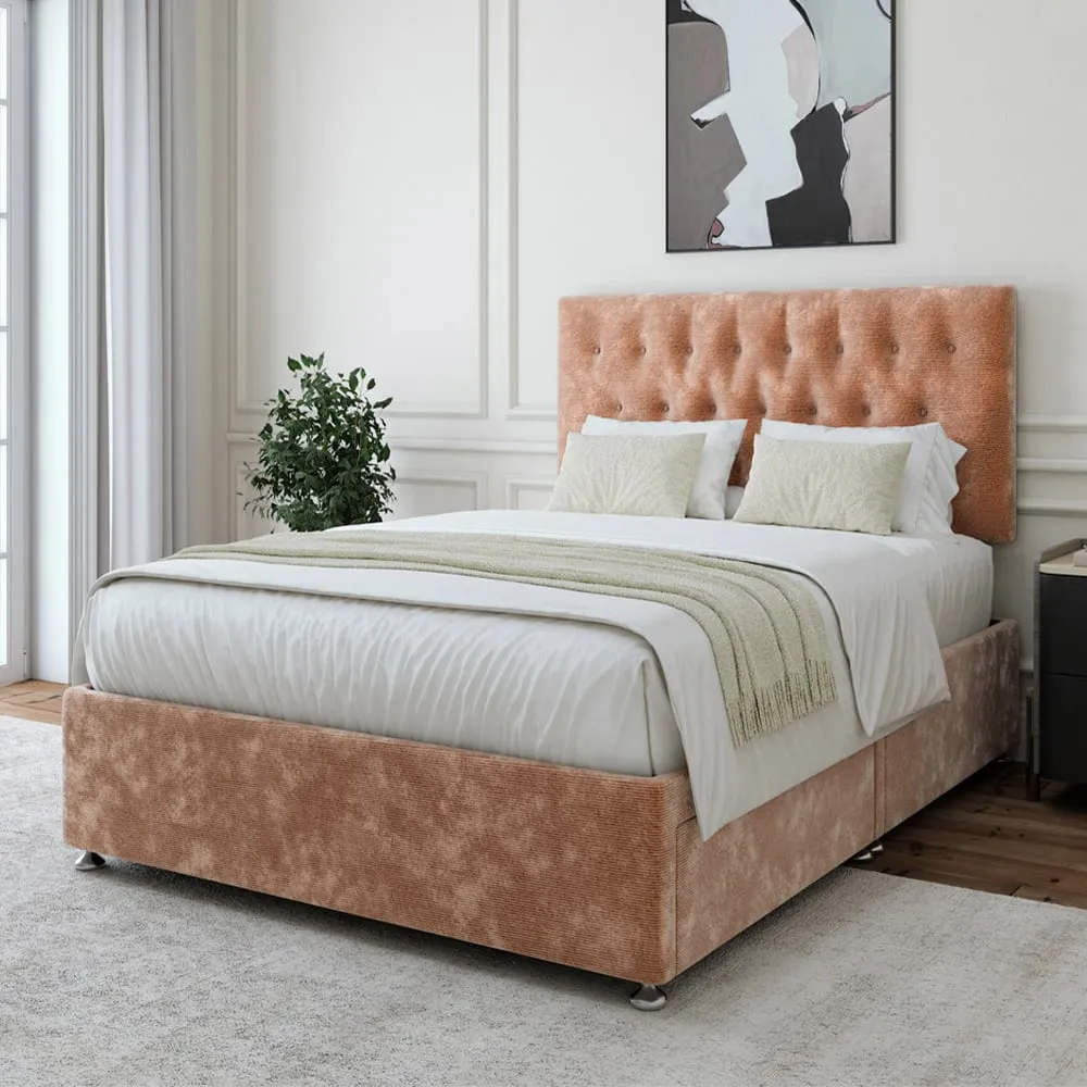 A solid platform top base from one of the UK's leading manufacturers. Providing support and a firm foundation for your mattress. Finished with chrome fittings and gliders. This divan is universal meaning the headboard and storage can be placed on any side. Can be purchased with headboard and with 0, 2 or 4 drawers. Available in an array of fabrics and colours. Please note: Headboard is not include.