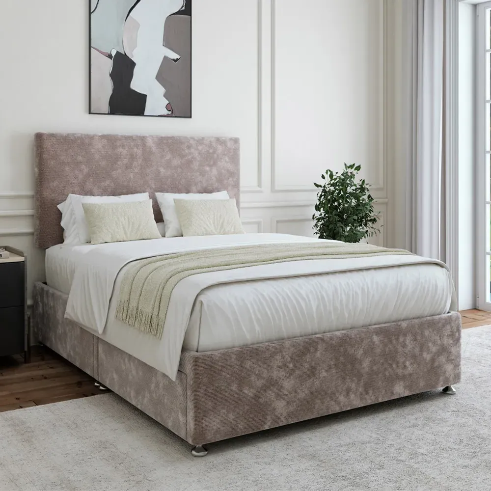 The divan base offers solid platform support with its Lona headboard, creating a firm foundation for your mattress. Its chenille upholstery provides comfort and durability, while the chrome fittings add a polished finish. The universal design allows flexible headboard and storage placement on any side, and the gliders ensure smooth movement when needed.