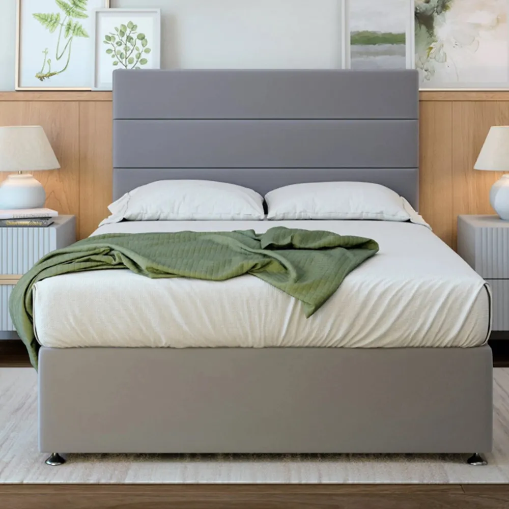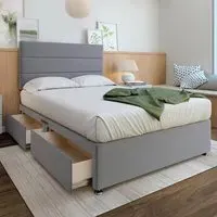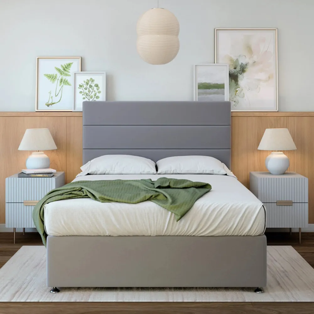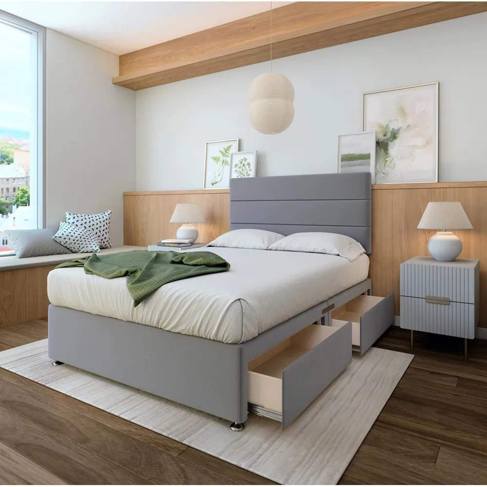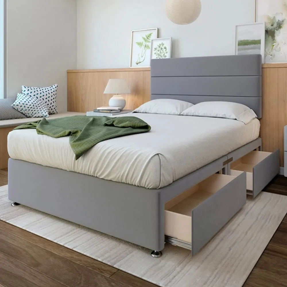 A solid platform top base and headboard from one of the UK's leading manufacturers. Providing support and a firm foundation for your mattress. Finished with chrome fittings and gliders. This divan is universal meaning the headboard and storage can be placed on any side. Can be purchased with 0, 2 or 4 drawers. Available in an array of fabrics and colours.