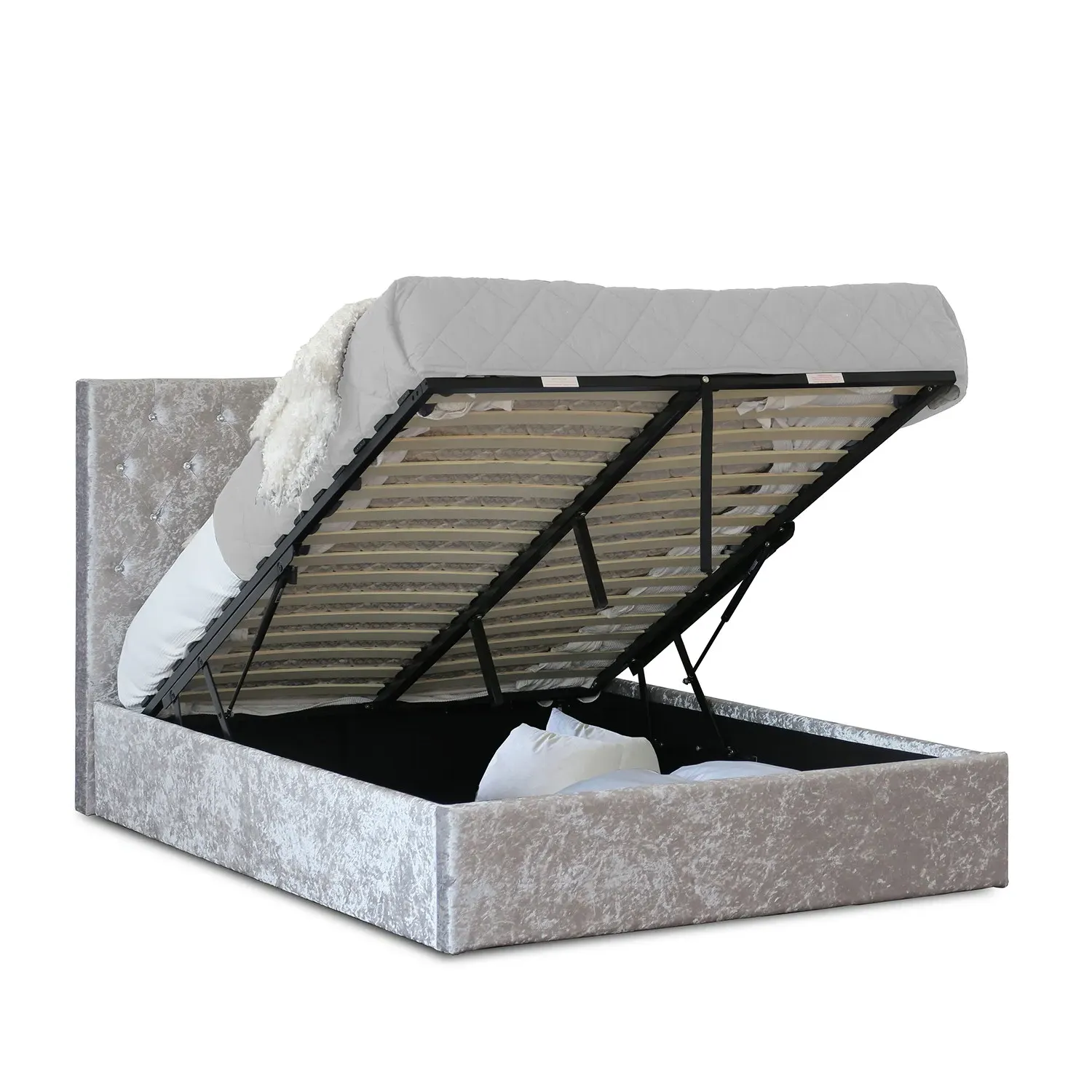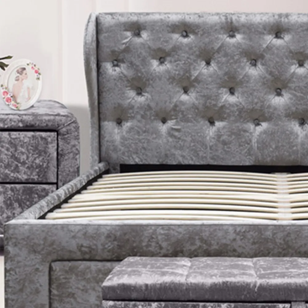 The Brooklyn bed frame offers comfort with its soft crushed velvet upholstery in a cream tone. Its high padded panelled headboard features detailed stitching, while the low footboard provides a clean finish. The sturdy metal frame combines with a posture-sprung slatted base for reliable support and durability.