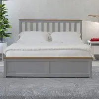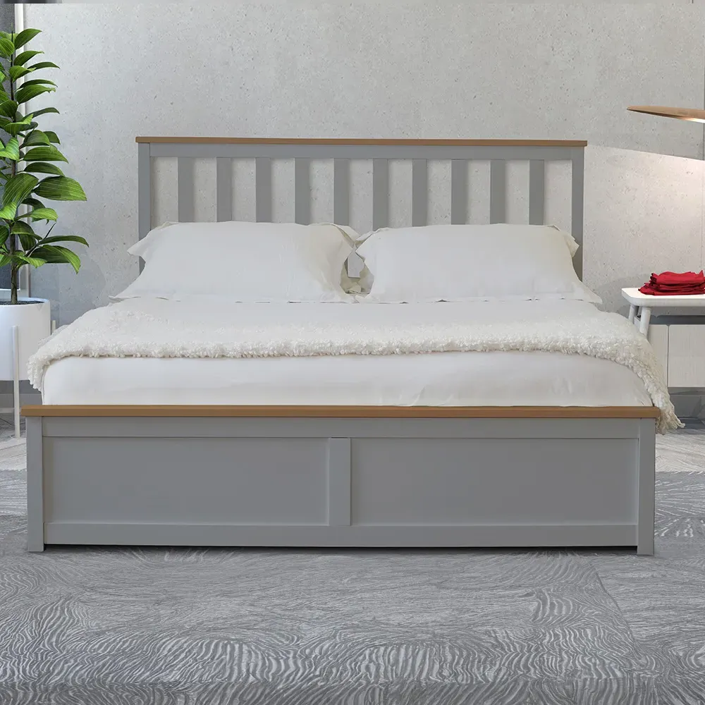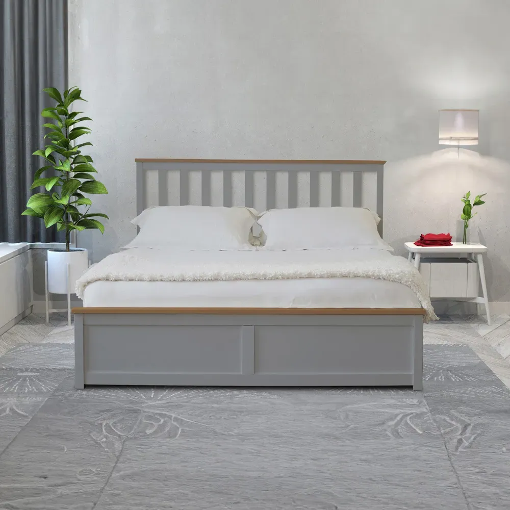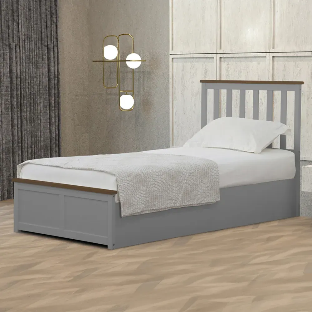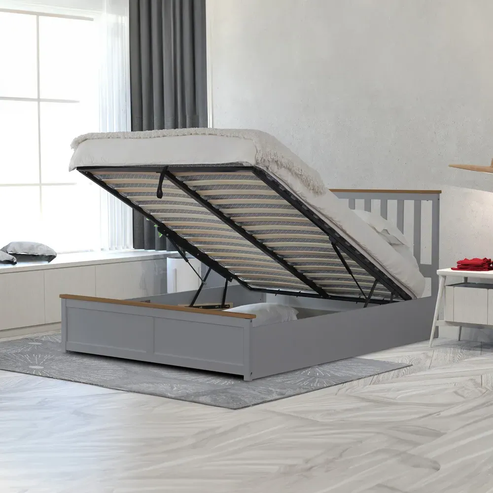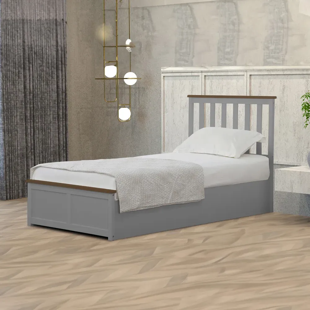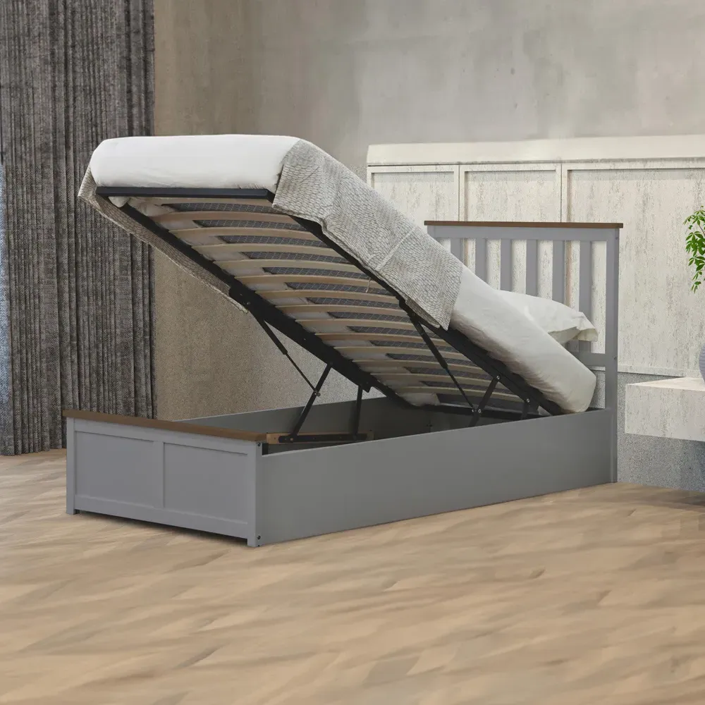 The ottoman bed offers space-saving storage with its gas hydraulic lift mechanism, boasting a whitewash finish accented by caramel bars at the head and foot ends. Its slatted headboard provides comfortable support, while the low footboard adds visual appeal. The hidden storage compartment beneath maximizes space efficiency, and the solid construction accommodates any UK standard 3ft mattress.