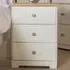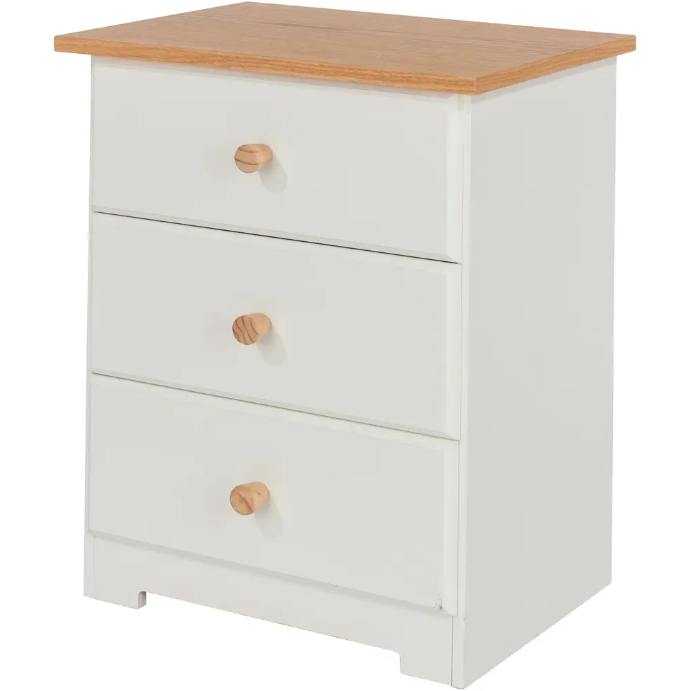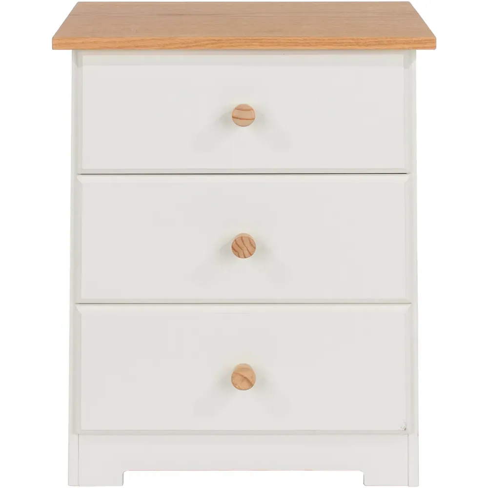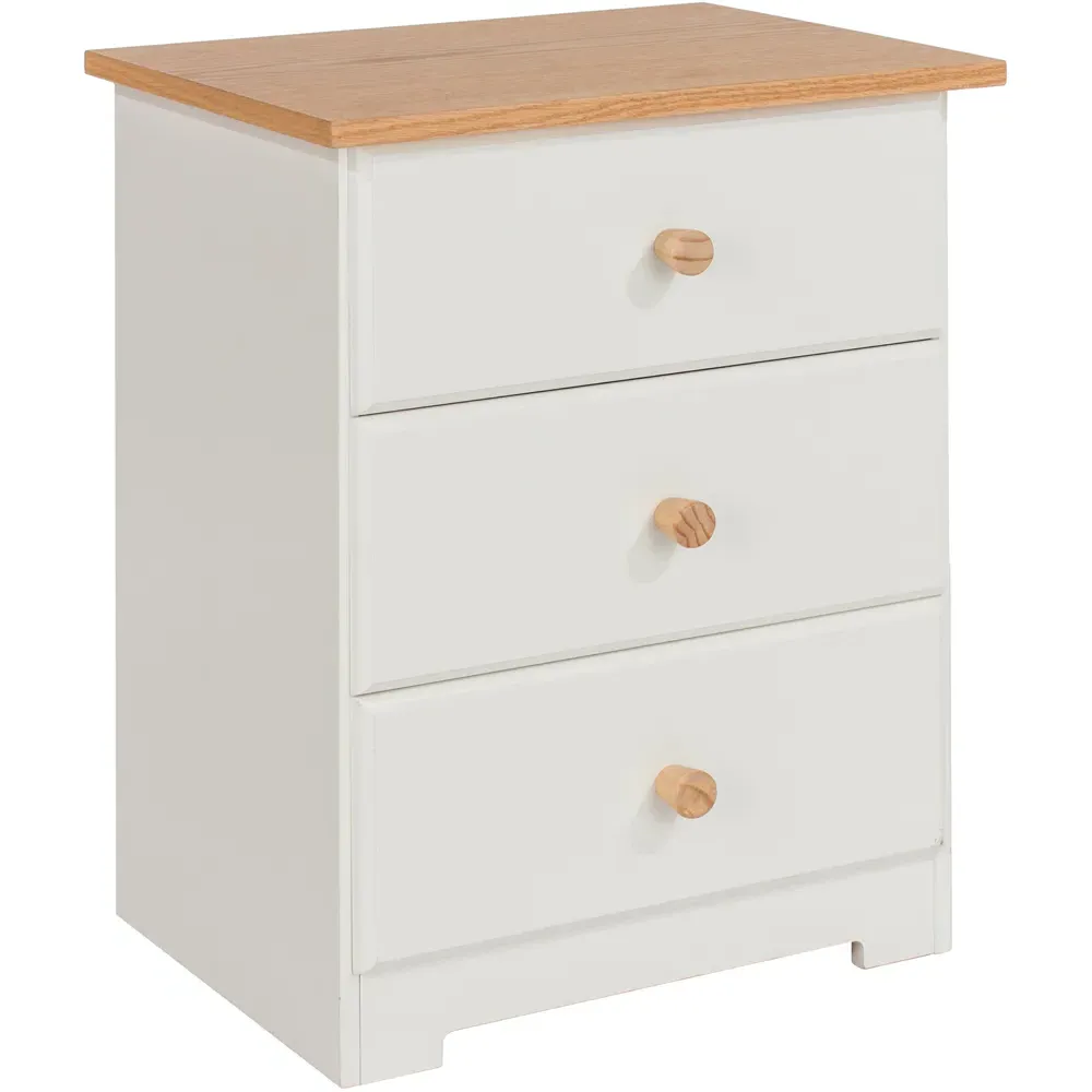 The Colorado 3 Drawer Bedside Cabinet combines sturdy MDF construction with an oak-effect foil top for lasting appeal. Its three drawers feature pine interiors with easy-slide plastic runners, while wooden knob handles complement the off-white finish. Each drawer offers 5kg capacity with safety stops to prevent accidental slips, and the curved drawer fronts add visual dimension to the design.