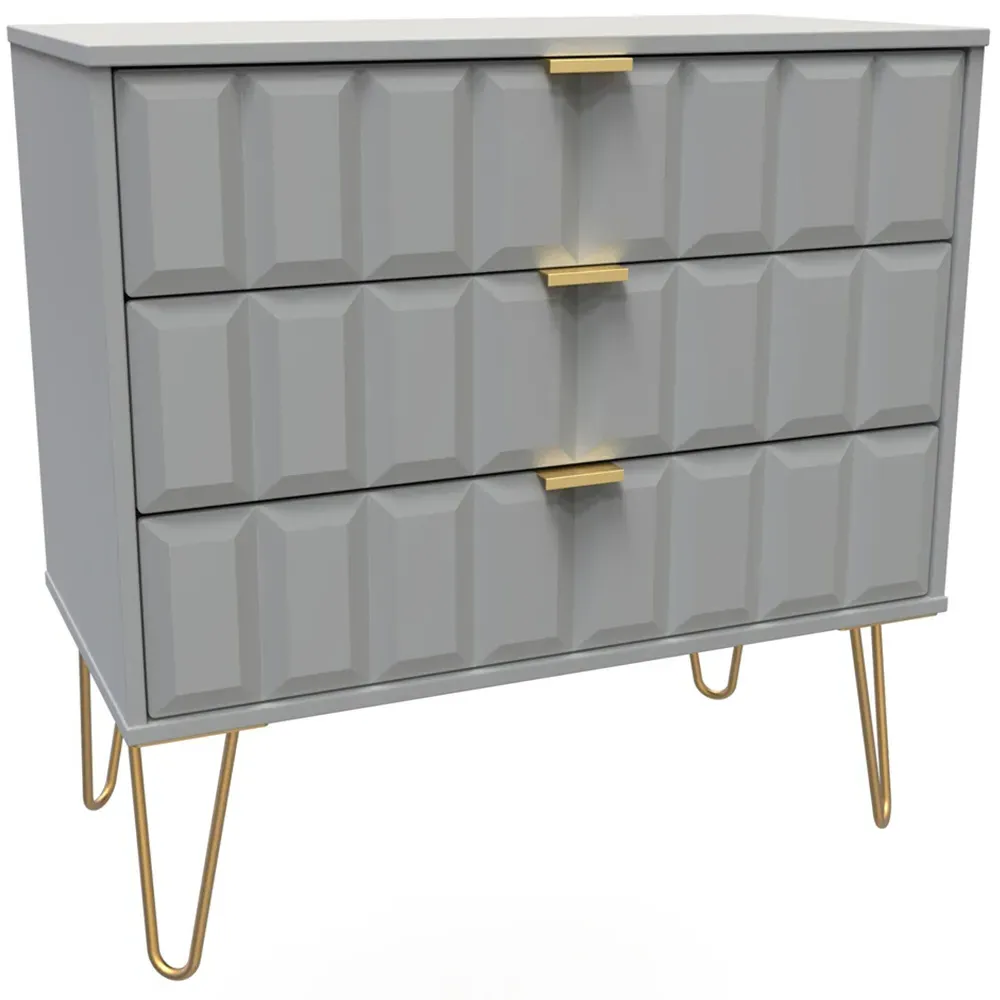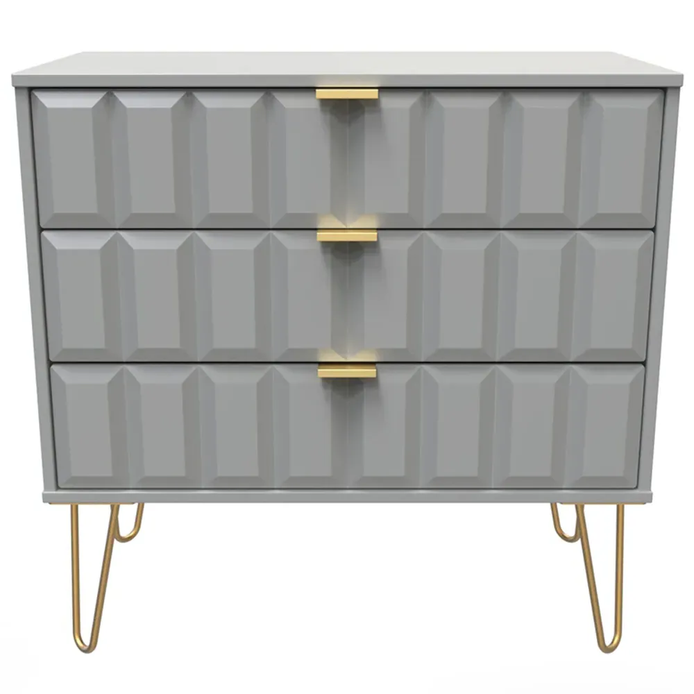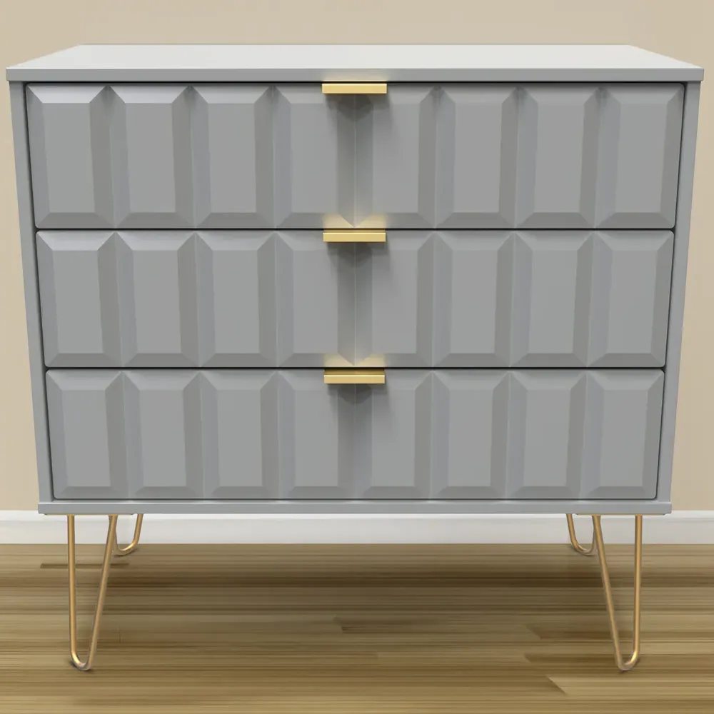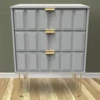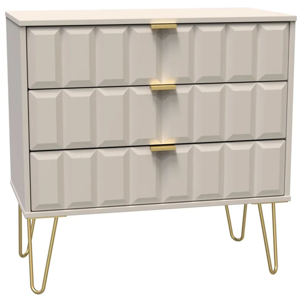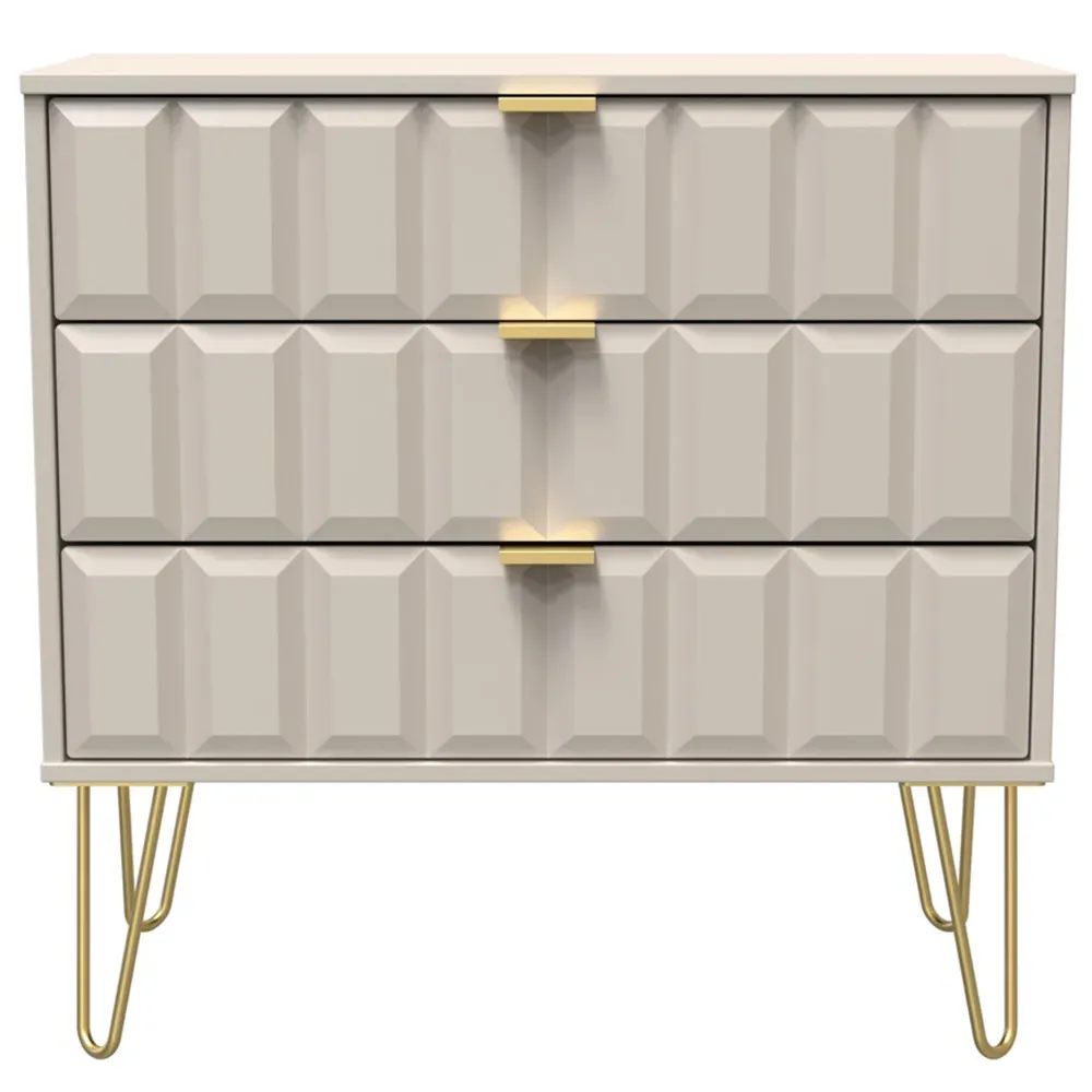The chest of drawers combines functionality with its cube design drawer fronts and matt Kashmir finish. Its three drawers feature smooth metal runners with linen-effect linings, providing ample storage space for organizing belongings. The gold metal handles and hairpin legs add charm to the piece, while the neutral tone complements various decor styles.