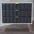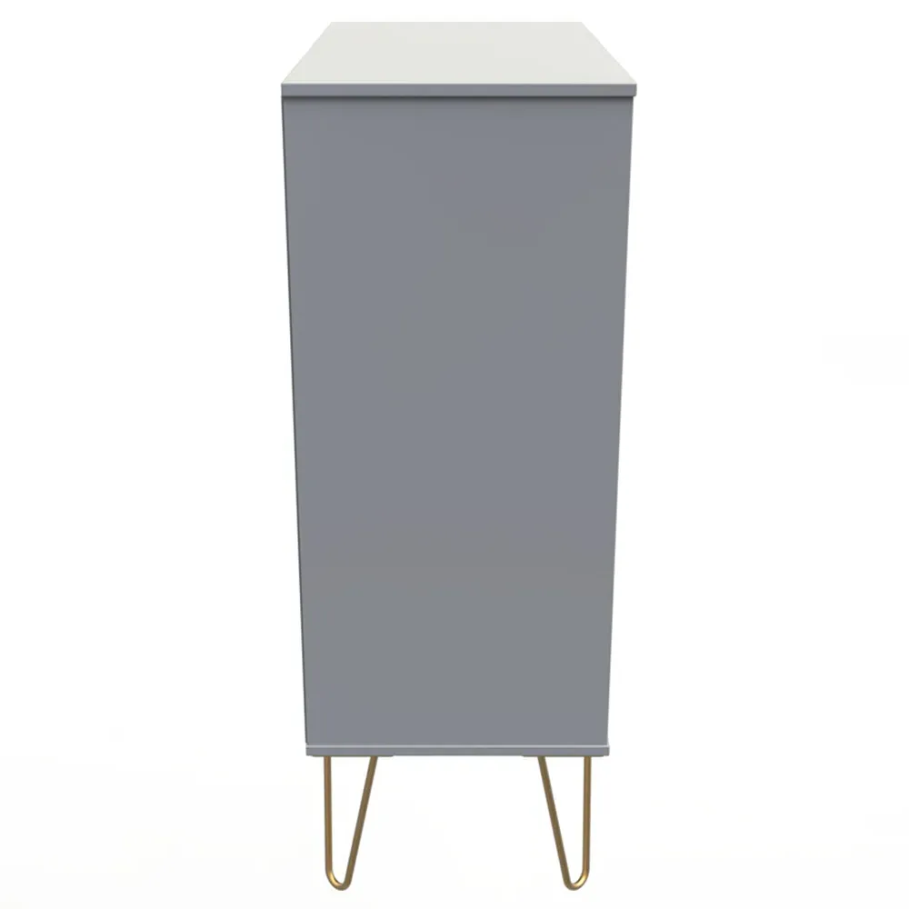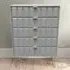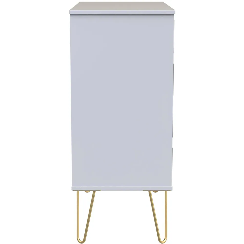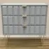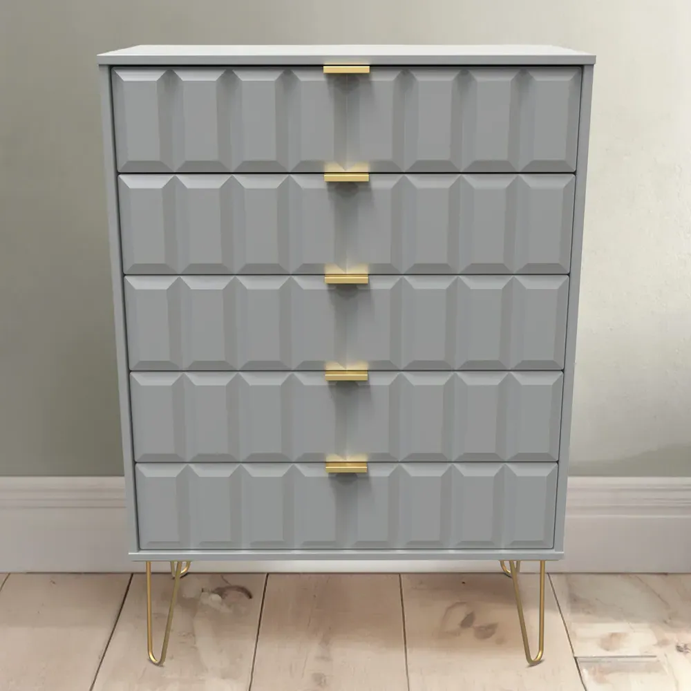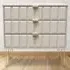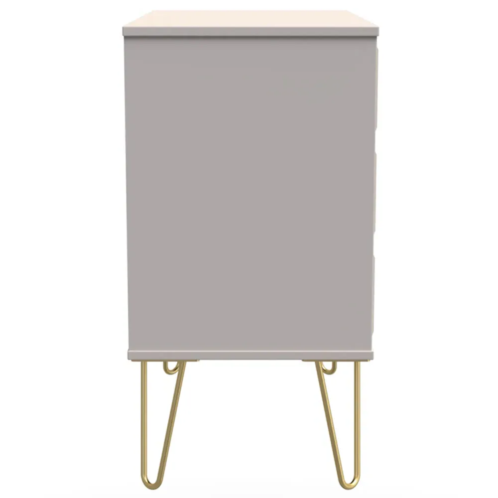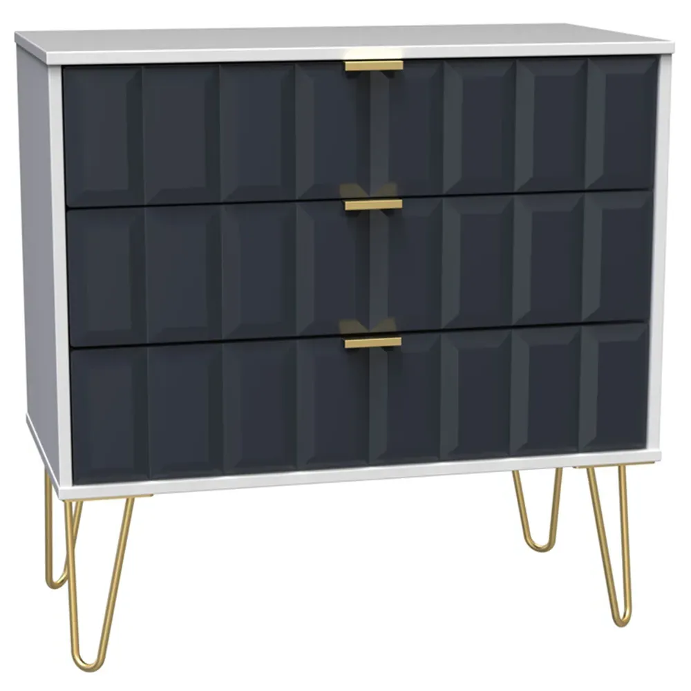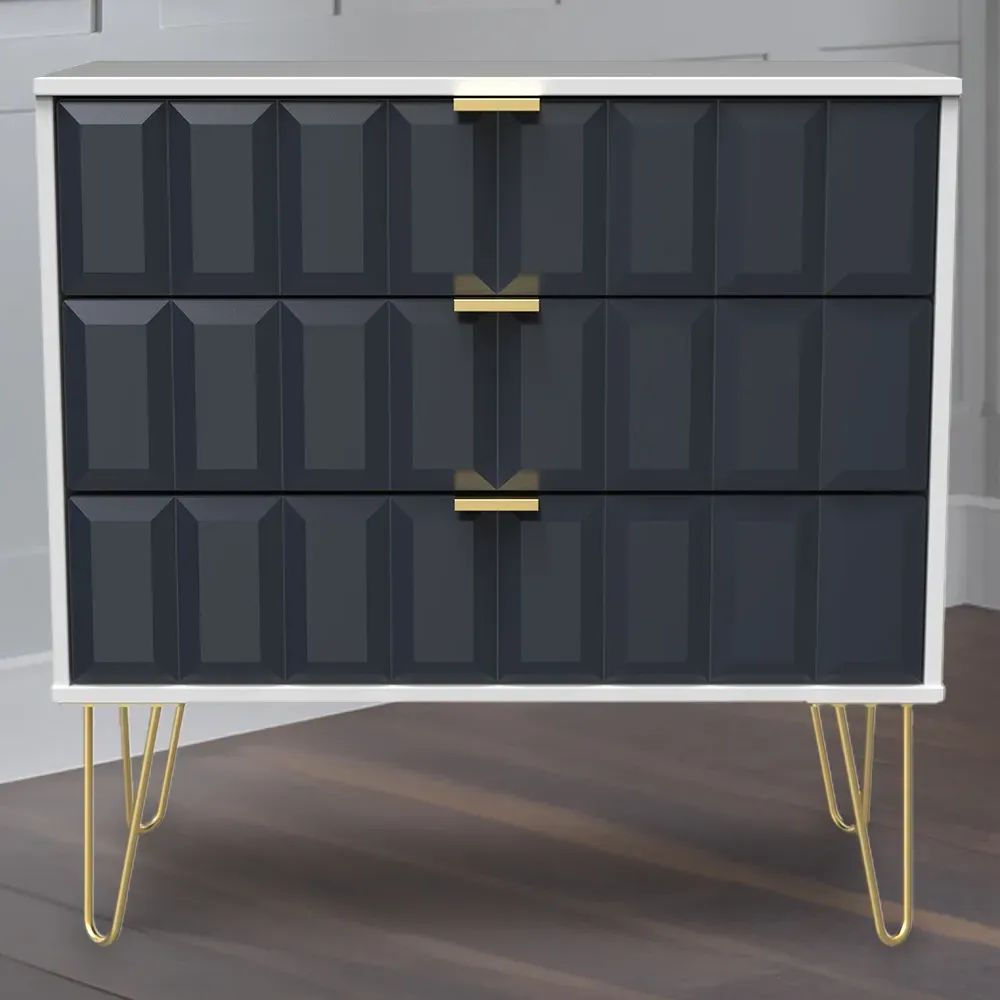 The chest of drawers combines functionality with its cube design drawer fronts and matt Kashmir finish. Its three drawers feature smooth metal runners with linen-effect linings, providing ample storage space for organizing belongings. The gold metal handles and hairpin legs add charm to the piece, while the neutral tone complements various decor styles.
