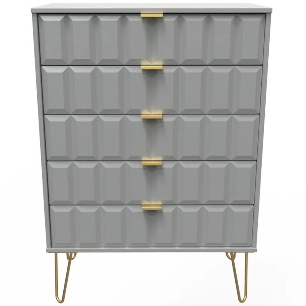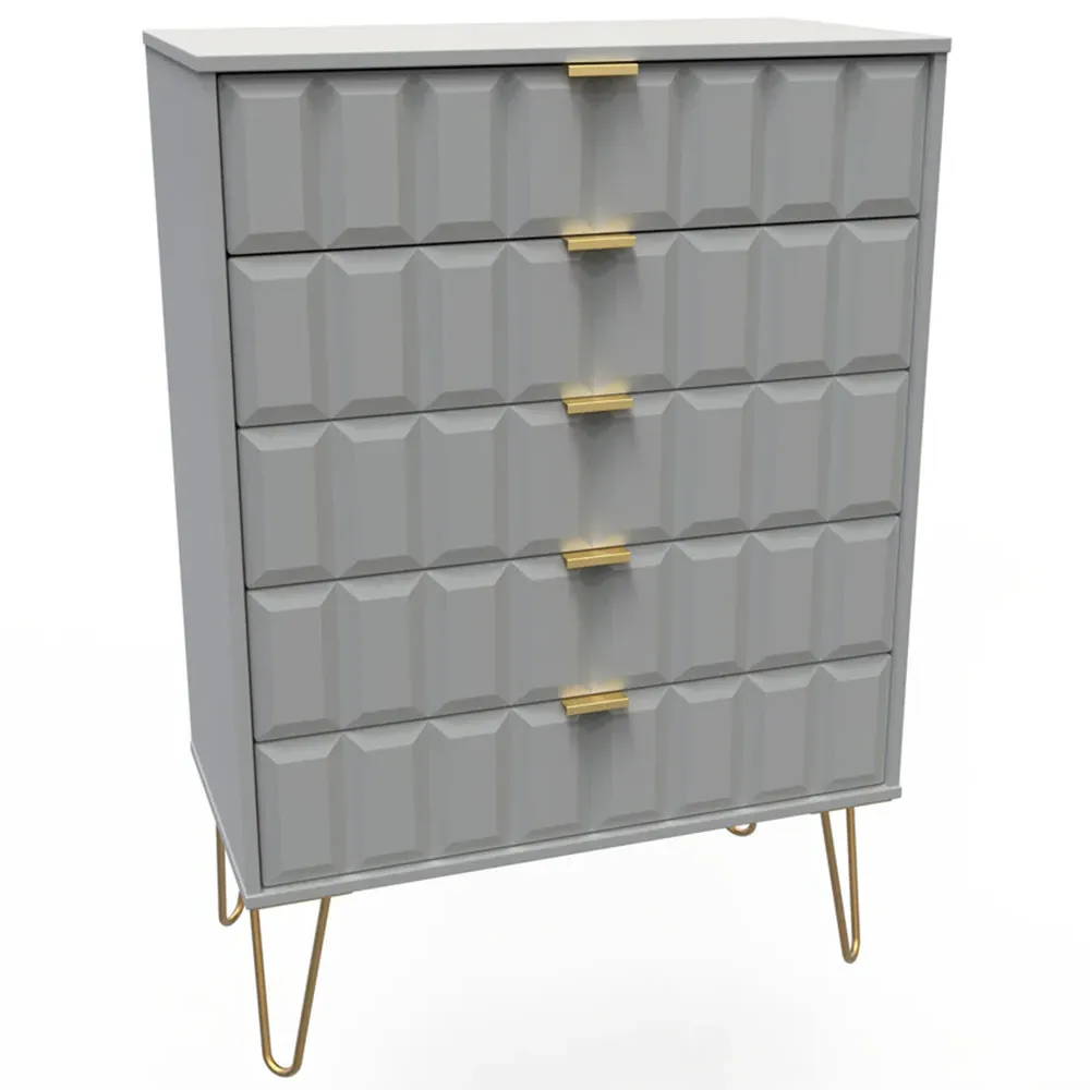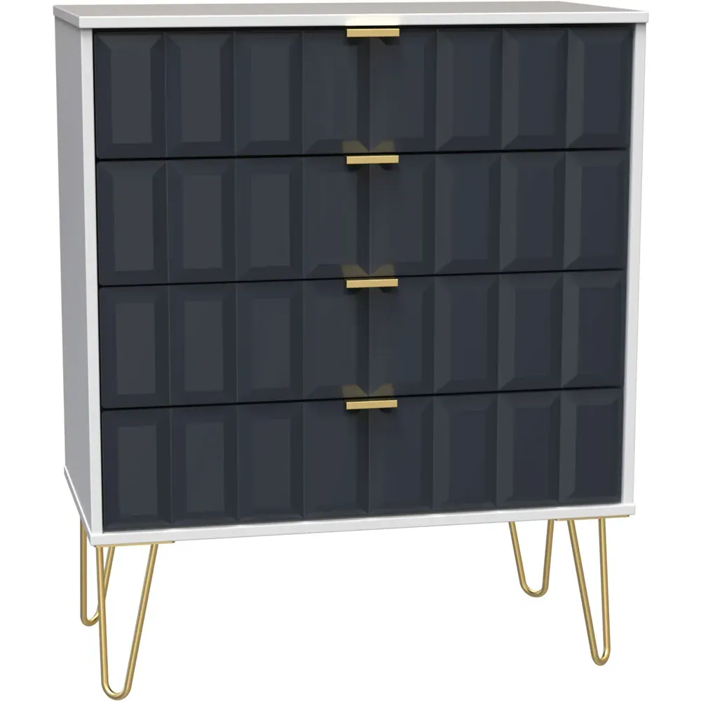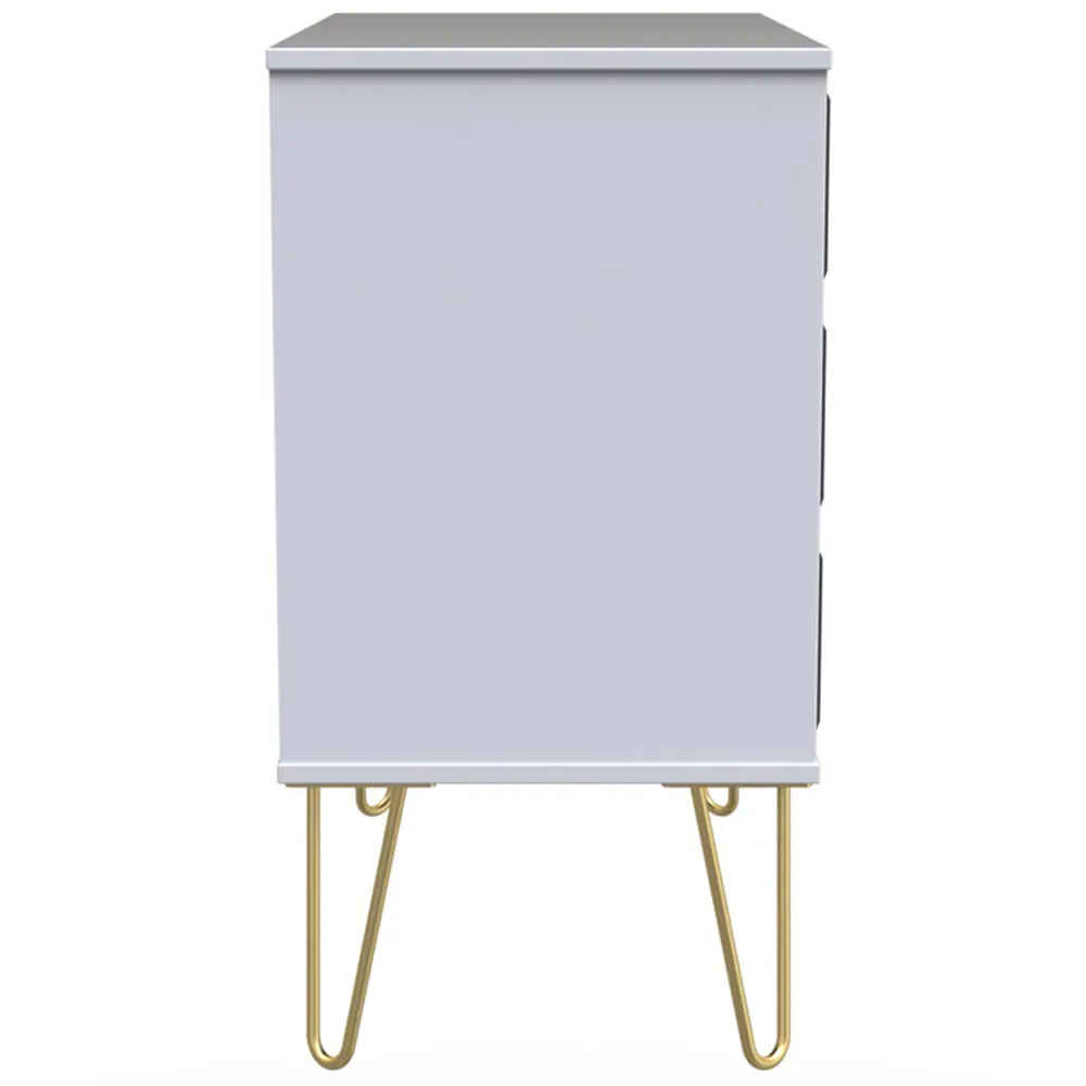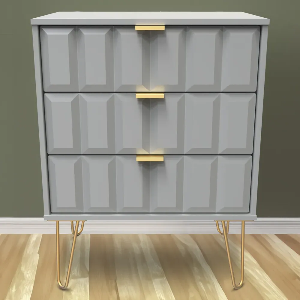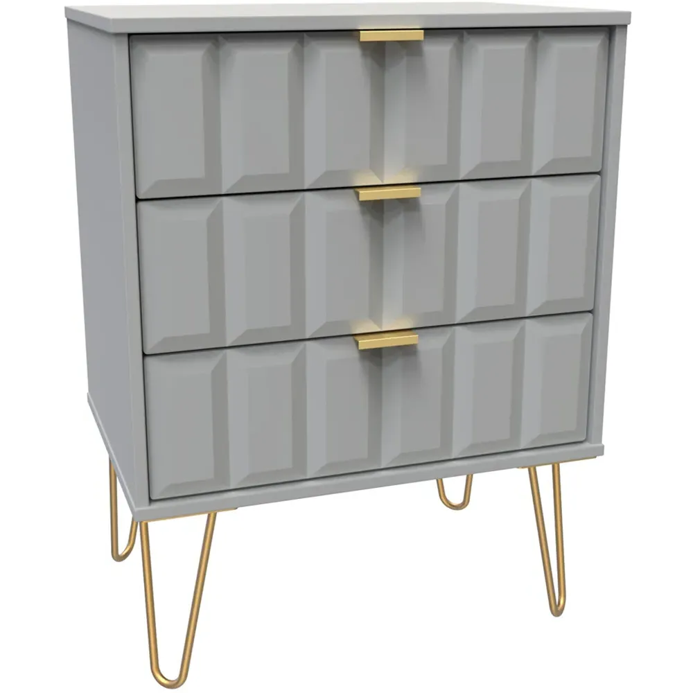 Spruce up your decor and add a blend of practicality and style to your bedroom with this Crowndale Cube 3 Drawer Matt Kashmir Chest of Drawers Ready Assembled. With a beautiful matt Kashmir hue, this bedside table features a striking cube design. Its gold metal pull handle and gold hairpin legs compliment the table's colour and give a charming modern look. The three drawers have smooth metal runners along with linen-effect linings and offer a handy storage solution so can enjoy both functionality and style.