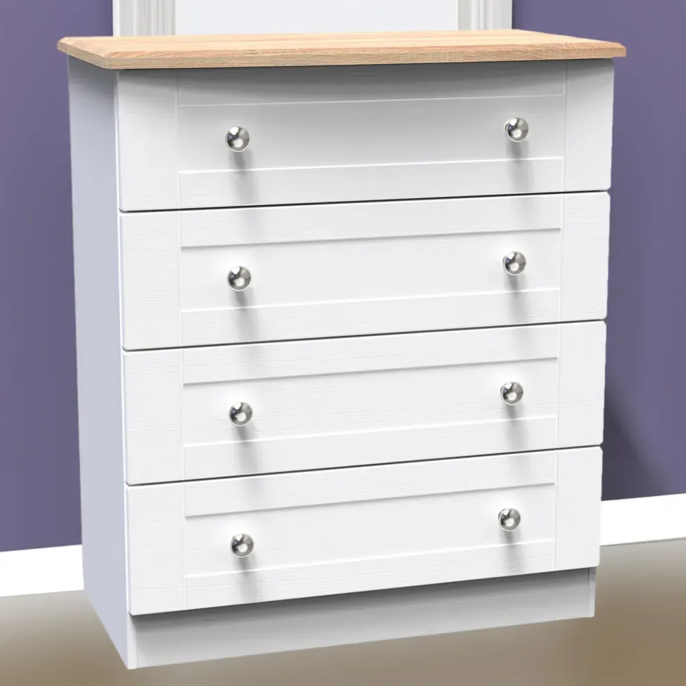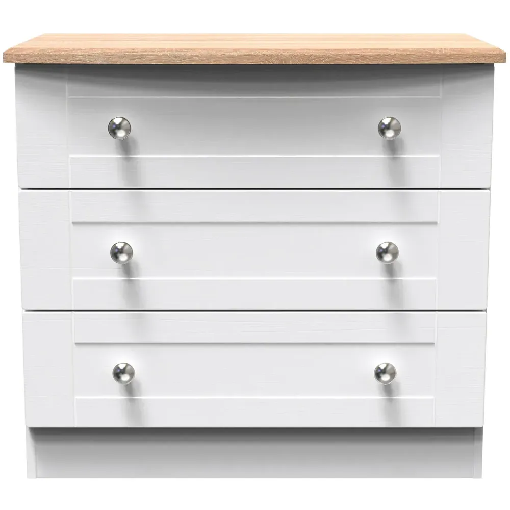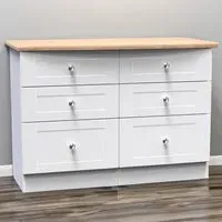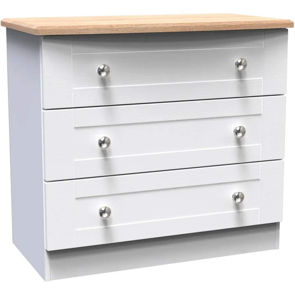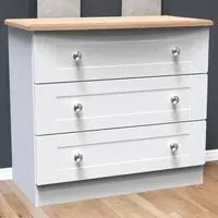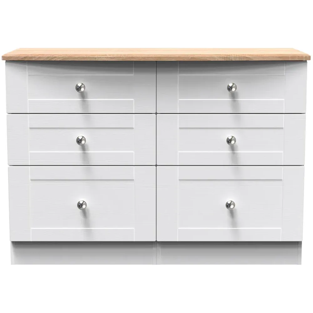 Add a touch of elegance to your space with the Crowndale Sussex 2-Drawer White Ash and Bardolino Oak Bedside Table. With a wood grain effect, panelled design, recessed fronts, contrasting wood top and chrome handles, this unit is practical and stylish in nature. Made in the United Kingdom with the highest quality material, the unit features a traditional design with block panel fronts and polished metal handles. Finished with smooth metal drawer runners and linen-effect drawer lining, the unit has a scratch-resistant surface. It is delivered directly to your location of choice by a two-man delivery team and comes fully assembled. Please note that any handles or legs may be removed during transit to avoid the risk of damage.