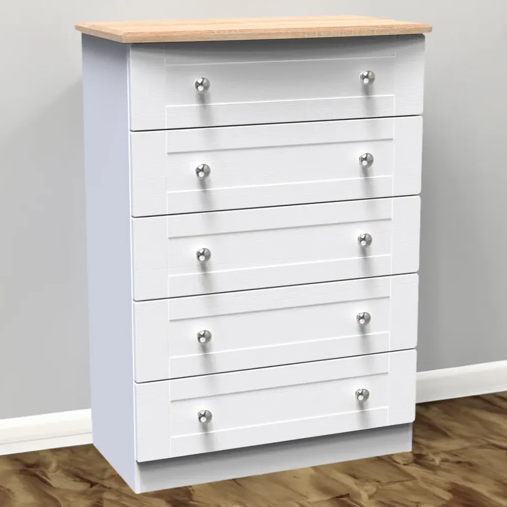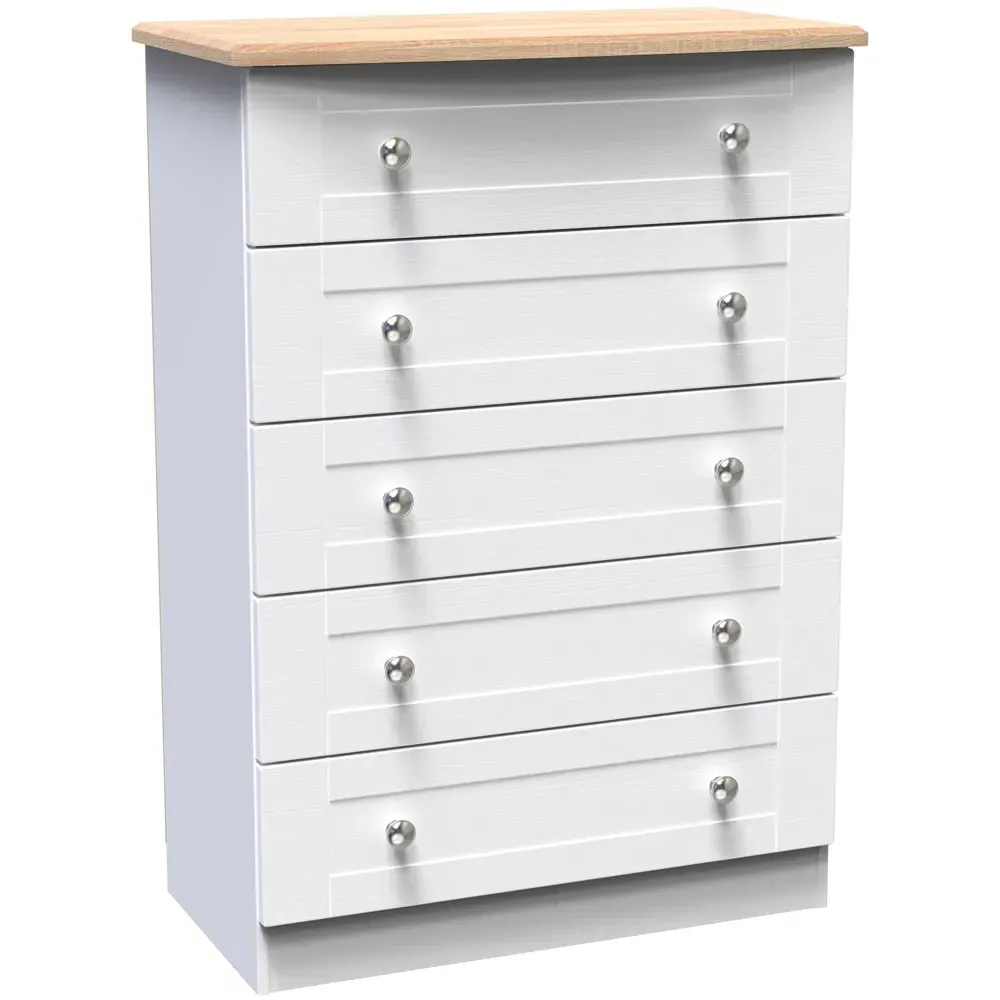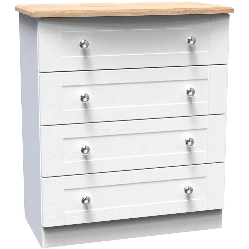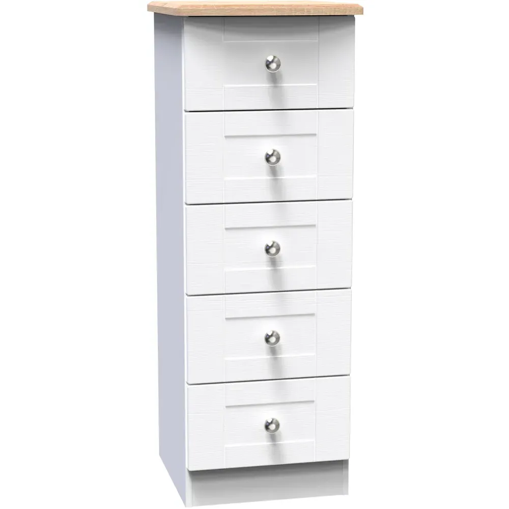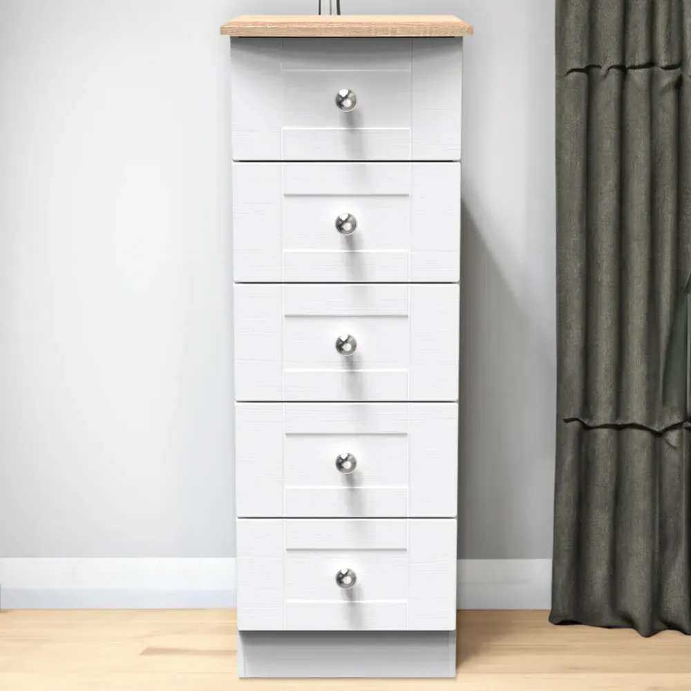 Add a touch of elegance to your space with the Crowndale Sussex 2-Drawer White Ash and Bardolino Oak Bedside Table. With a wood grain effect, panelled design, recessed fronts, contrasting wood top and chrome handles, this unit is practical and stylish in nature. Made in the United Kingdom with the highest quality material, the unit features a traditional design with block panel fronts and polished metal handles. Finished with smooth metal drawer runners and linen-effect drawer lining, the unit has a scratch-resistant surface. It is delivered directly to your location of choice by a two-man delivery team and comes fully assembled. Please note that any handles or legs may be removed during transit to avoid the risk of damage.