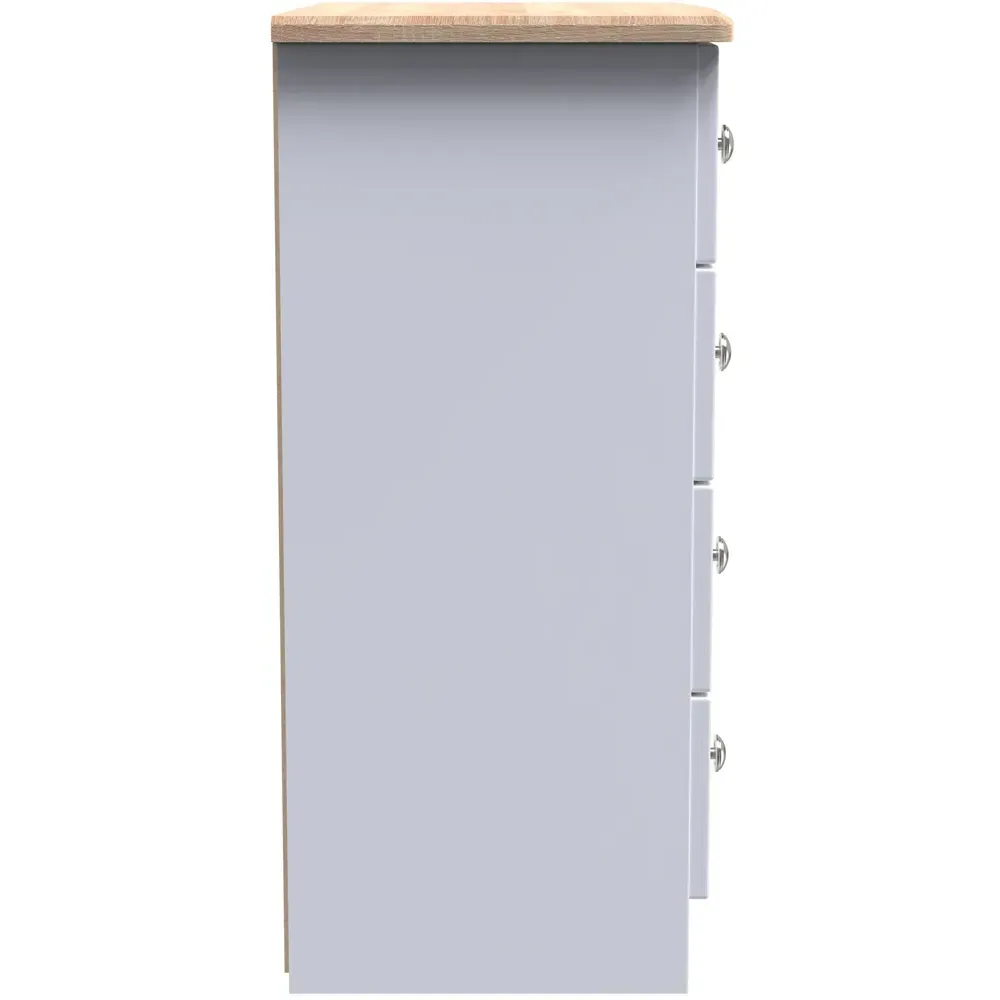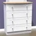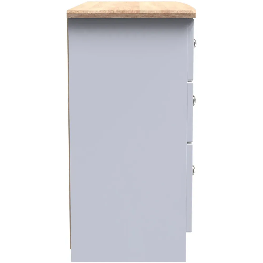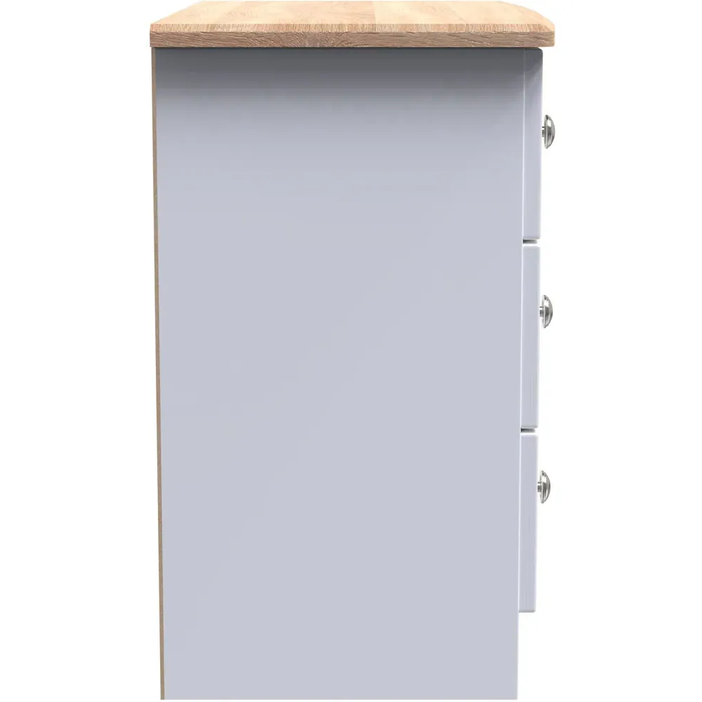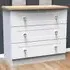 The Sussex bedside table offers white ash and Bardolino oak construction with a wood grain effect and panelled design. Its two drawers feature recessed fronts and chrome handles, while the contrasting wood top adds visual interest. The unit provides smooth metal drawer runners with linen-effect lining and block panel fronts for strength. Made in the United Kingdom with scratch-resistant surfaces and polished metal hardware.