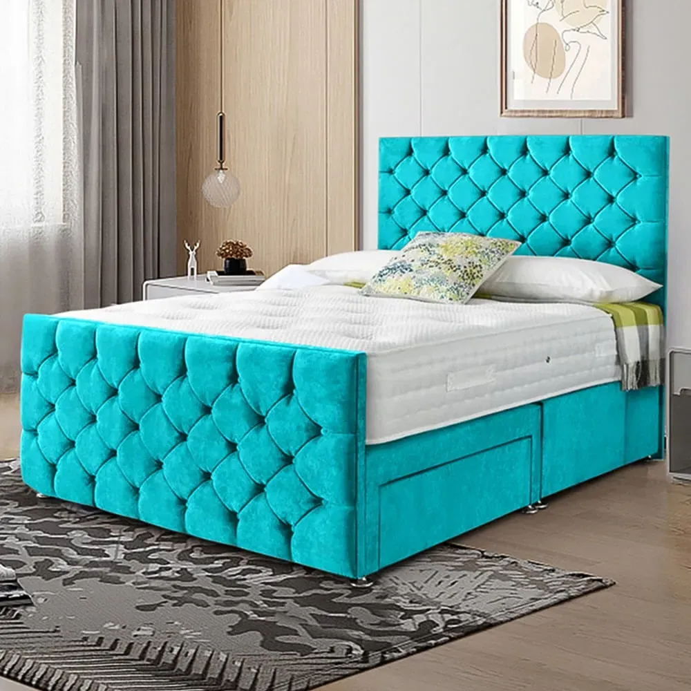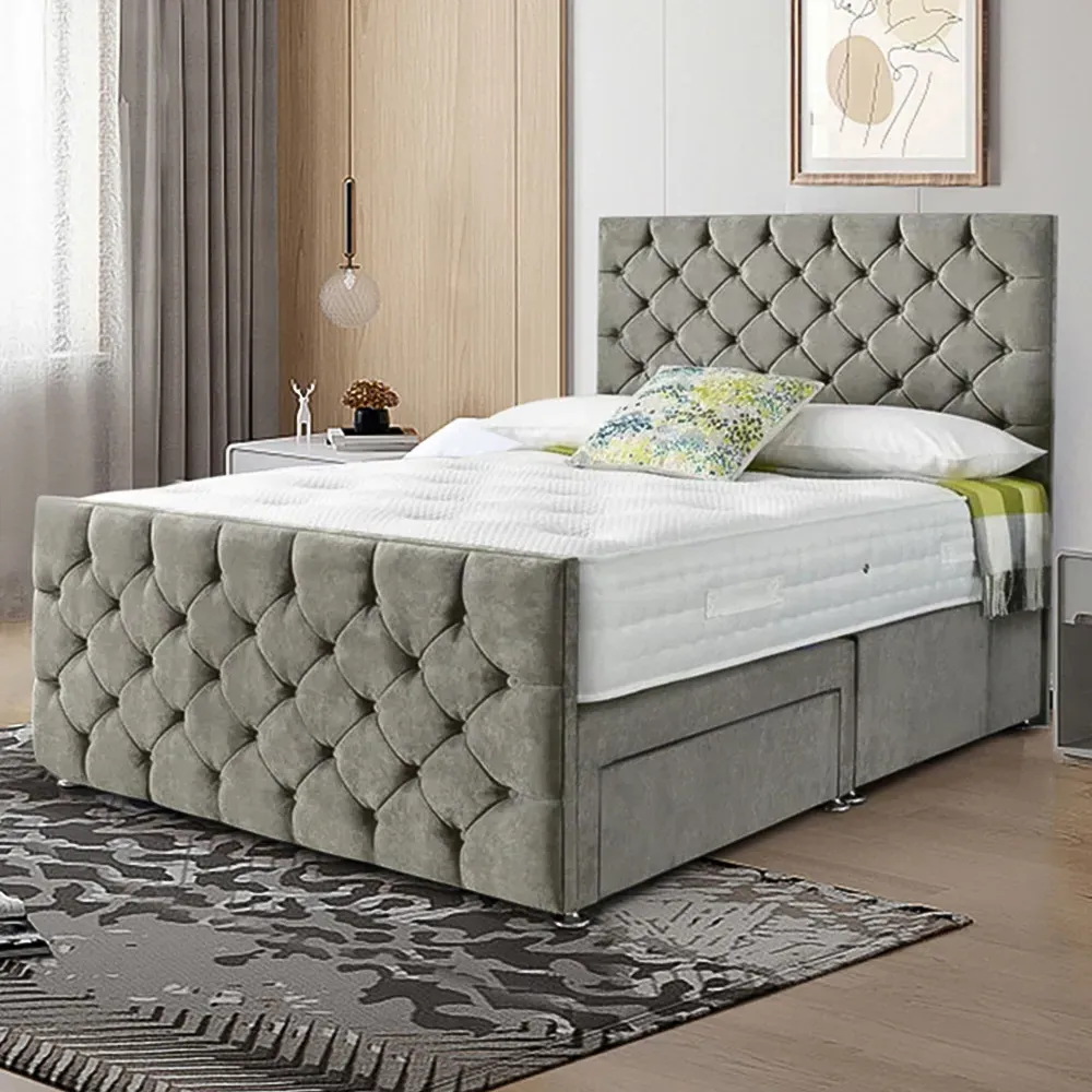 The Dreamscape divan bed combines comfort with practical storage, featuring a single drawer for convenient organization. Its Chesterfield-style headboard features button detailing and plush velvet upholstery that provides a luxurious tactile experience. The handcrafted UK construction ensures lasting durability, while the velvet fabric adds sophistication to the design.