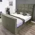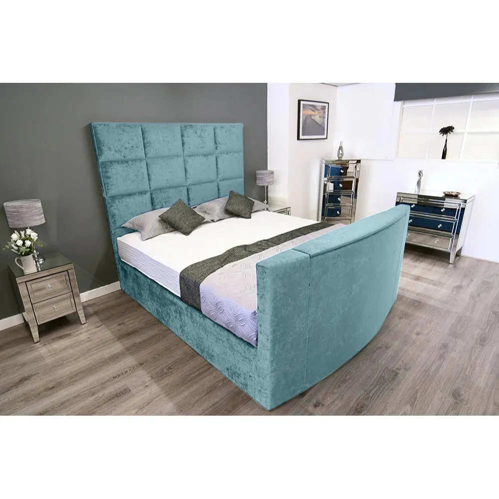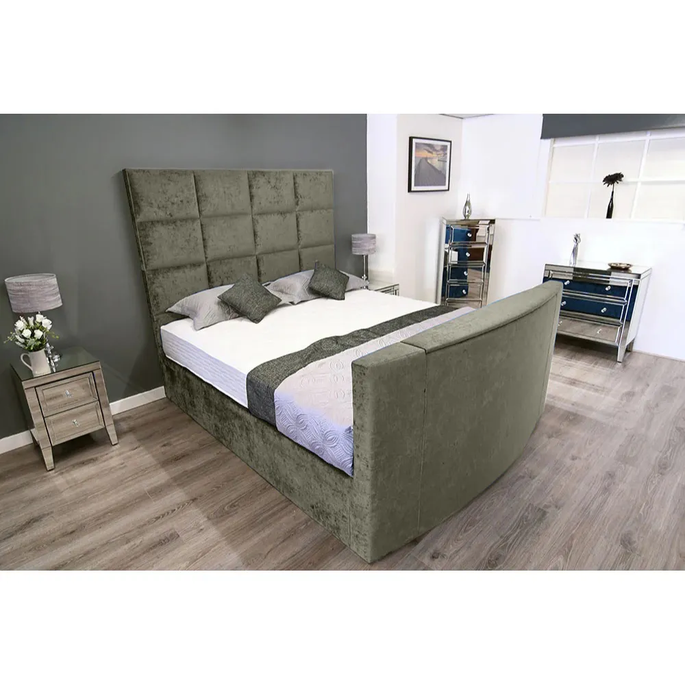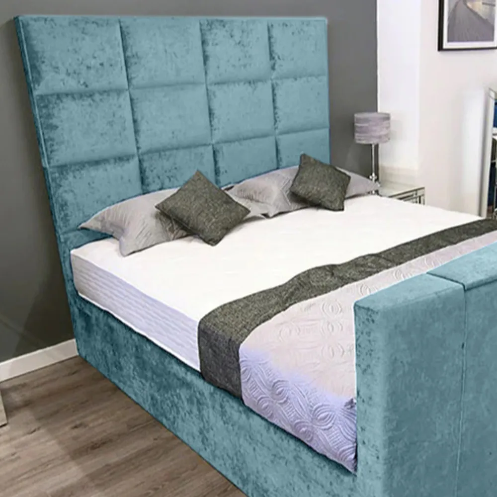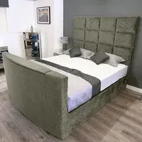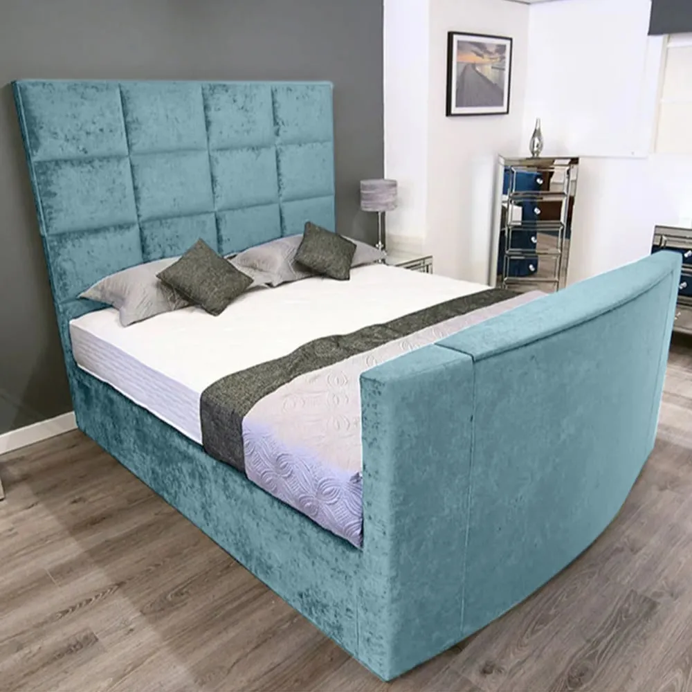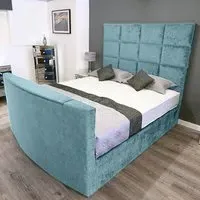 The Lurvi TV Bed Frame combines luxury with functionality, featuring plush velvet upholstery and a unique cubed headboard design. Its built-in TV mechanism accommodates screens from 40" to 75" with VESA 600 x 400 mounting compatibility, while the rounded footboard adds comfort. The remote-controlled TV lift provides convenient entertainment access, and the British craftsmanship ensures lasting durability.