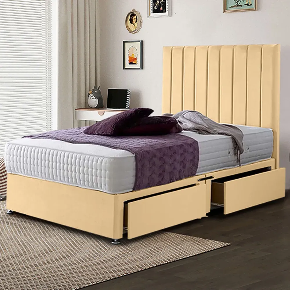 Experience refined elegance and functionality with the Eleganza Home Sleepytime Single Grey Plush Velvet 2 Drawer Divan Bed with Headboard, featuring a 54-inch headboard and two spacious drawers. This plush bed is the epitome of modern luxury, upholstered in sumptuous velvet that adds a rich texture to your bedroom decor. The lined design of the headboard introduces a contemporary aesthetic, while the built-in drawers provide a practical solution for storage, keeping your essentials neatly organised. Perfectly crafted in the UK, this bed is a blend of style, comfort, and convenience, making it an ideal choice for anyone looking to enhance their sleeping space.