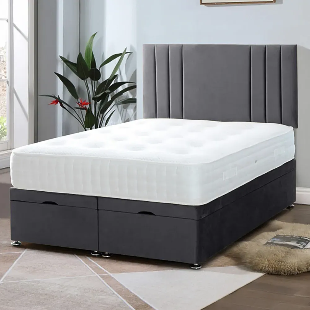 The Slumberlyn Divan Bed combines comfort with practical storage in its ottoman design. Its 54-inch lined headboard provides support while adding visual interest, and the integrated ottoman base offers hidden storage space for bedding and essentials. The plush velvet upholstery delivers a soft texture, while the divan construction ensures stable support and durability.
