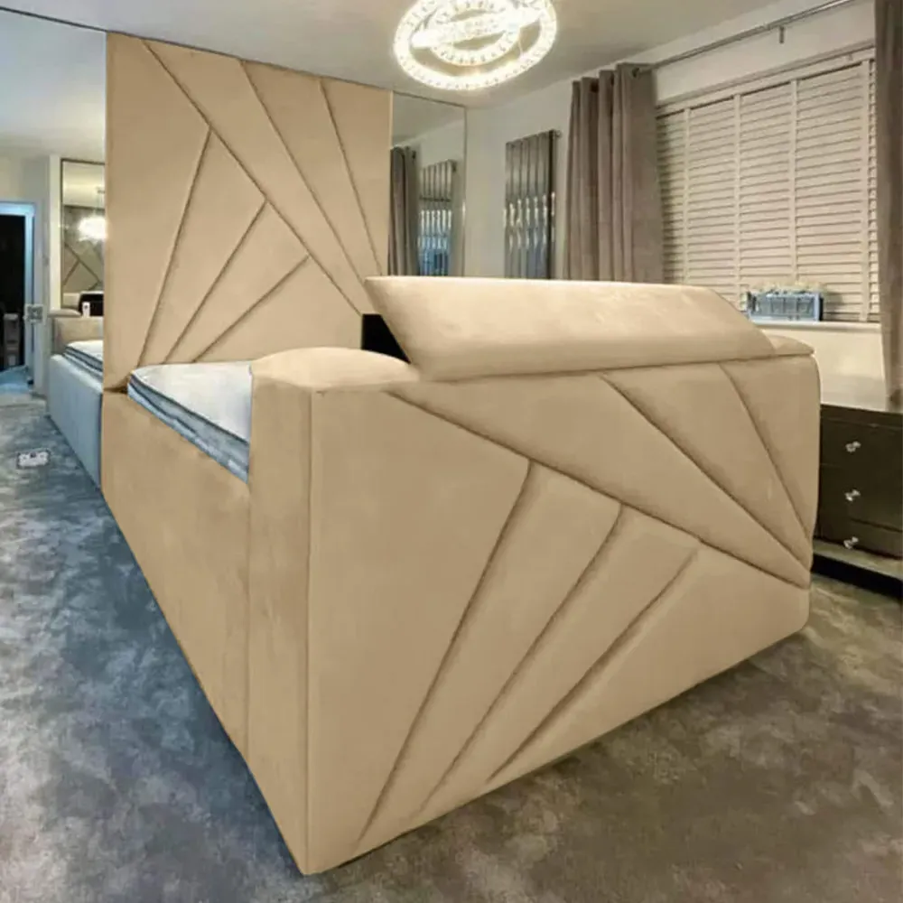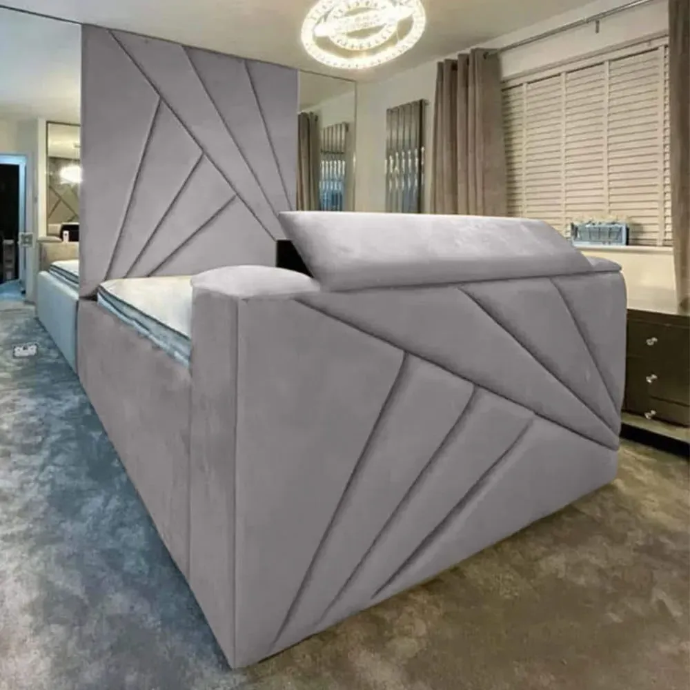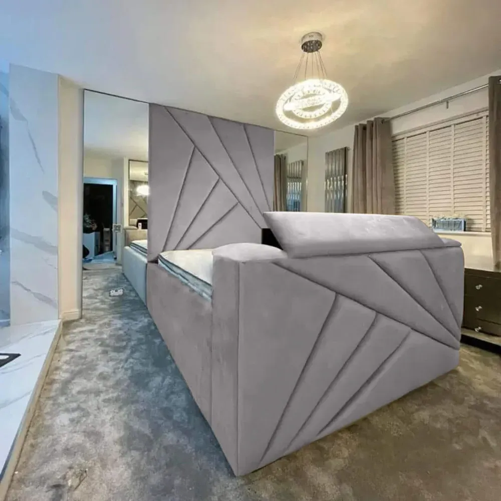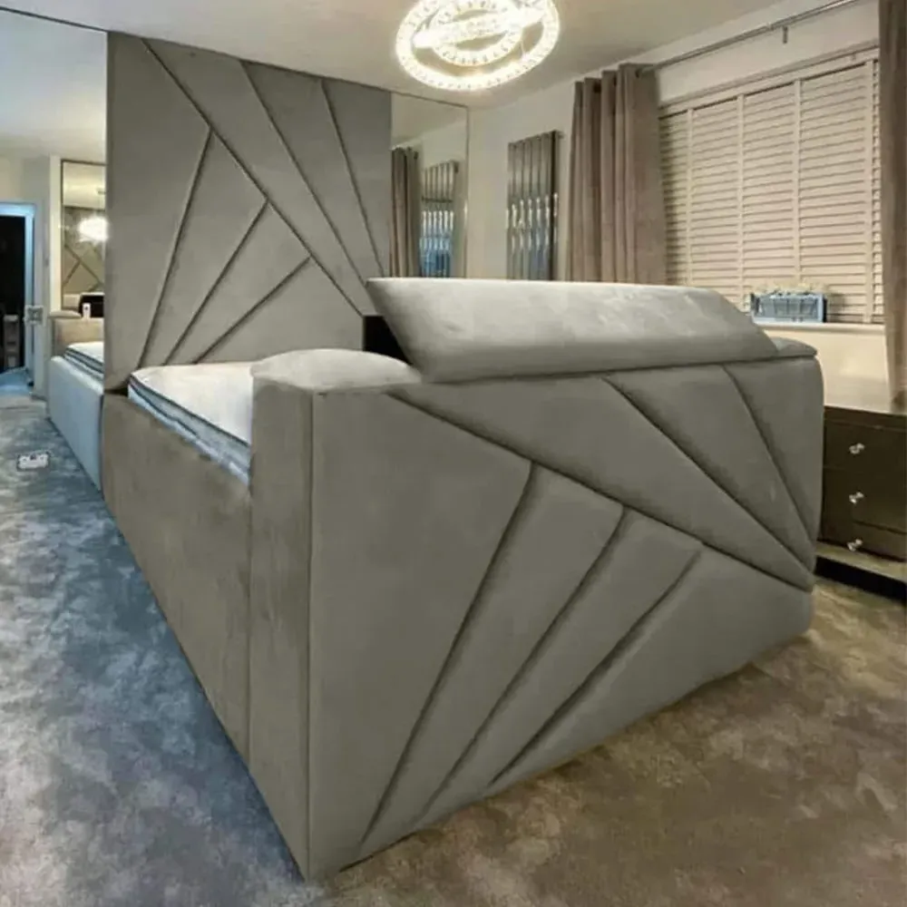 The Tina TV Bed Frame combines comfort with entertainment functionality, featuring a floor-to-ceiling headboard upholstered in plush velvet. Its built-in remote control system accommodates screens from 40" to 75" with VESA mounting compatibility. The steel frame construction provides durability, while the velvet upholstery adds softness and texture. The integrated TV mechanism suits both relaxation and viewing needs.
