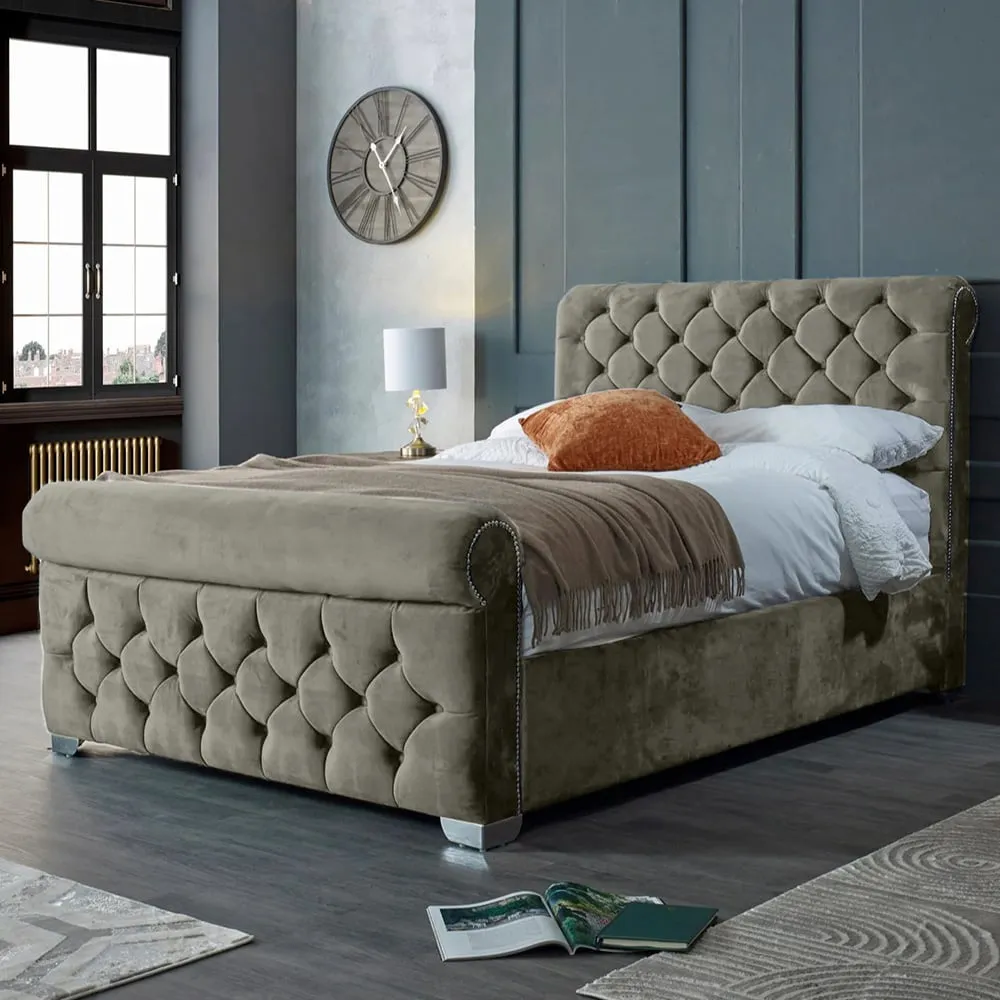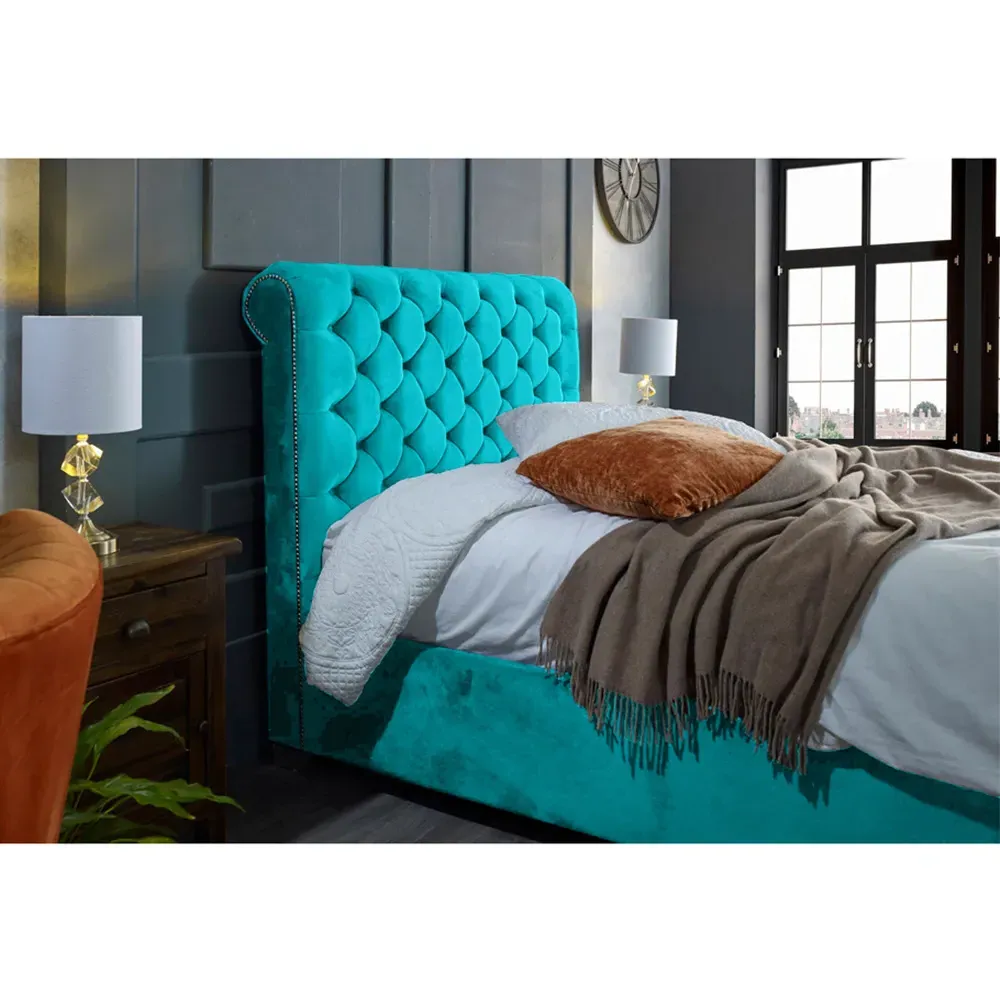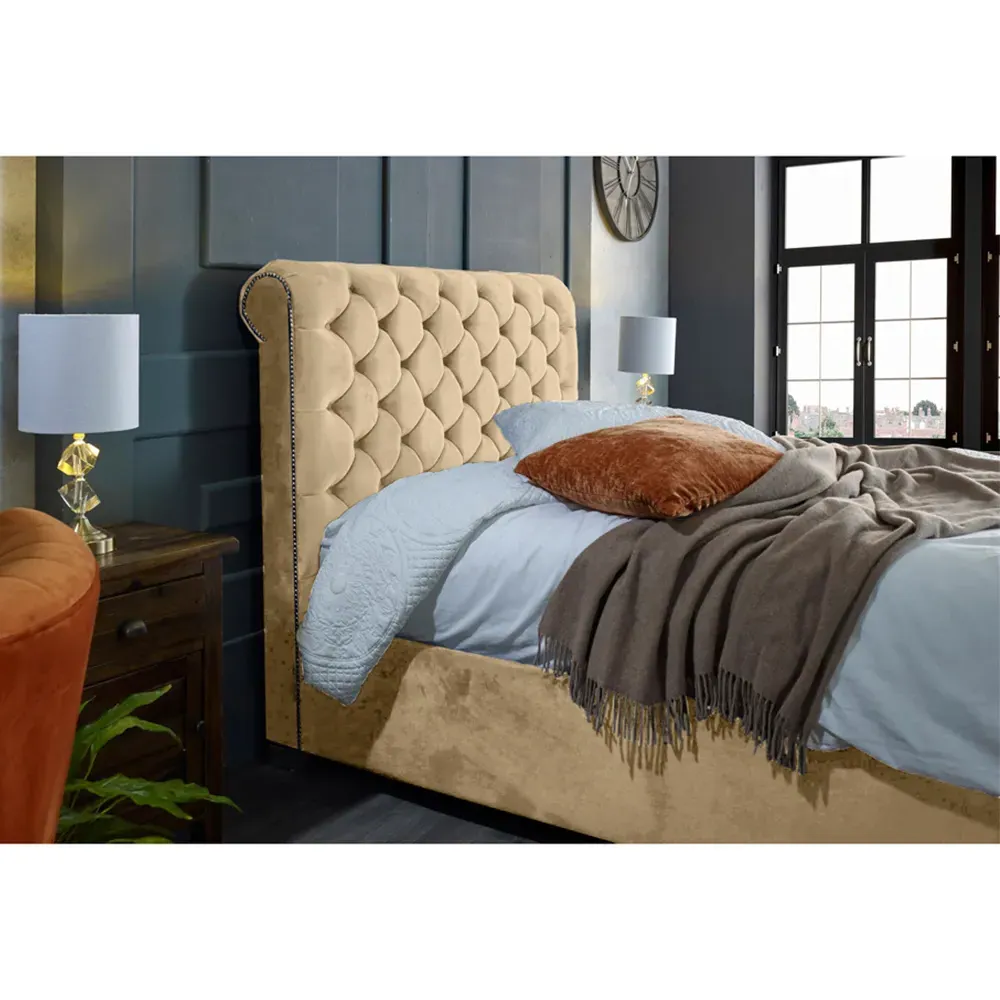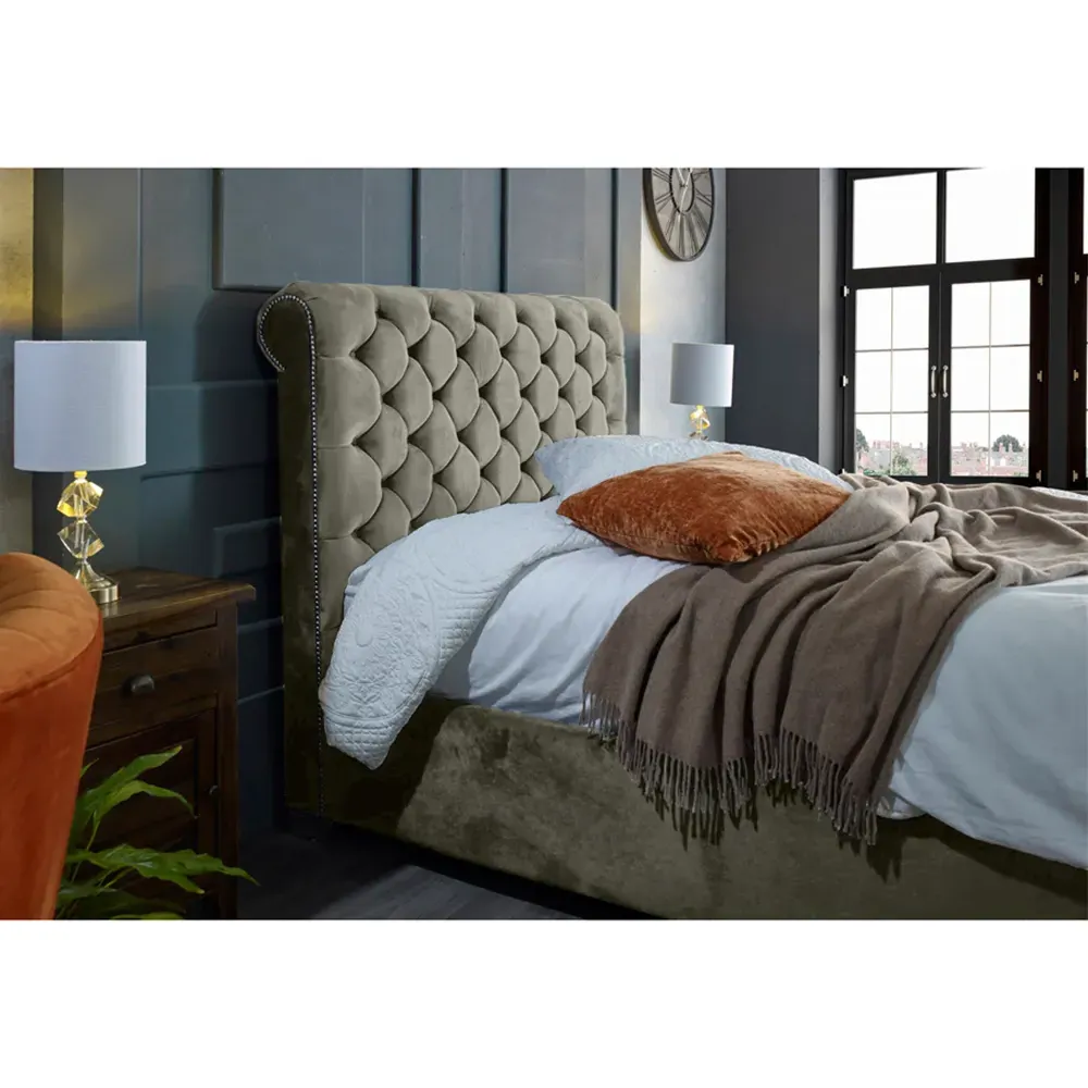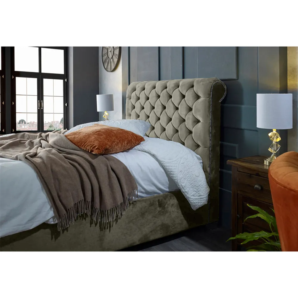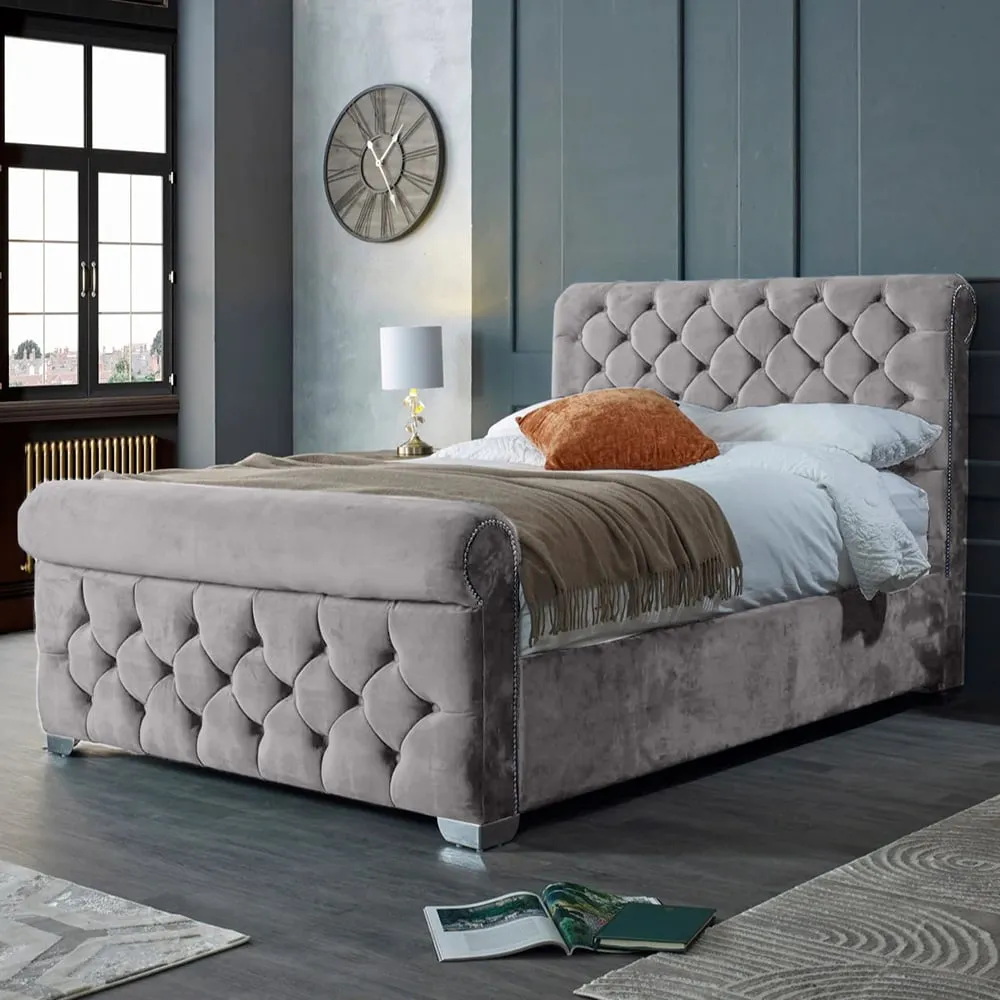 The Veneta Bed Frame offers luxurious comfort with its plush velvet upholstery, featuring a scroll chesterfield design with intricate beading across both headboard and footboard. The deep button tufting provides visual texture while the velvet material adds softness and warmth. Its sturdy construction ensures lasting durability, and the chesterfield styling brings timeless appeal to any space.