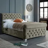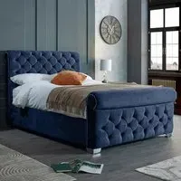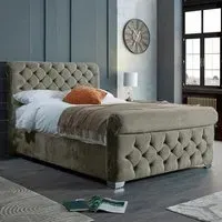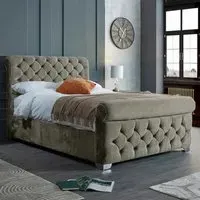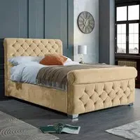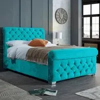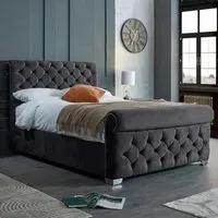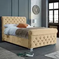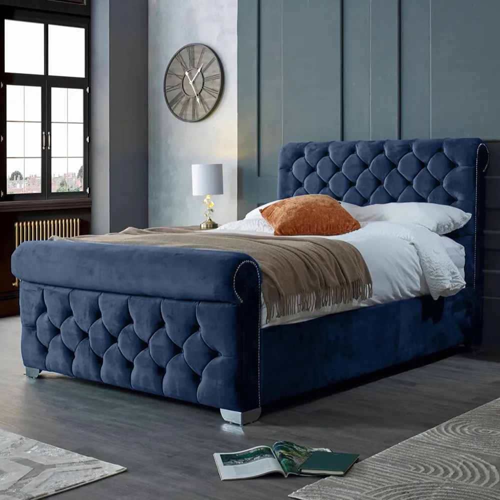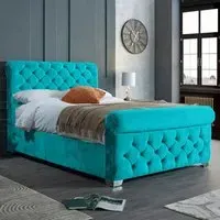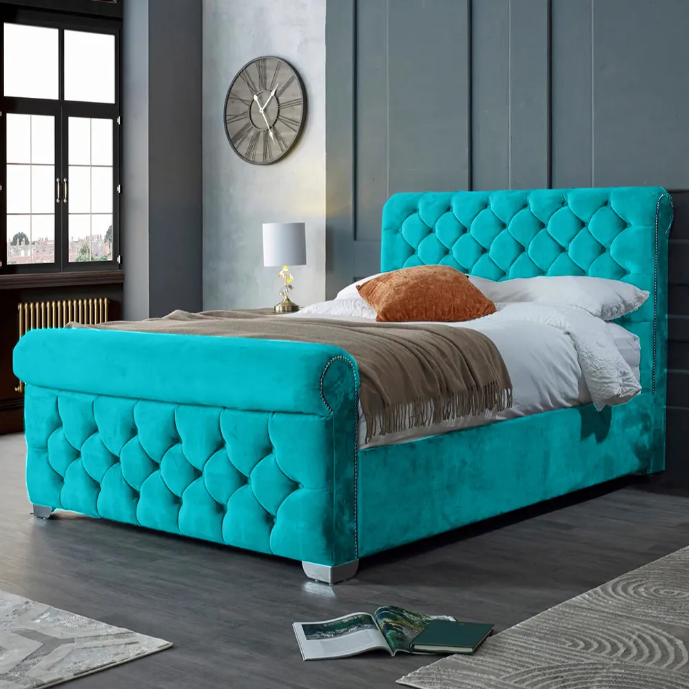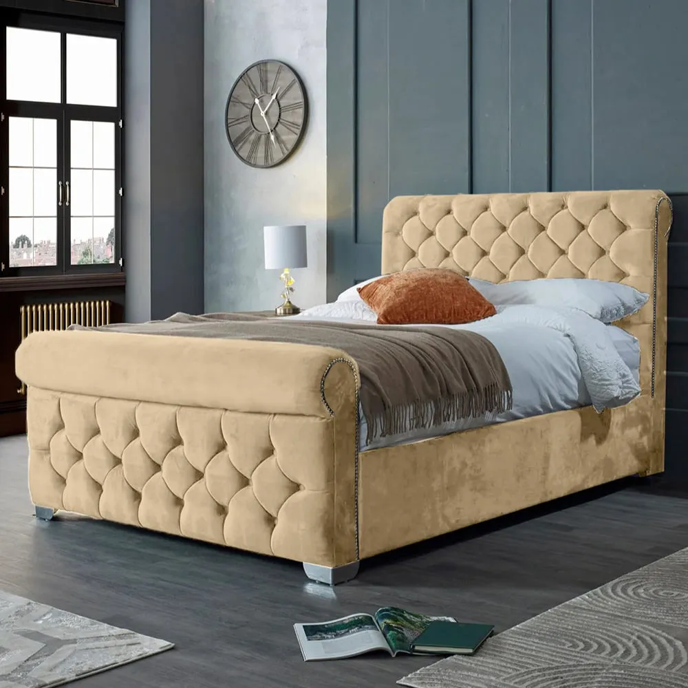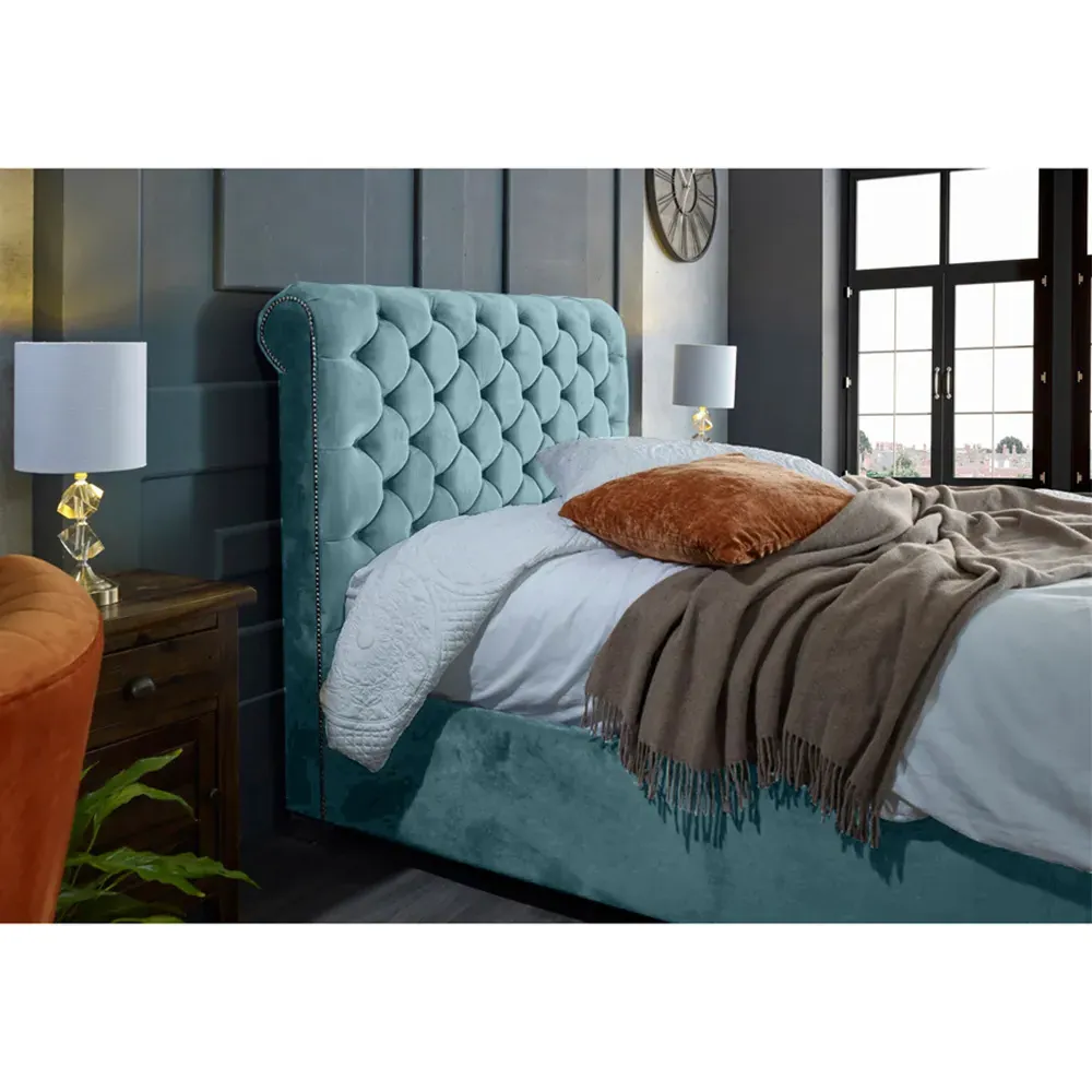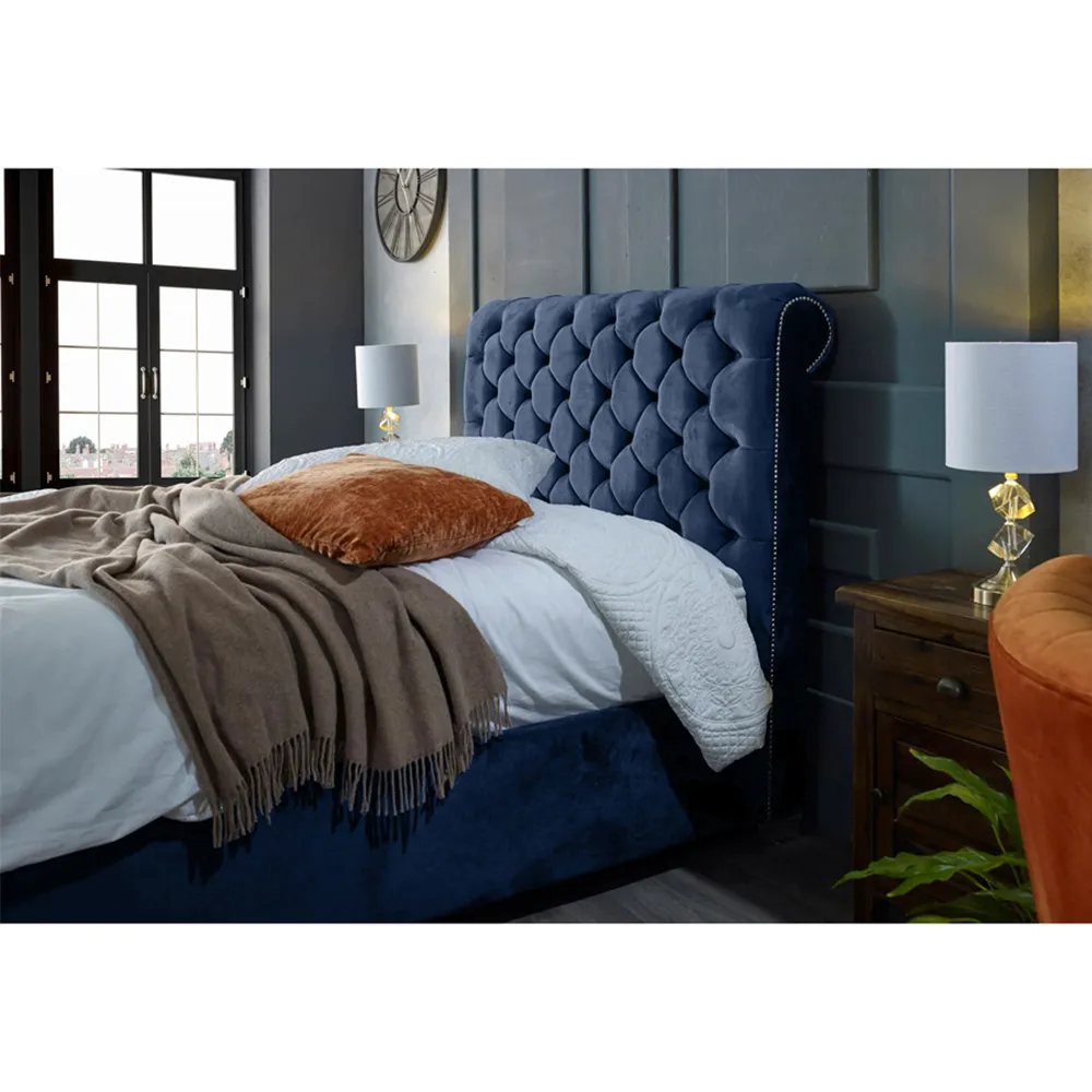 The Veneta Bed Frame offers luxurious comfort with its plush velvet upholstery, featuring a scroll chesterfield design with intricate beading across both headboard and footboard. The deep button tufting provides visual texture while the velvet material adds softness and warmth. Its sturdy construction ensures lasting durability, and the chesterfield styling brings timeless appeal to any space.
