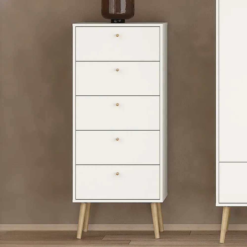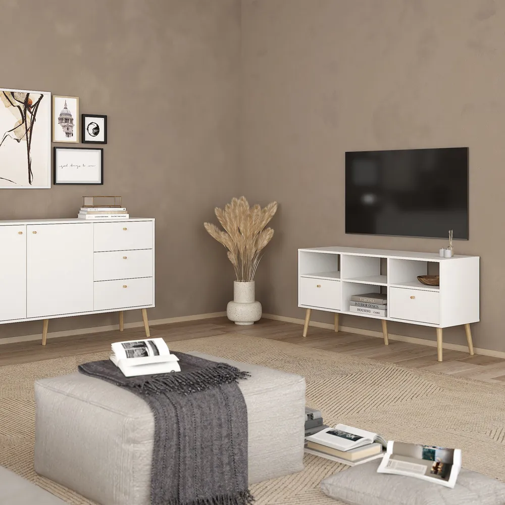 The Florence Cumbria Nightstand features one door and one drawer with simple round handles, supported by sleek wooden legs. Its white finish creates a clean appearance, while the easy-gliding drawer runner ensures smooth operation. The compact design provides bedside storage without overwhelming smaller spaces.