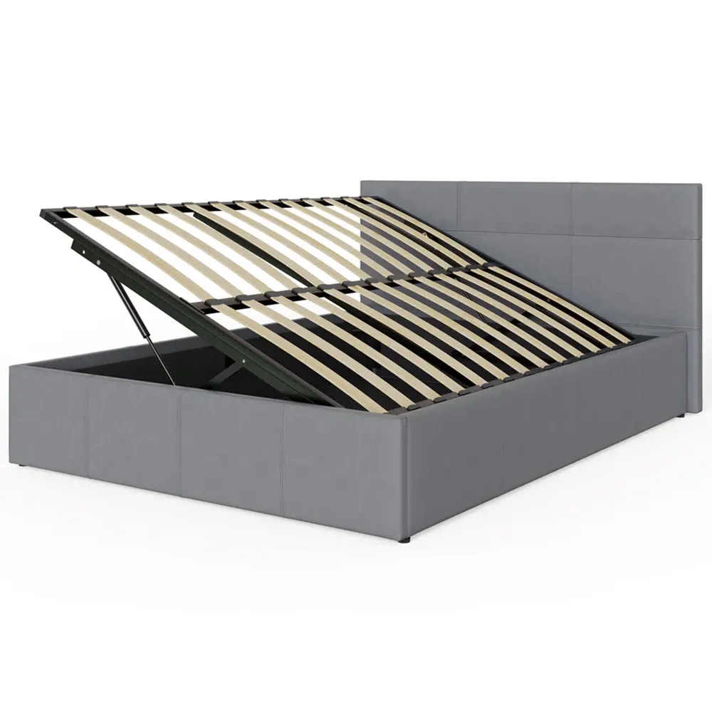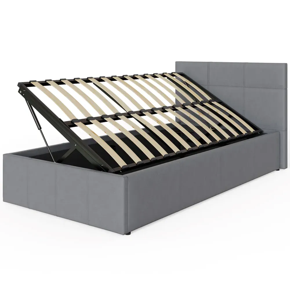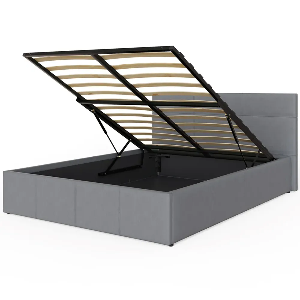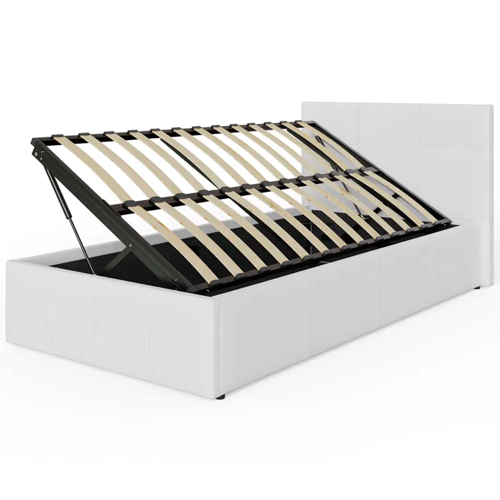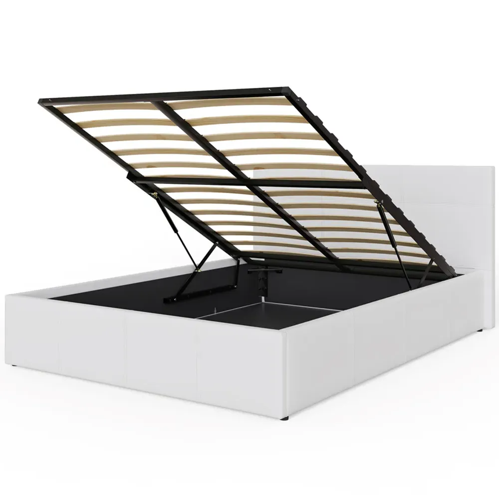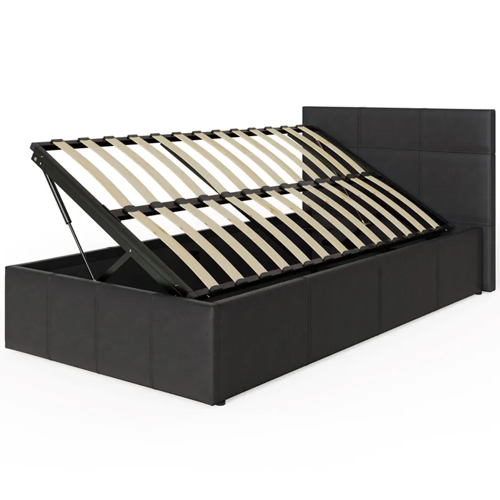 The ottoman bed combines generous storage space with a gas hydraulic lifting system for easy access. Its faux leather frame features stitched detailing on the headboard, while the end-lift mechanism provides convenient access to the lined storage compartment. The ottoman base offers ample space for bedding and clothing, and the hydraulic system ensures smooth operation when accessing stored items.