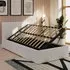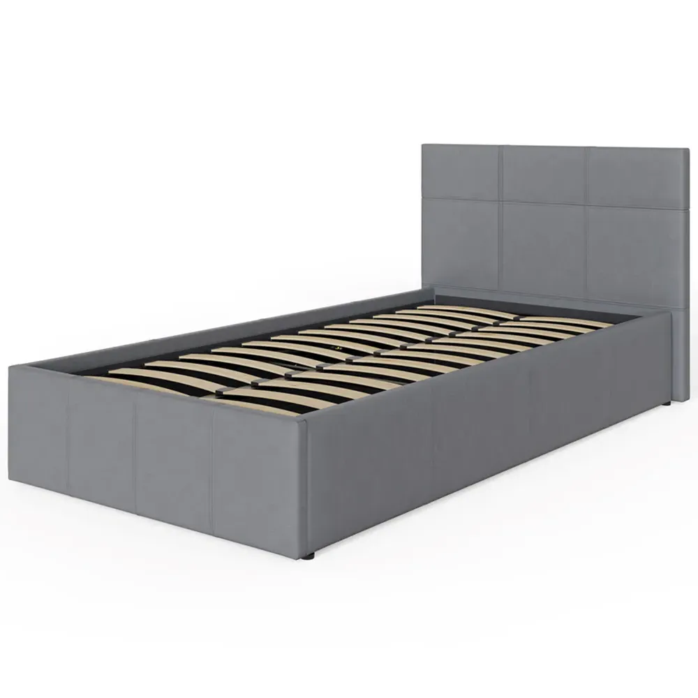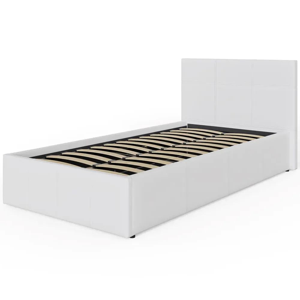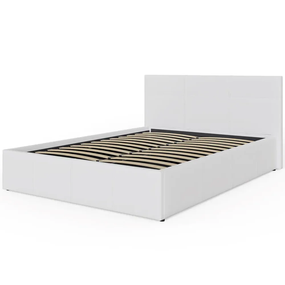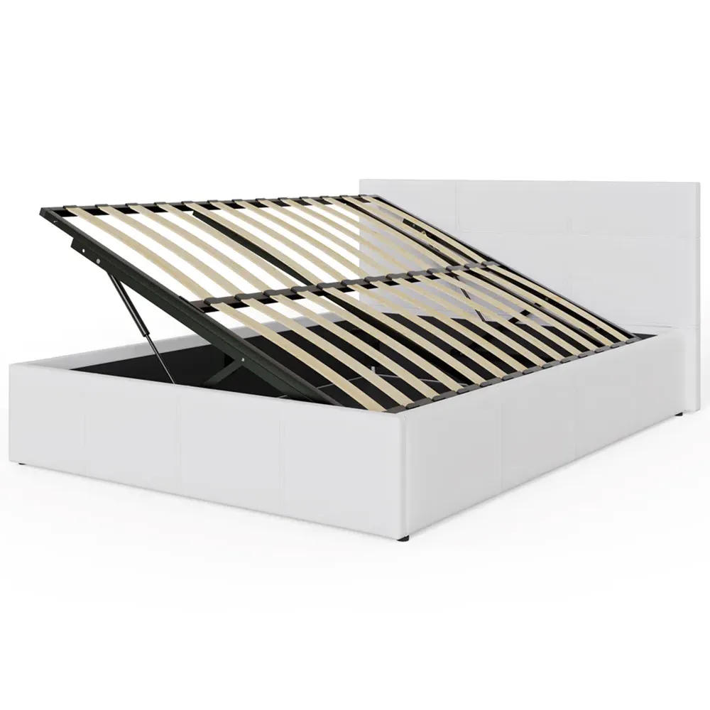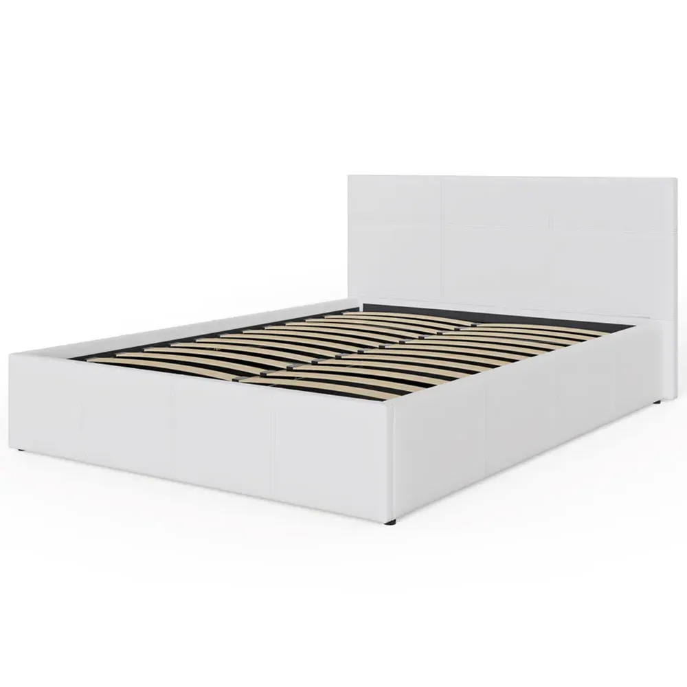 The ottoman bed combines generous storage space with a gas hydraulic lifting system for easy access. Its faux leather frame features stitched detailing on the headboard, while the end-lift mechanism provides convenient access to the lined storage compartment. The ottoman base offers ample space for bedding and clothing, and the hydraulic system ensures smooth operation when accessing stored items.
