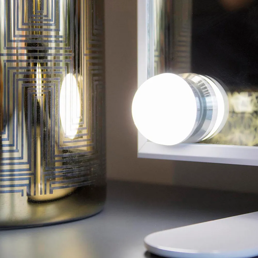 The Veronica Hollywood Vanity Mirror combines old-school glamour with modern LED technology, featuring nine long-lasting LED globe bulbs that provide bright and even illumination. Its touch-button controls offer complete brightness adjustment, while the smart memory function remembers your last lighting setting for convenience. The mirror includes three colour temperature modes and tilts up and down for the perfect viewing angle. With its lightweight white metal frame and 2m cable connection, it plugs directly into any socket without requiring hardwiring.