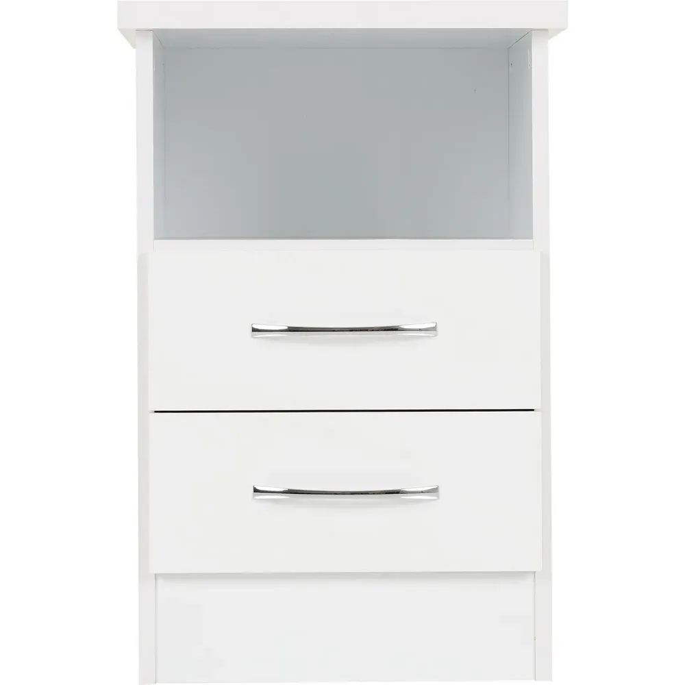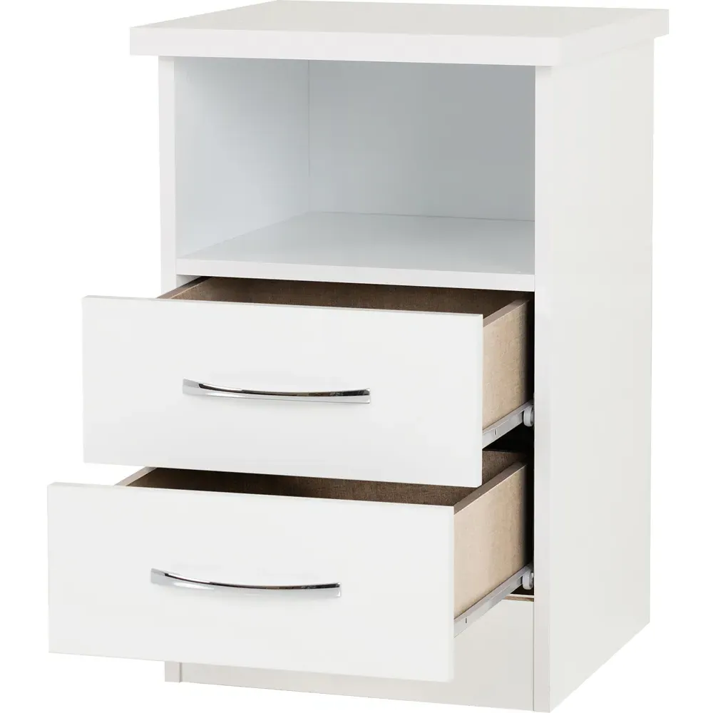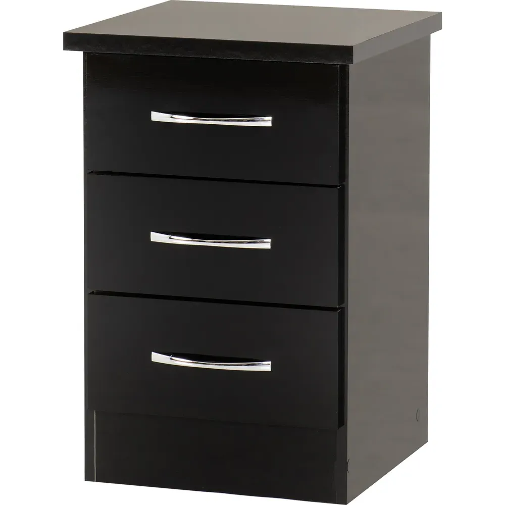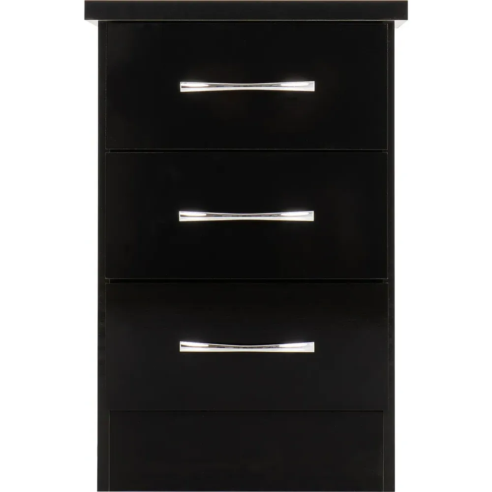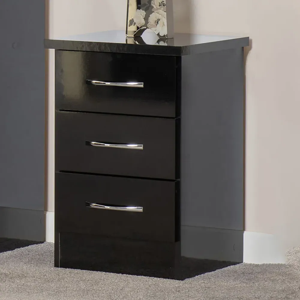 The Seconique Nevada Black Gloss Bedside Table is an elegant and functional piece for your bedroom. Featuring two drawers, it provides ample storage for your night-time necessities. Its robust construction ensures durability, while the metal handles and drawer runners add a touch of sophistication.
