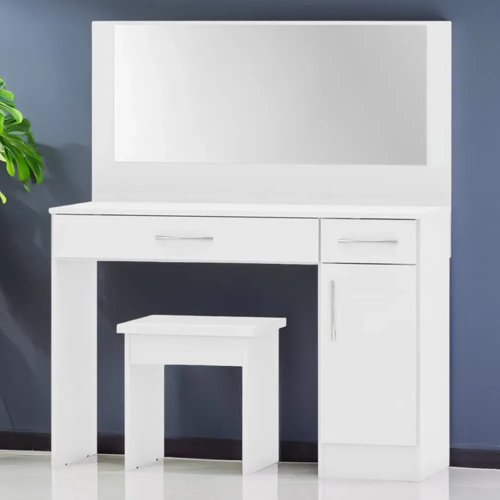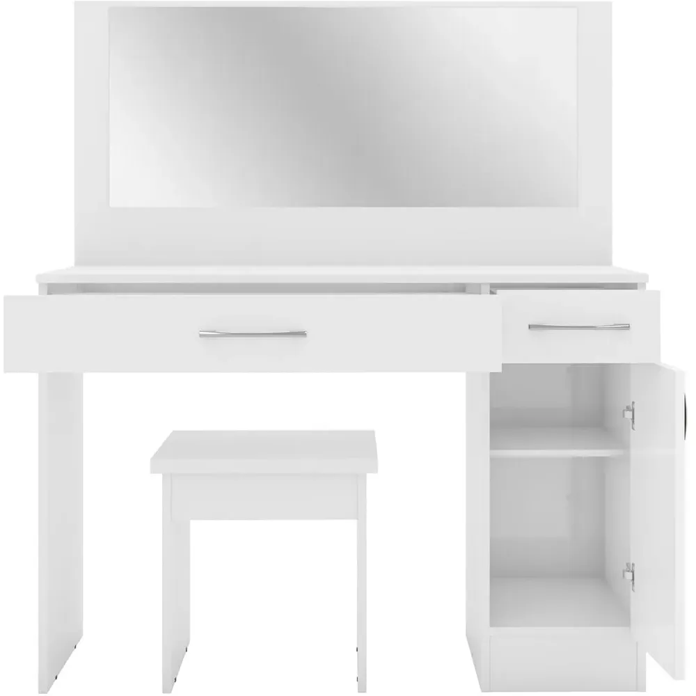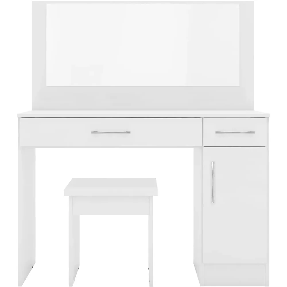 The Nevada Dressing Table Set offers a complete grooming solution with its matching table, stool, and mirror. Its four drawers feature metal handles for organized storage of beauty essentials, while the gloss finish adds durability and easy maintenance. The coordinated stool provides comfortable seating, and the included mirror completes this functional bedroom ensemble.