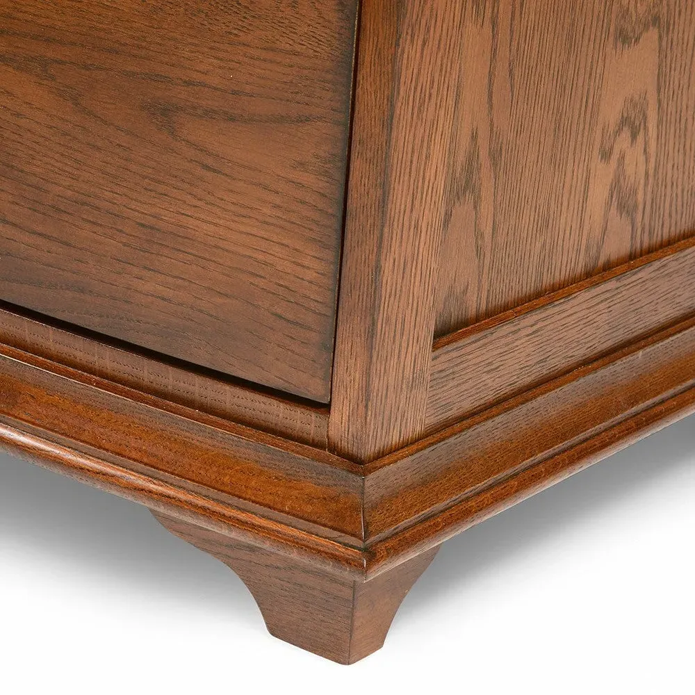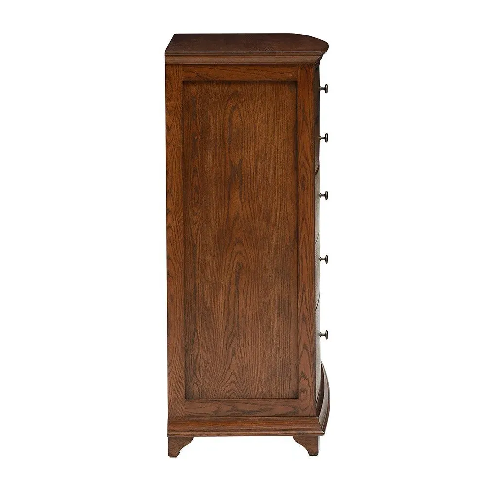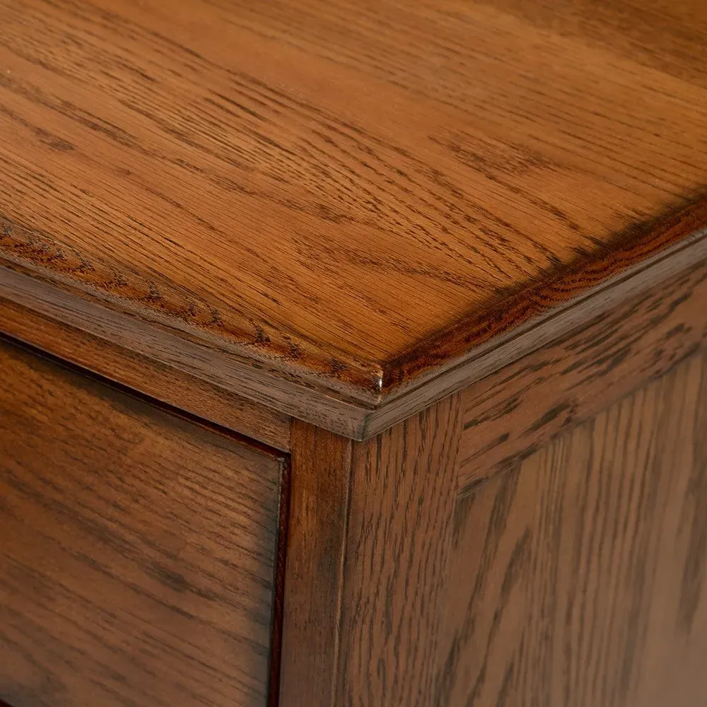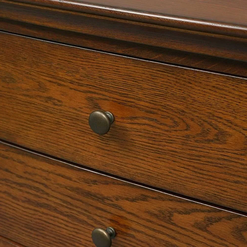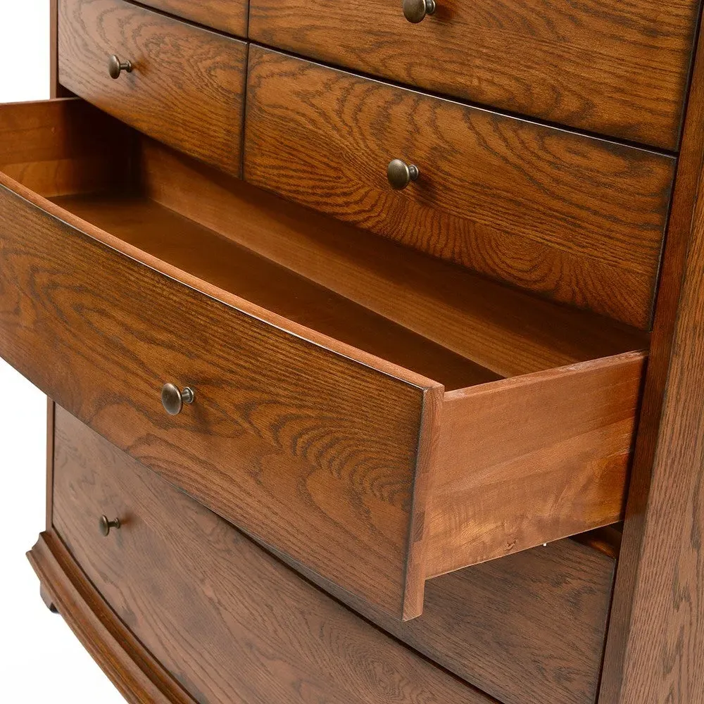 The chest of drawers offers ample storage with its softly curved bow front that enhances the antique-inspired design. Featuring two smaller and three larger soft-close drawers, it provides generous storage space while the deep natural grain adds character. The antiqued metal handles combine with delicate cornicing and traditional woodwork for durability. Hand-finished with stains and glazes to achieve the Dark Oak tone, it is sealed with lacquer to protect the oak's natural grain traces.