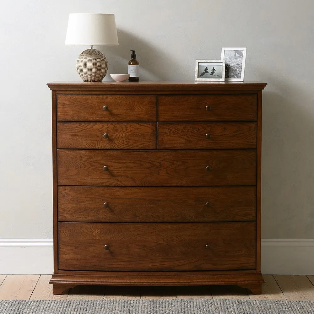 With a softly curved bow front that enhances its antique-inspired design, this elegant and timeless chest of drawers features two smaller and three larger soft-close drawers - offering ample storage for a master or guest bedroom. Inspired by a Georgian bow-fronted chest spotted at an antiques market, the Winchcombe range features a deep, natural grain, soft-close drawers and generous storage - thanks to its elegantly curved shape - that make every piece a pleasure to live with. It combines antiqued metal handles and delicate cornicing with traditional woodwork for a timeless feel. Entirely by nature, no two pieces are ever the same. To preserve the oak's natural beauty, the timber is hand-finished with a combination of stains and glazes to achieve its Dark Oak tone. It is then sealed with lacquer to protect the oak's subtle, natural grain traces.