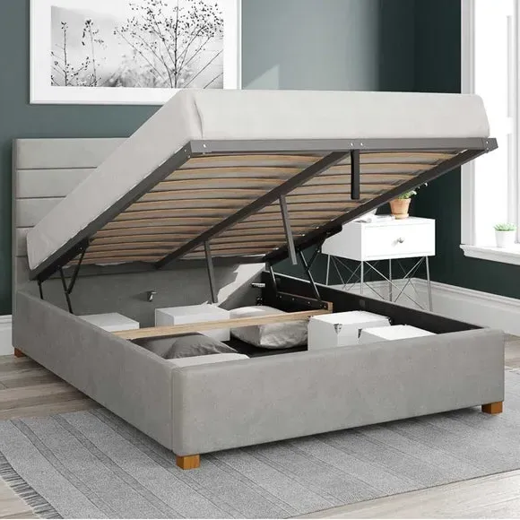 * Large storage area with fabric dust protection sheet* Hands free access to storage (mattresses up to 60kg)* Clean lines headboard design* Plush velvet fabric* Hand upholstered with deep padding* Solid hardwood feet* Manufactured in the UK* Different colour options available While your bedroom remains stylish, you will be blessed with the opportunity for extra storage space with this ottoman bed. The Kelly Fabric Ottoman Bed features beautiful clean lines and exudes minimalist yet elegant style. The deep padded headboard boasts a sleek and clean aesthetic, while the stylish solid hard wood feet add a touch of elegance. With its gas lift pistons, the ottoman bed provides ample storage space that can be easily accessed with minimal effort. Once the mechanism is open, it will hold in place, allowing for hands-free access to the spacious storage area. For your added convenience, the bed comes complete with a dust sheet to keep the storage area clean. It's worth noting that the storage area is not a boarded base. To provide you with the ultimate comfort and support, the bed features quality spring slats, ensuring you have a good night's sleep. And with a mechanism capable of lifting a mattress weighing up to 60kg, you can rest easy knowing you're getting the best in practicality and durability. The bed is supplied flat pack, and assembly is made easier with two people. It takes just 1-2 hours to assemble and meets all UK safety standards. We've also gone above and beyond by conducting non-mandatory structural testing, giving you peace of mind knowing your new bed is built to last.