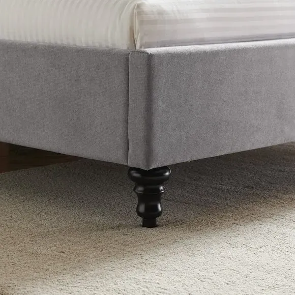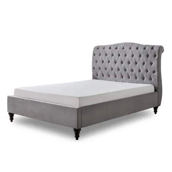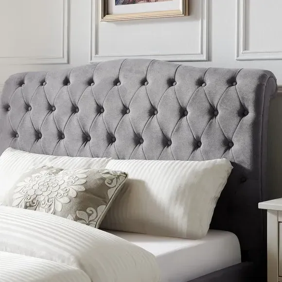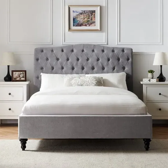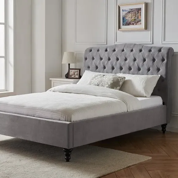 * Velvet upholstered bed* High headboard* Tufted, button back design* Flat slatted base* Wooden scroll legs* Classic design with a modern finish You’re worthy of a big night’s sleep. Plush velvet upholstery and a button-back design gives your room an instant shot of glamour, while the high headboard and wood legs give it an undeniably classic feel.