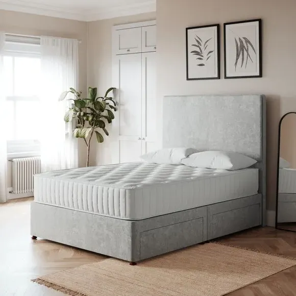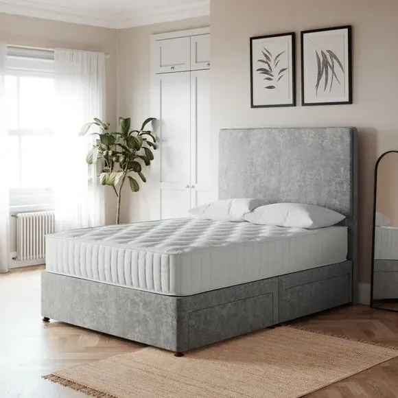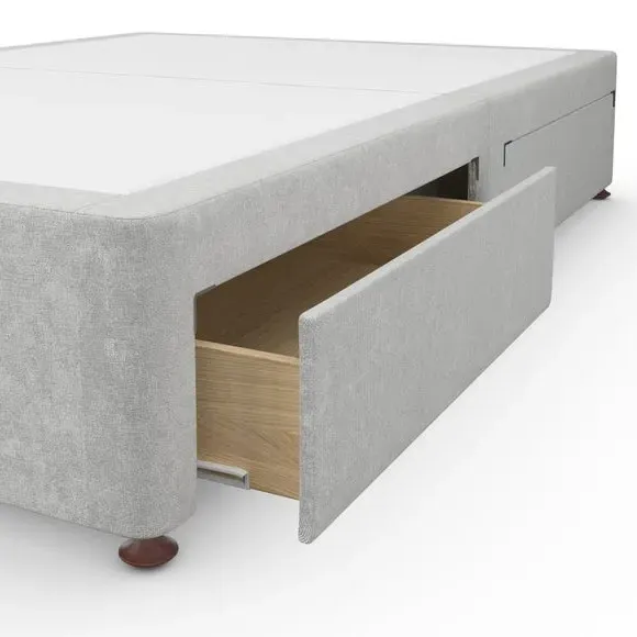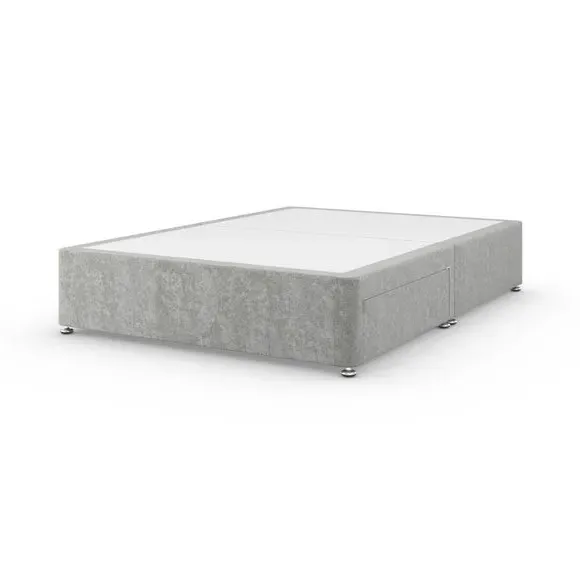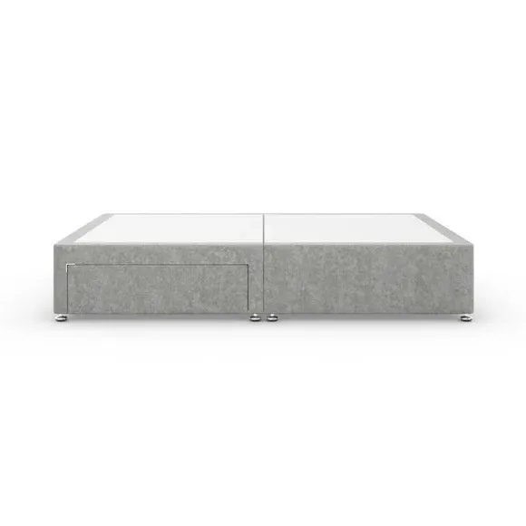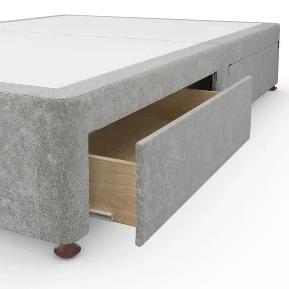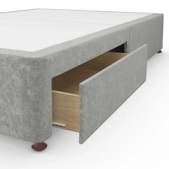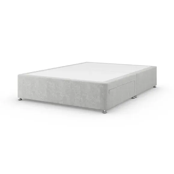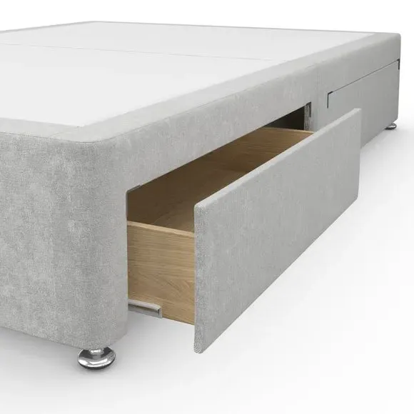 The divan base offers excellent mattress support with its high-quality timber construction and luxury platform top design. Its padded chenille covering provides comfort and durability, while the chrome glider feet add a refined finishing touch. The reinforced base accommodates all mattress types and headboard styles, and the available drawer storage options create practical space-saving solutions.