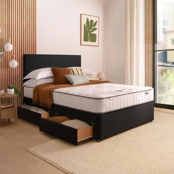 The divan bed combines comfort with its fabric Paris headboard and includes an 800 pocket sprung mattress. Its Mirapocket technology features individual pocket springs that adapt to body weight, while the zoned support system ensures even weight distribution and spinal alignment. The medium-firm mattress provides responsive support with plump filling layers and a soft knitted cover, and the hypoallergenic finish adds peace of mind.