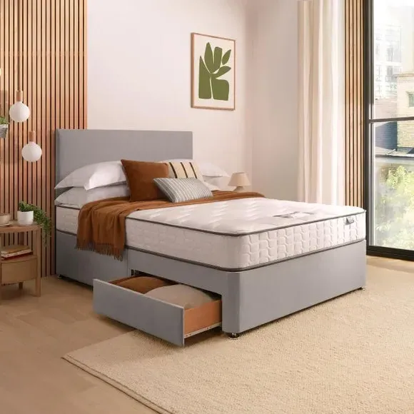 * Divan Bed* Bed Mounted Headboard* Includes Mattress* Soft, Fabric Upholstery This all-inclusive divan set seamlessly marries functionality and elegance, featuring, a refined headboard, and an extraordinary 800 pocket mattress. Silentnight's cutting-edge Mirapocket technology takes centre stage, providing 800 individual pocket springs for unparalleled comfort, support, and pressure relief. The zoned Mirapocket support system ensures even weight distribution, promoting effortless movement and enhancing spinal alignment, while the edge-to-edge support creates a haven for an undisturbed night's sleep. The mattress's responsive pocket springs adapt to your body weight, delivering a luxurious blend of comfort and personalised support. Plump filling layers and a sumptuously soft knitted mattress cover add to the lavishness, with a hypoallergenic finish for peace of mind. The medium-firm comfort rating caters to those who transition between back and side sleeping positions. Please note, the mattress binding colour may differ slightly from image. This does not affect the quality or use of the final product.
