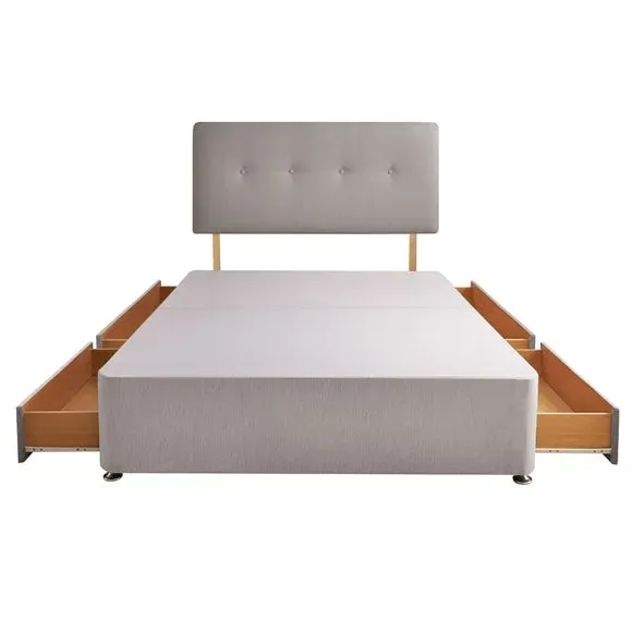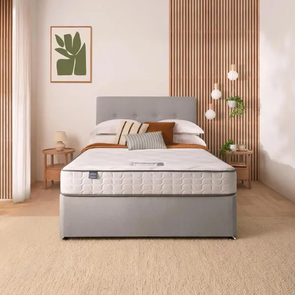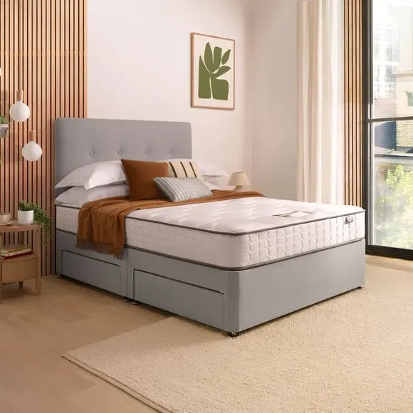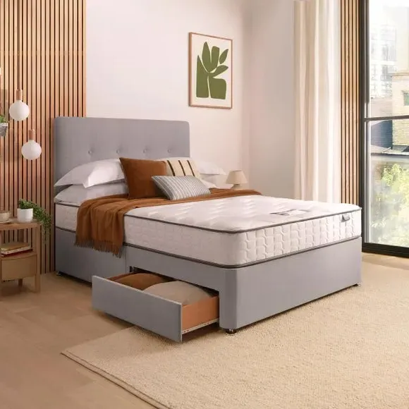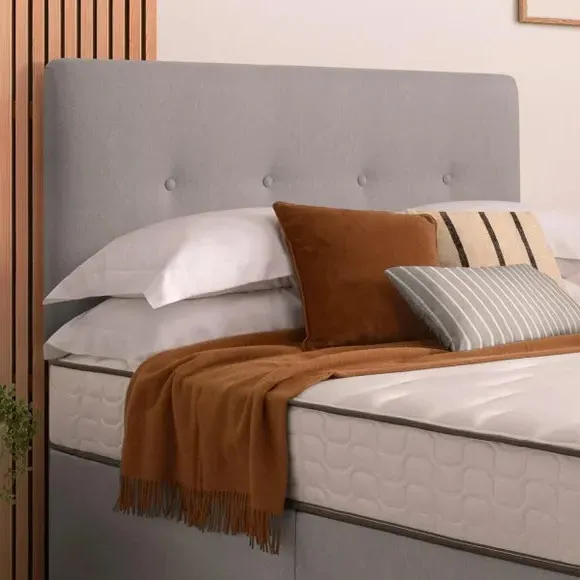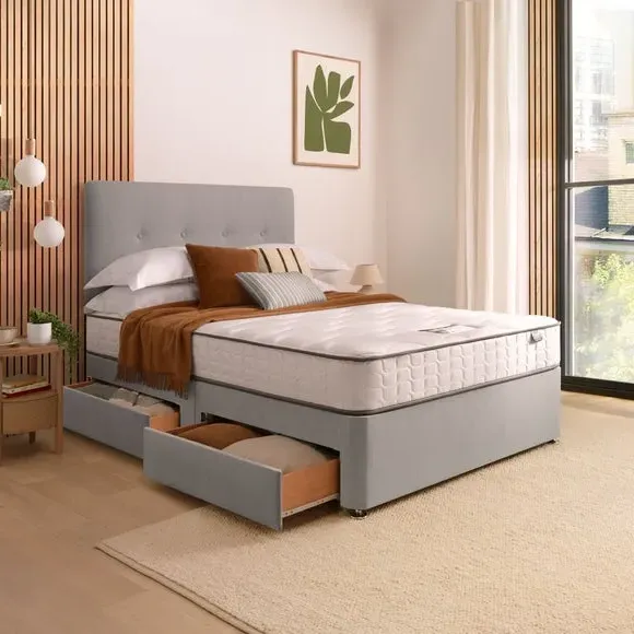 * Divan Bed* Bed Mounted Headboard* Includes Mattress* Soft fabric Upholstery This all-inclusive divan set seamlessly marries functionality and elegance, featuring a refined headboard, and an extraordinary 800 pocket mattress. Silentnight's cutting-edge Mirapocket technology takes centre stage, providing 800 individual pocket springs for unparalleled comfort, support, and pressure relief. The zoned Mirapocket support system ensures even weight distribution, promoting effortless movement and enhancing spinal alignment, while the edge-to-edge support creates a haven for an undisturbed night's sleep. The mattress's responsive pocket springs adapt to your body weight, delivering a luxurious blend of comfort and personalised support. Plump filling layers and a sumptuously soft knitted mattress cover add to the lavishness, with a hypoallergenic finish for peace of mind. The medium-firm comfort rating caters to those who transition between back and side sleeping positions. Please note, the mattress binding colour may differ slightly from image. This does not affect the quality or use of the final product.