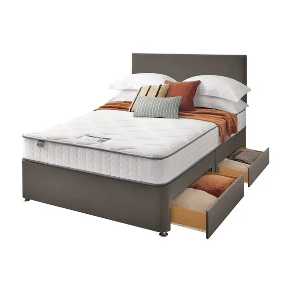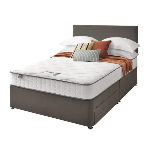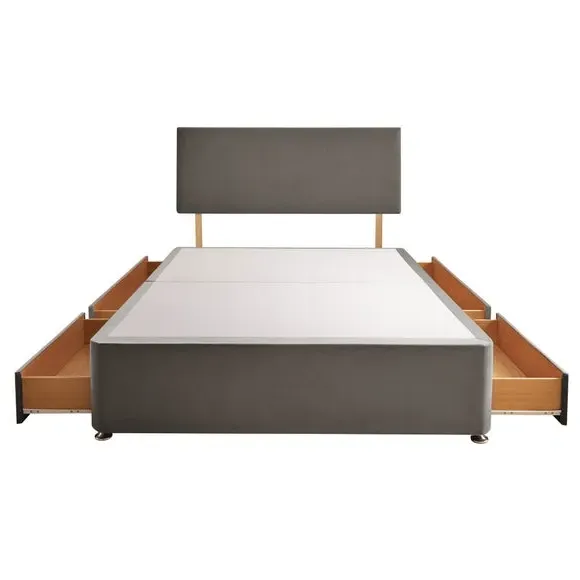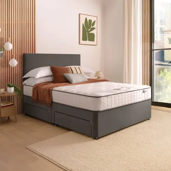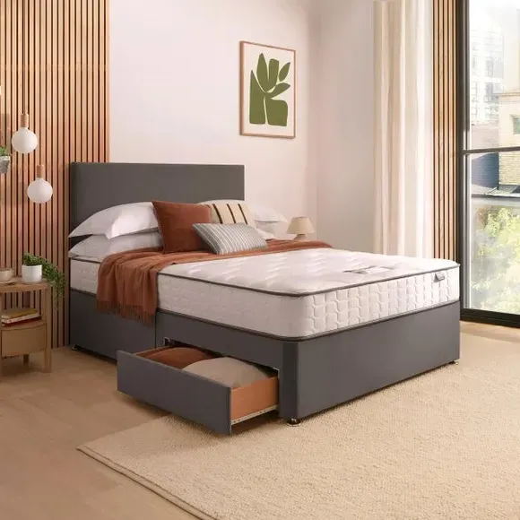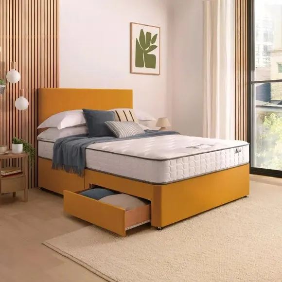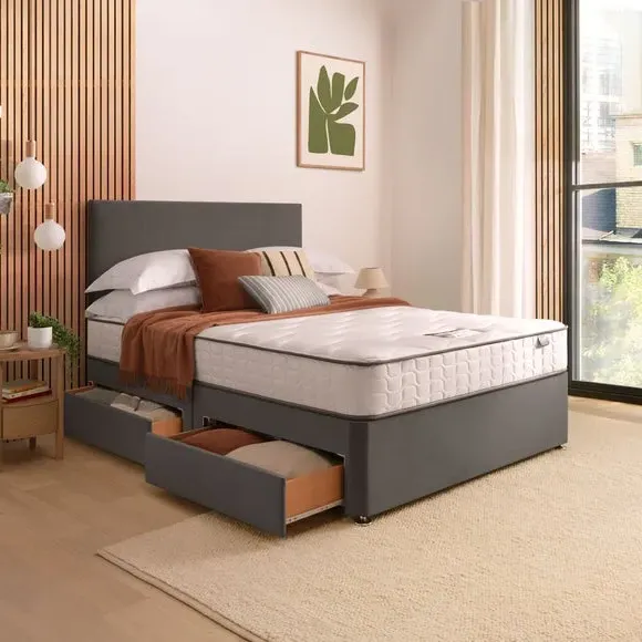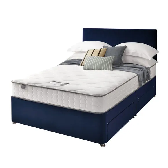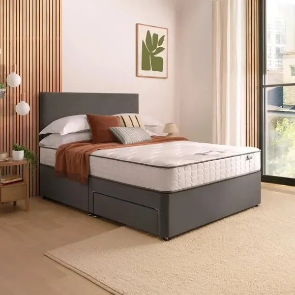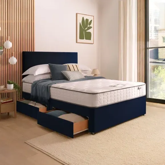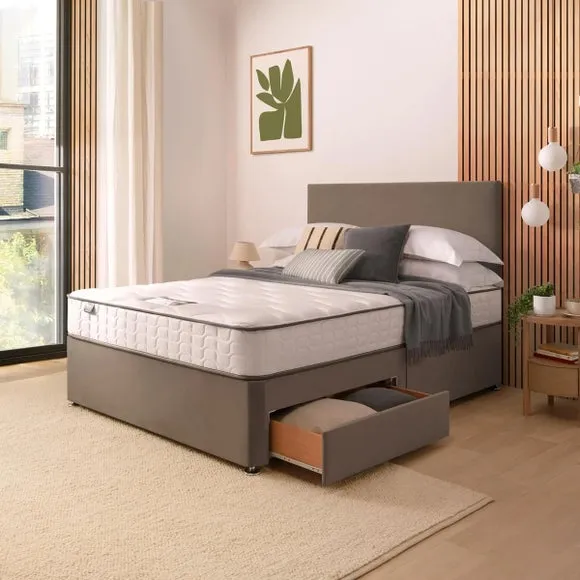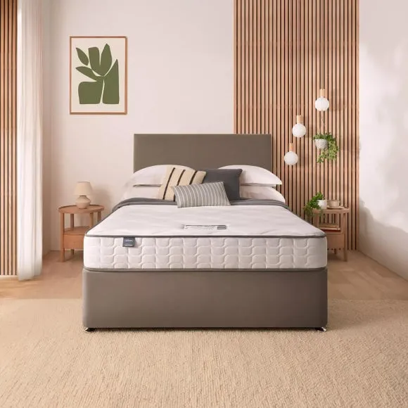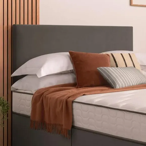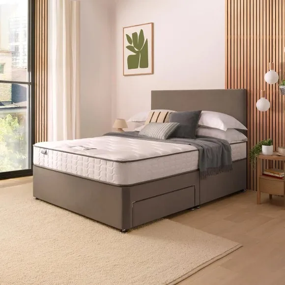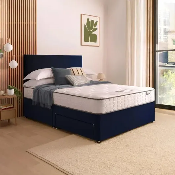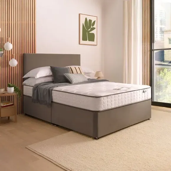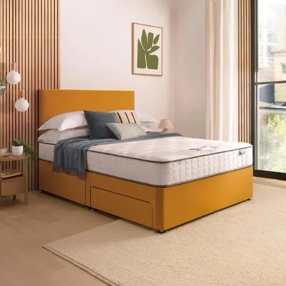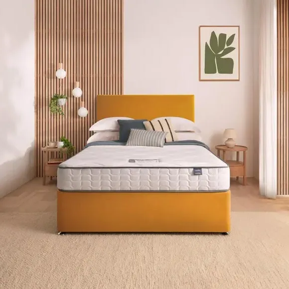 * Divan Bed* Bed Mounted Headboard* Includes Mattress* Trendy and Soft Velvet Upholstery This all-inclusive divan set seamlessly marries functionality and elegance, featuring a refined headboard, and an extraordinary 800 pocket mattress. Silentnight's cutting-edge Mirapocket technology takes centre stage, providing 800 individual pocket springs for unparalleled comfort, support, and pressure relief. The zoned Mirapocket support system ensures even weight distribution, promoting effortless movement and enhancing spinal alignment, while the edge-to-edge support creates a haven for an undisturbed night's sleep. The mattress's responsive pocket springs adapt to your body weight, delivering a luxurious blend of comfort and personalised support. Plump filling layers and a sumptuously soft knitted mattress cover add to the lavishness, with a hypoallergenic finish for peace of mind. The medium-firm comfort rating caters to those who transition between back and side sleeping positions. Please note, the mattress binding colour may differ slightly from image. This does not affect the quality or use of the final product.