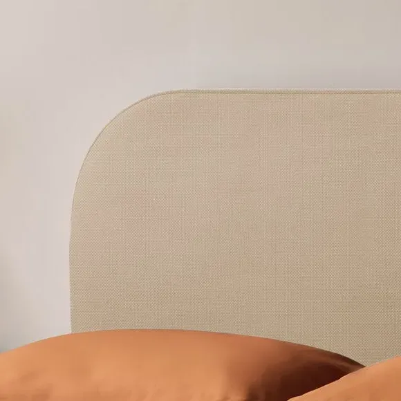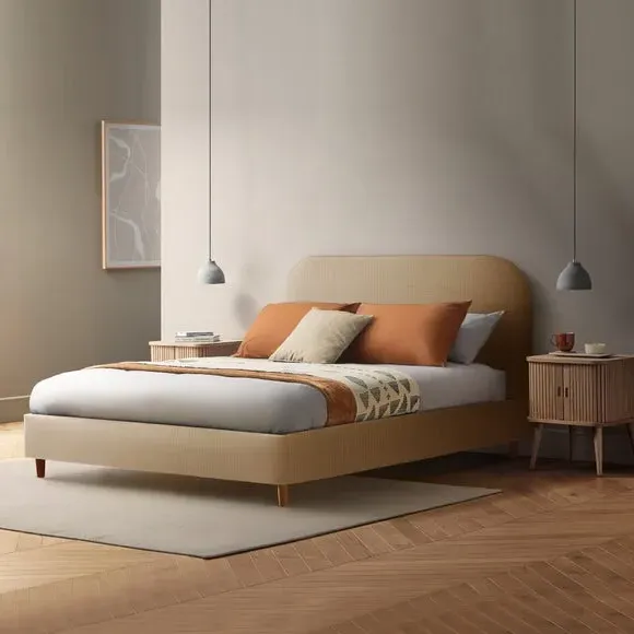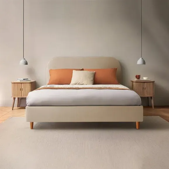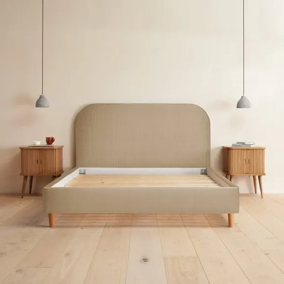 * Upholstered Headboard* Slatted Base* Low Foot End Handcrafted in the UK, this bed frame features a minimalistic design with a rounded padded headboard and wooden legs, offering both style and comfort. Upholstered in premium woven fabric, available in a range of colours, it effortlessly complements any decor. The adjustable side rails allow for accommodation of deep or shallow mattresses, while the wooden slatted base provides excellent support and airflow.