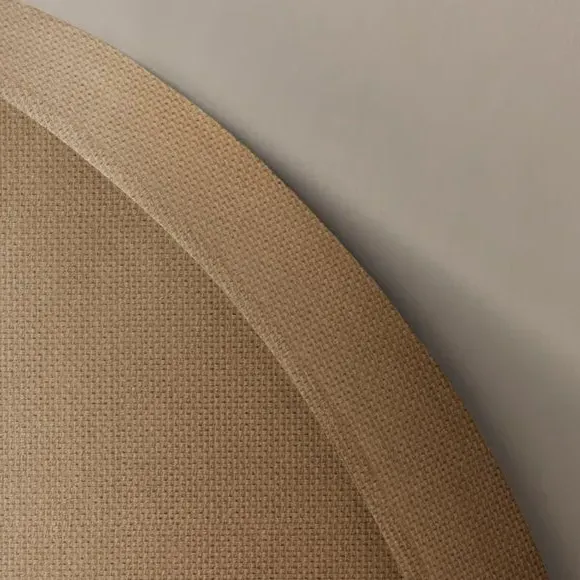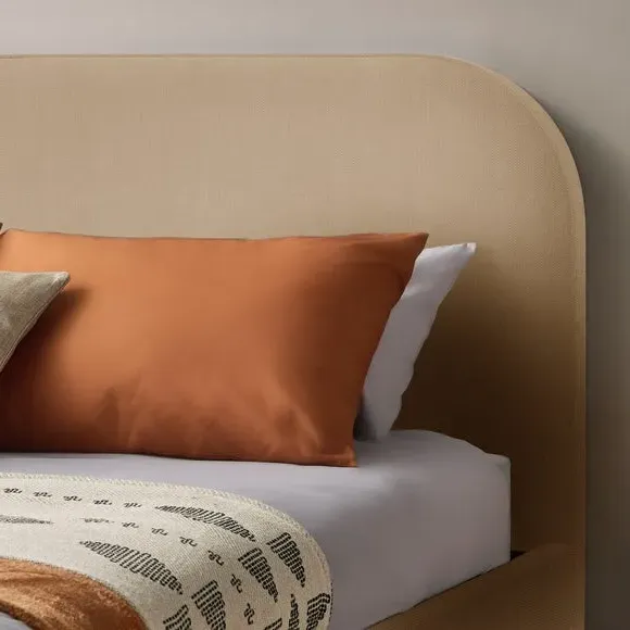 The bed frame combines minimalistic design with comfort through its rounded padded headboard and wooden legs. Upholstered in woven fabric, it features adjustable side rails that accommodate both deep and shallow mattresses. The wooden slatted base provides excellent support and airflow, while the low foot end maintains the clean aesthetic.