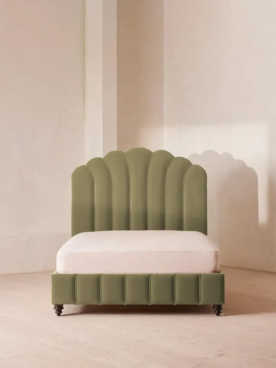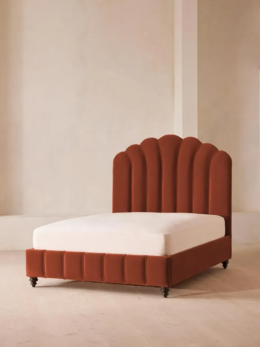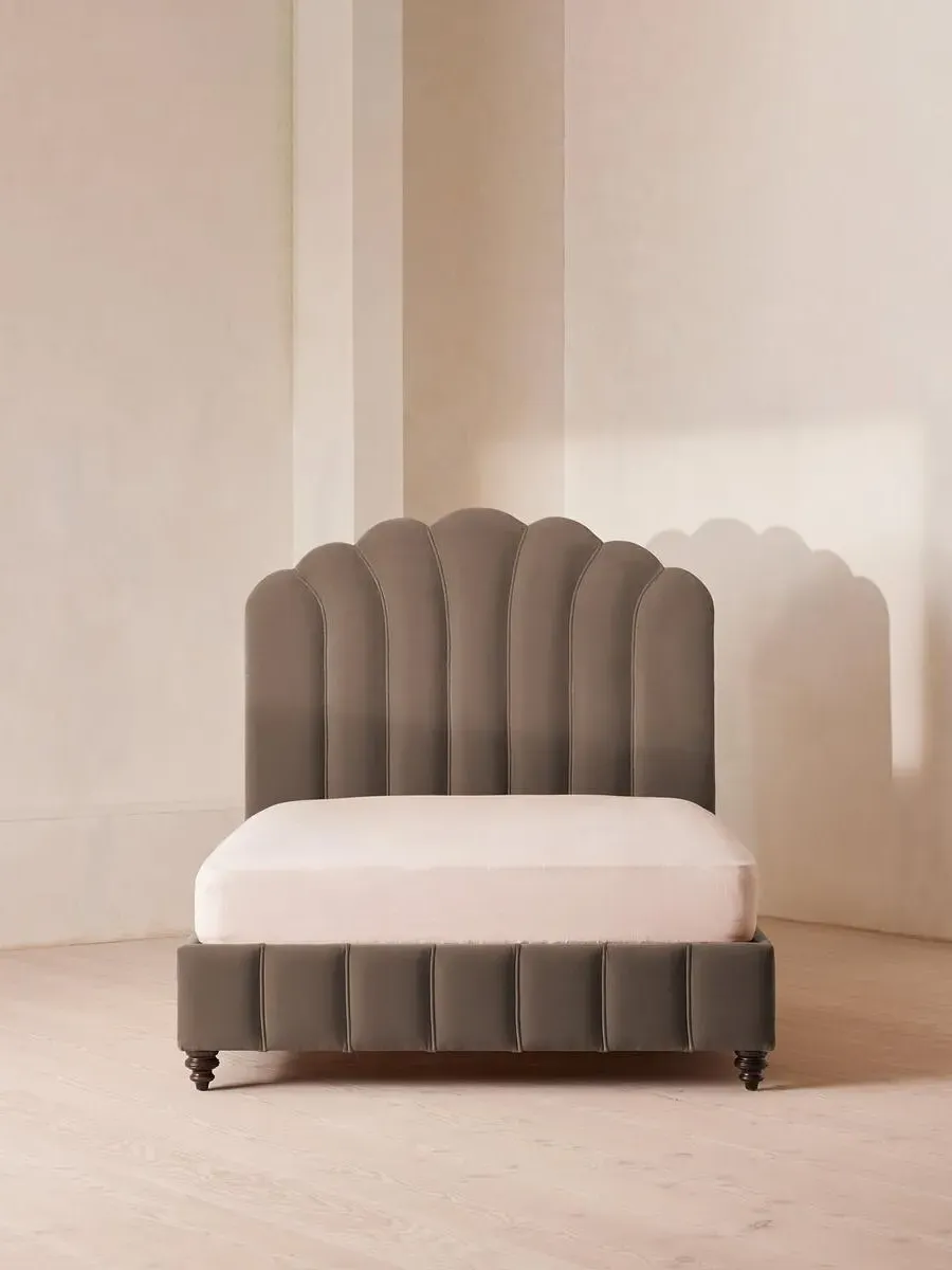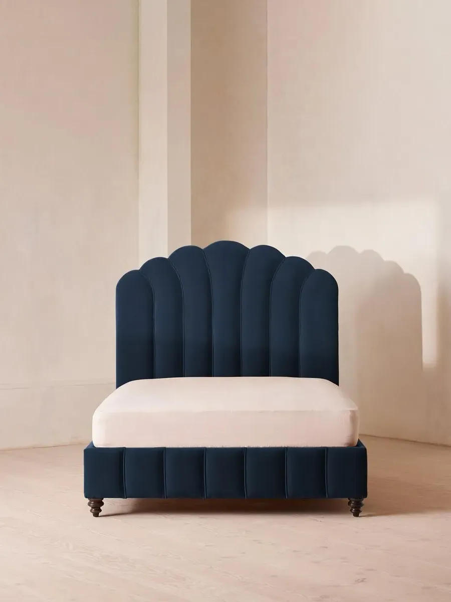 A fanned headrest and low profile wrapped in velvet upholstery are hand-crafted in the UK. Takings its inspiration from the cosy bedrooms of Kettner's in London, the Manette bed frame has a fanned headrest designed as a focal point for your room. Resting on turned hardwood feet, its low profile is handmade by skilled craftspeople, fully upholstered in velvet that comes in our full made-to-order palette.